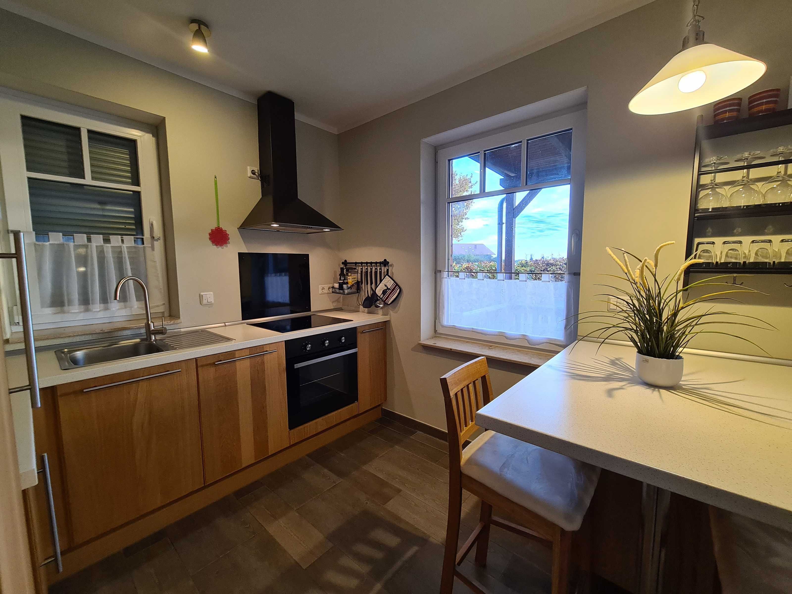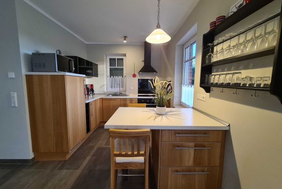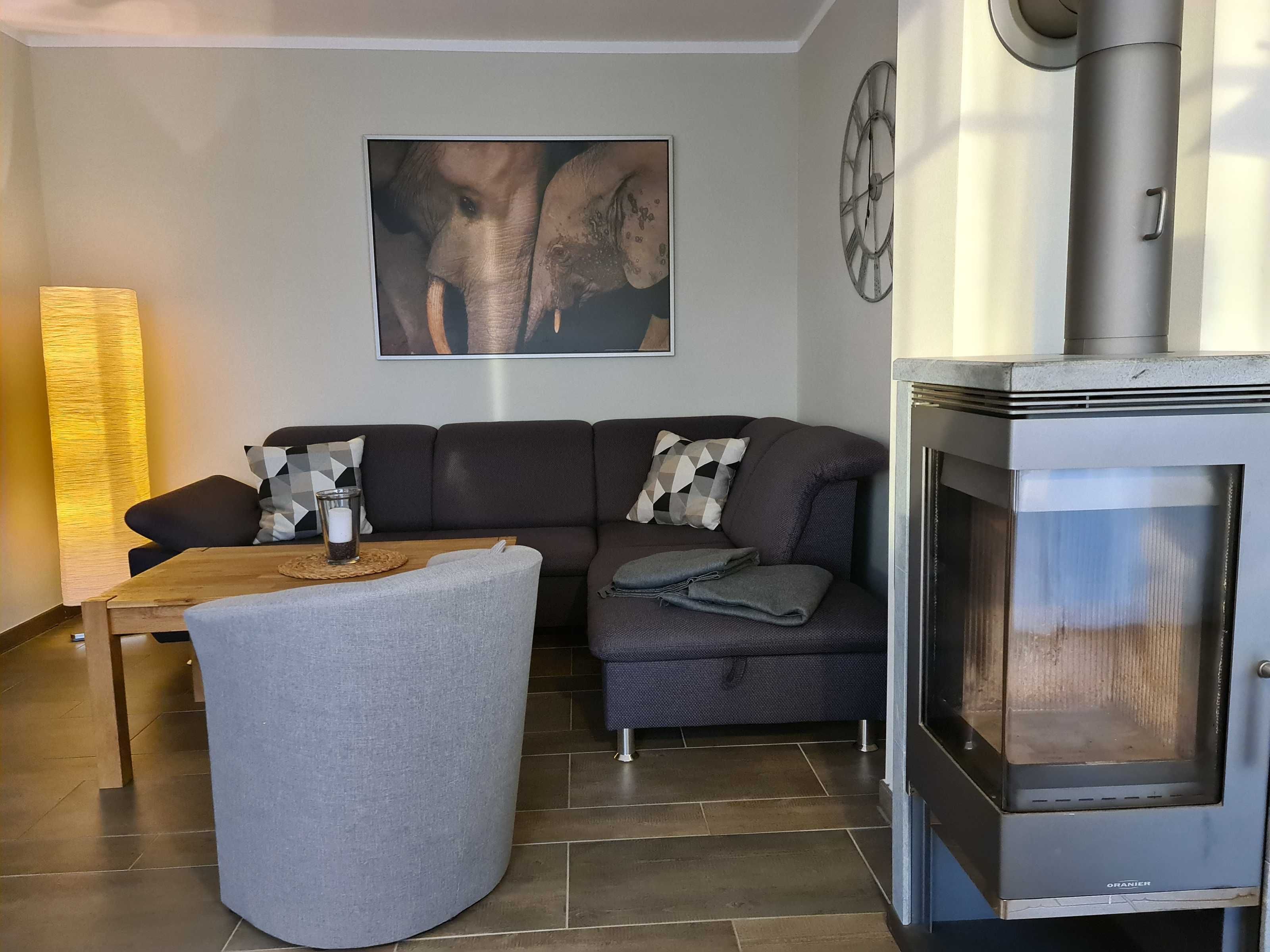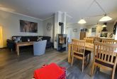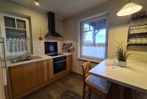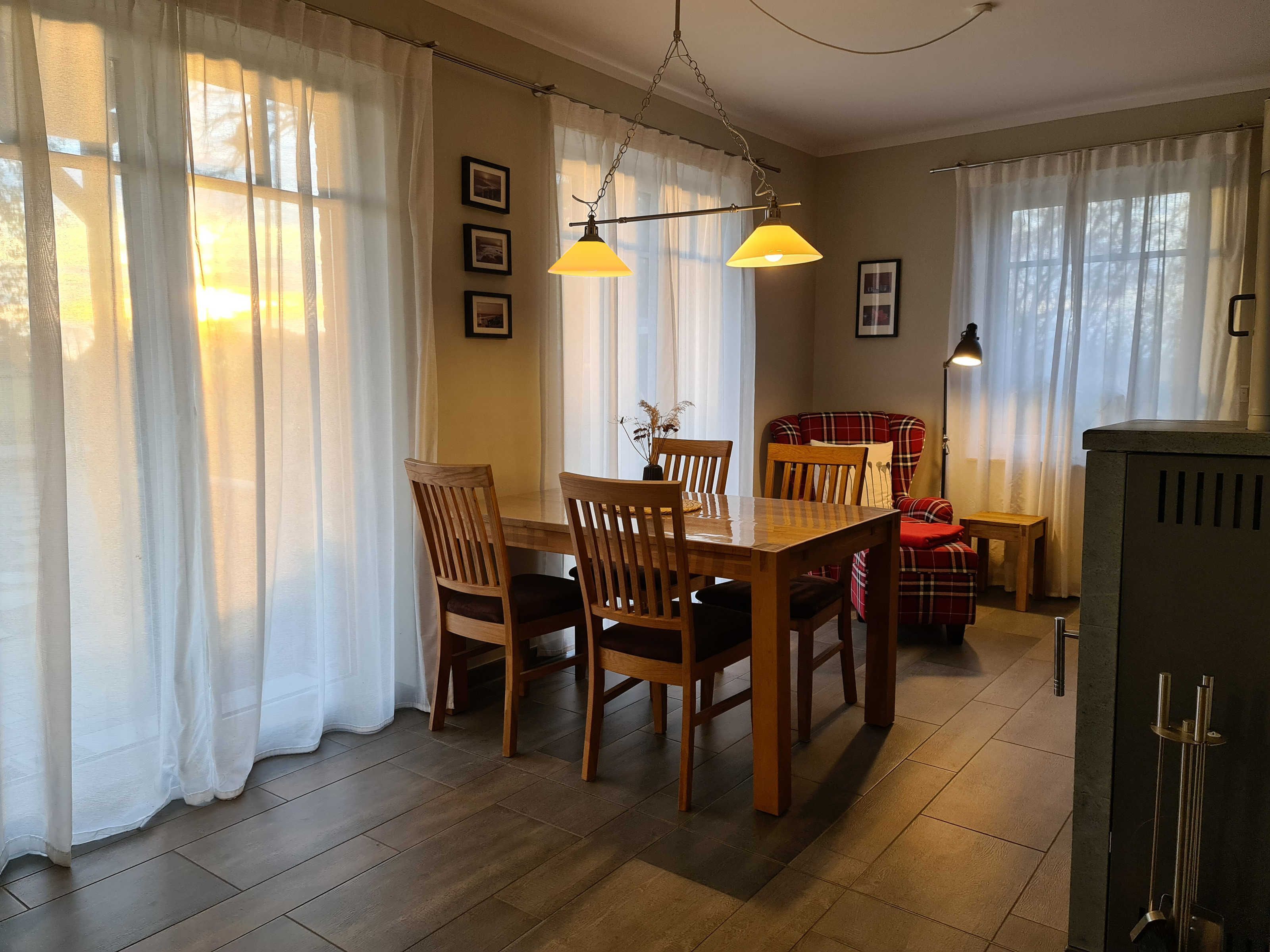 Wohnraum mit Kamin, Esstisch, offene Küche (Mikrowelle, Geschirrspüler, 4-Platten-Herd, Backofen) sowie Terrassenzugang. Ebenfalls im EG befindet sich ein Duschbad/ WC und Waschmaschine (kostenlos). Im Wohnbereich ist die Couch als Schlafgelegenheit für 1 Person nutzbar.