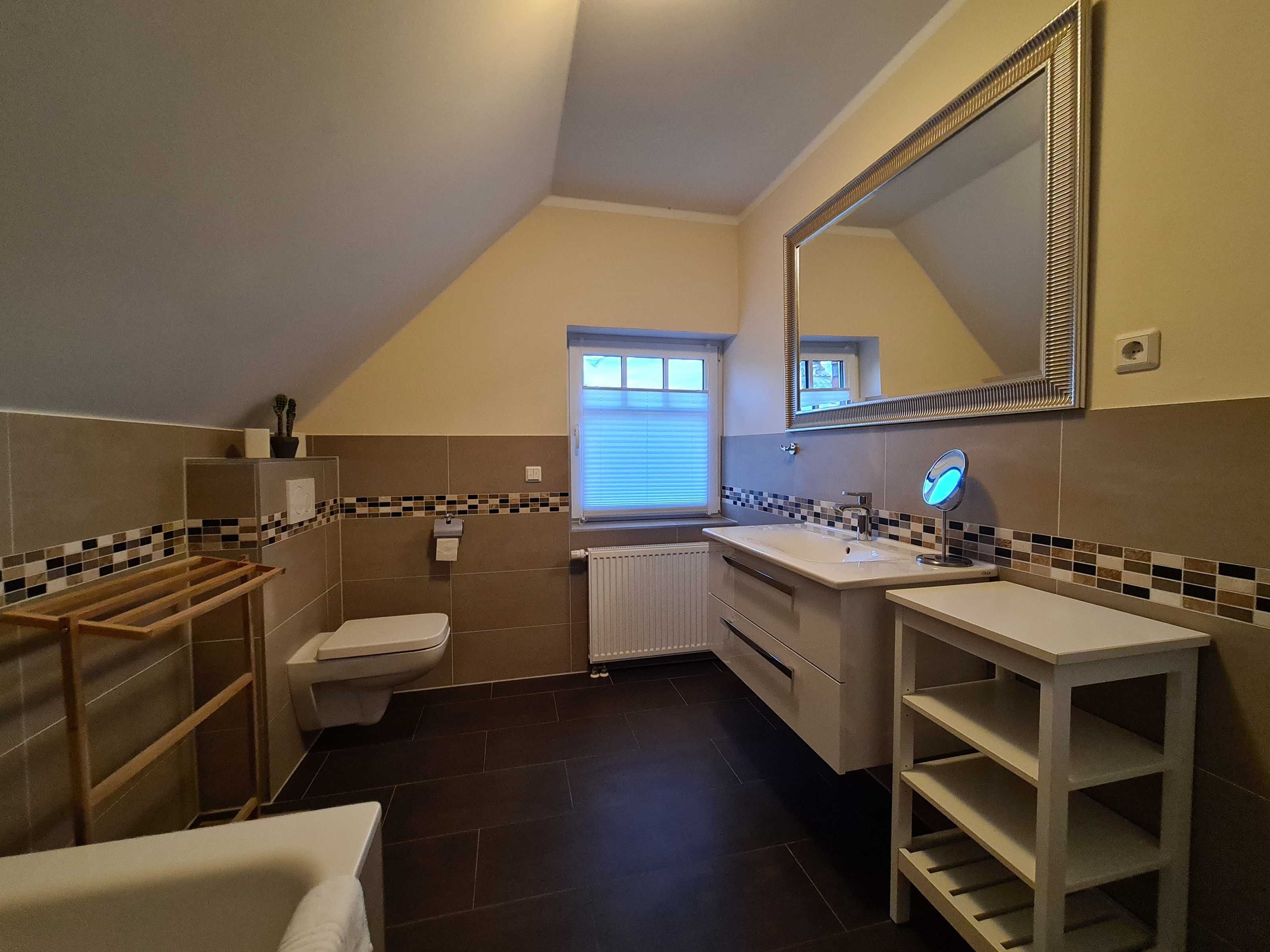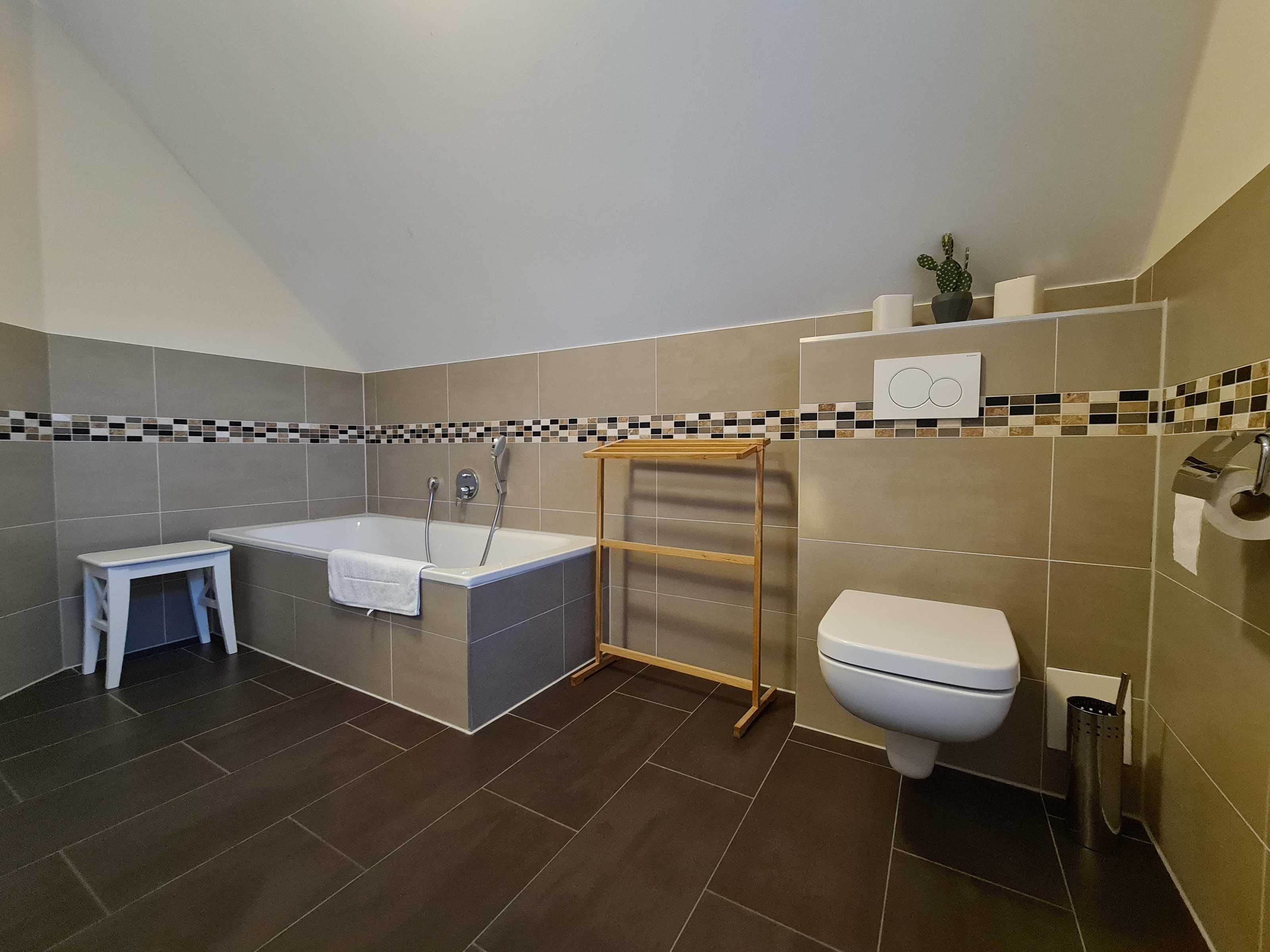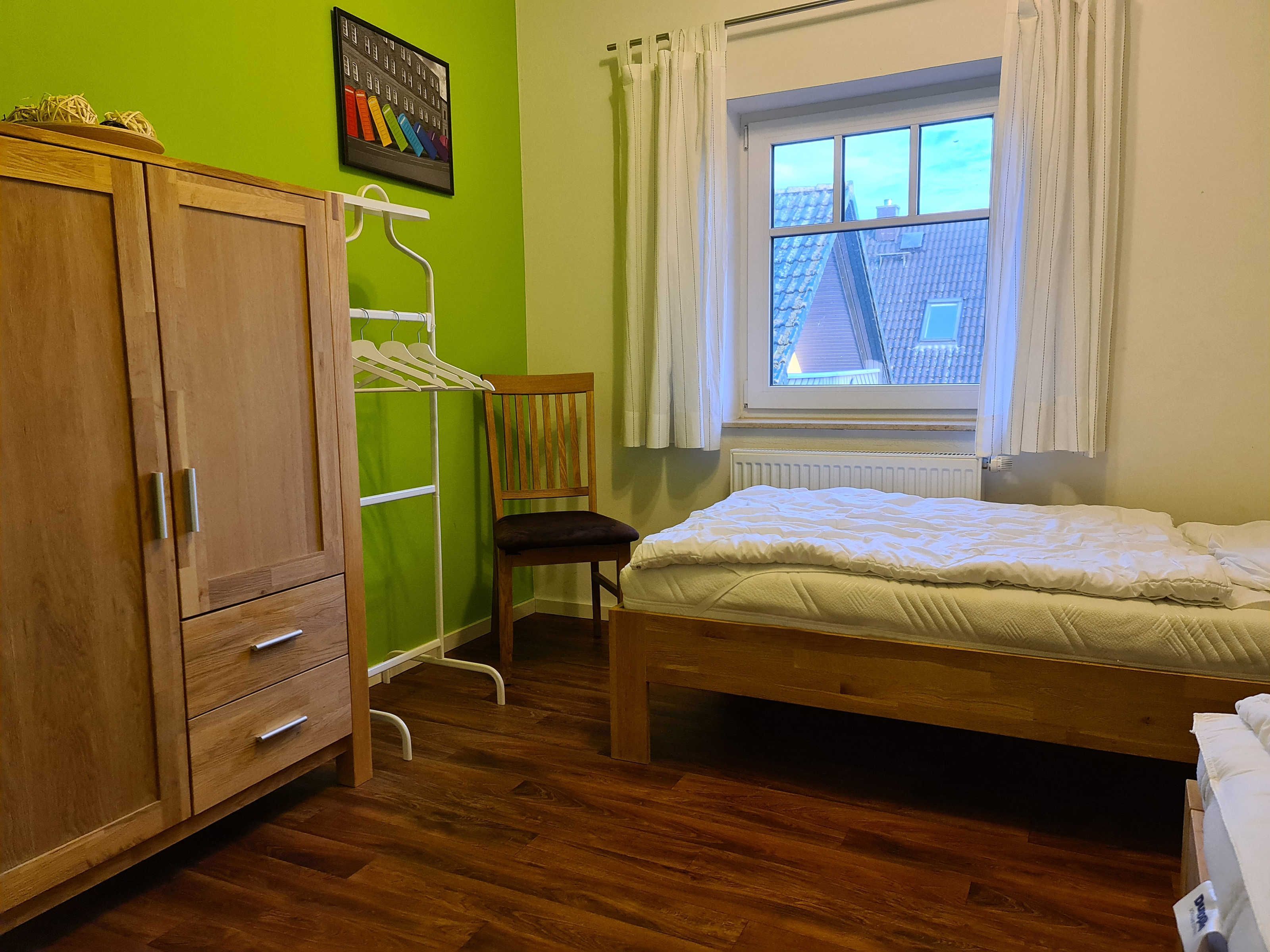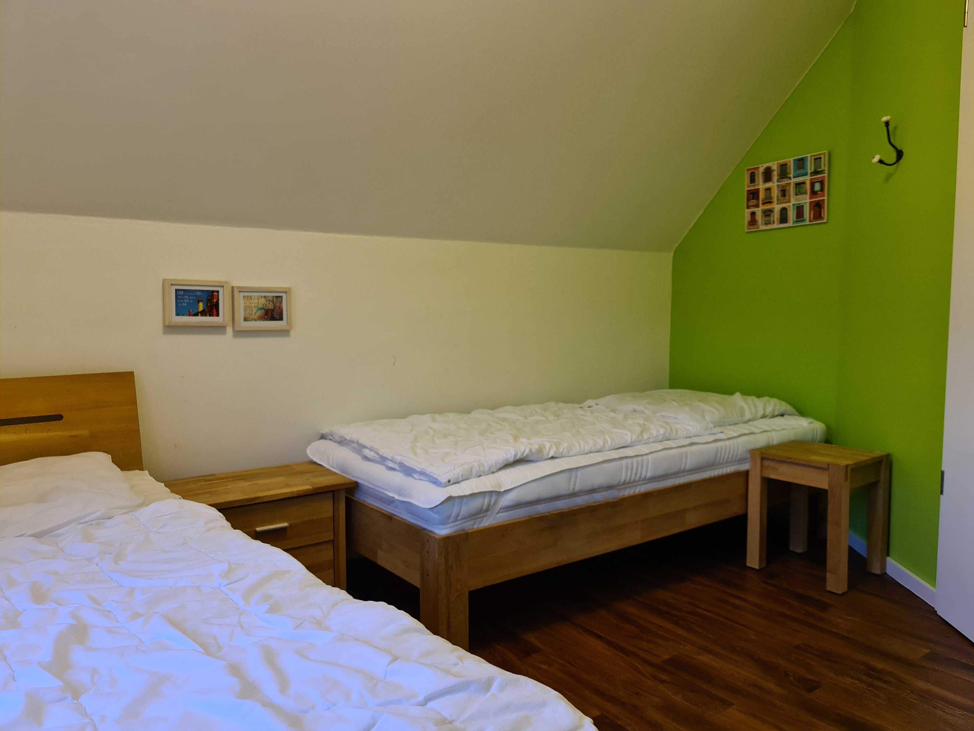Obergeschoss: 1 Schlafraum mit Doppelbett, 1 Schlafraum mit zwei Einzelbetten (auch zusammenstellbar), Bad/WC mit Badewanne.