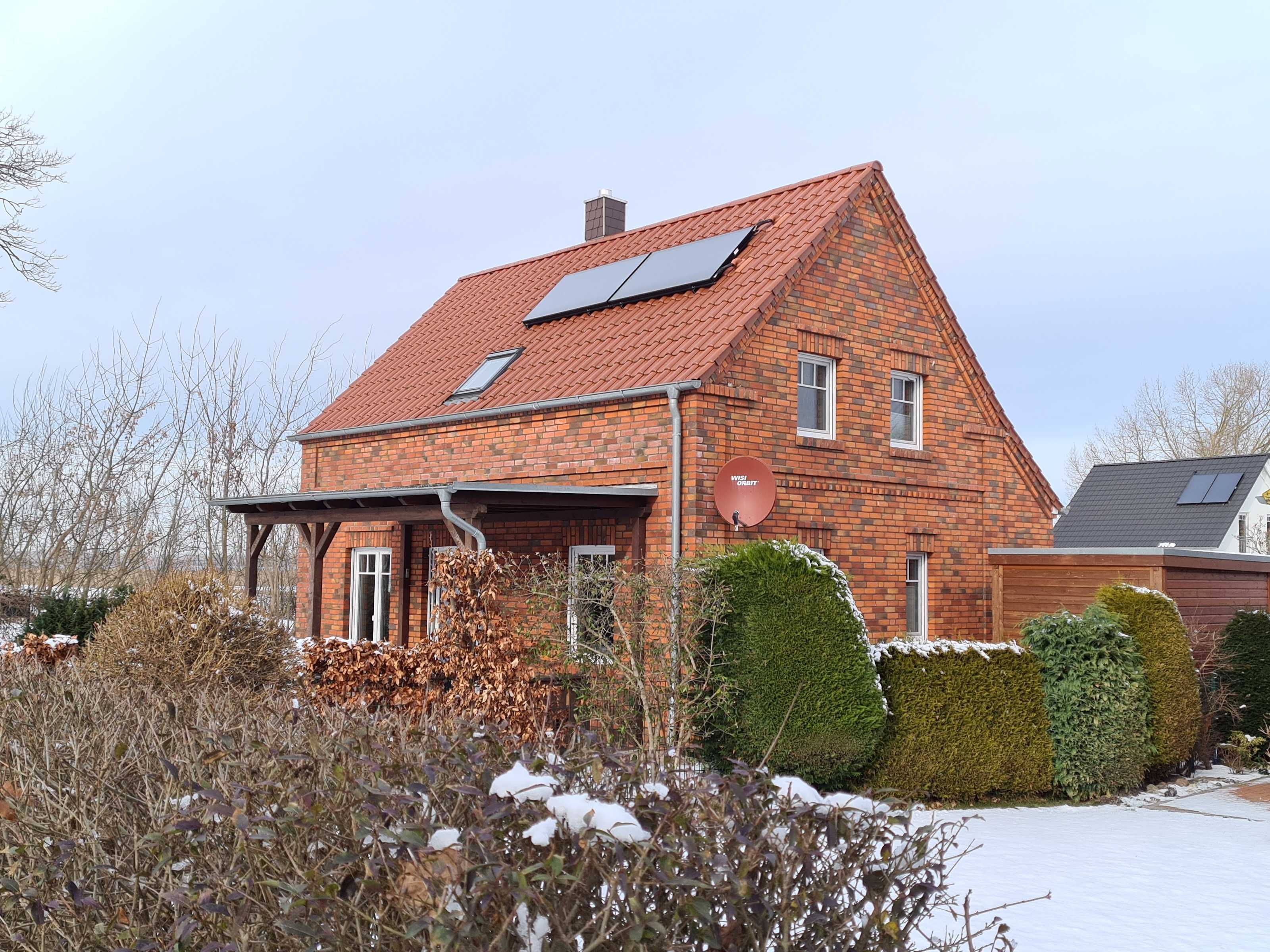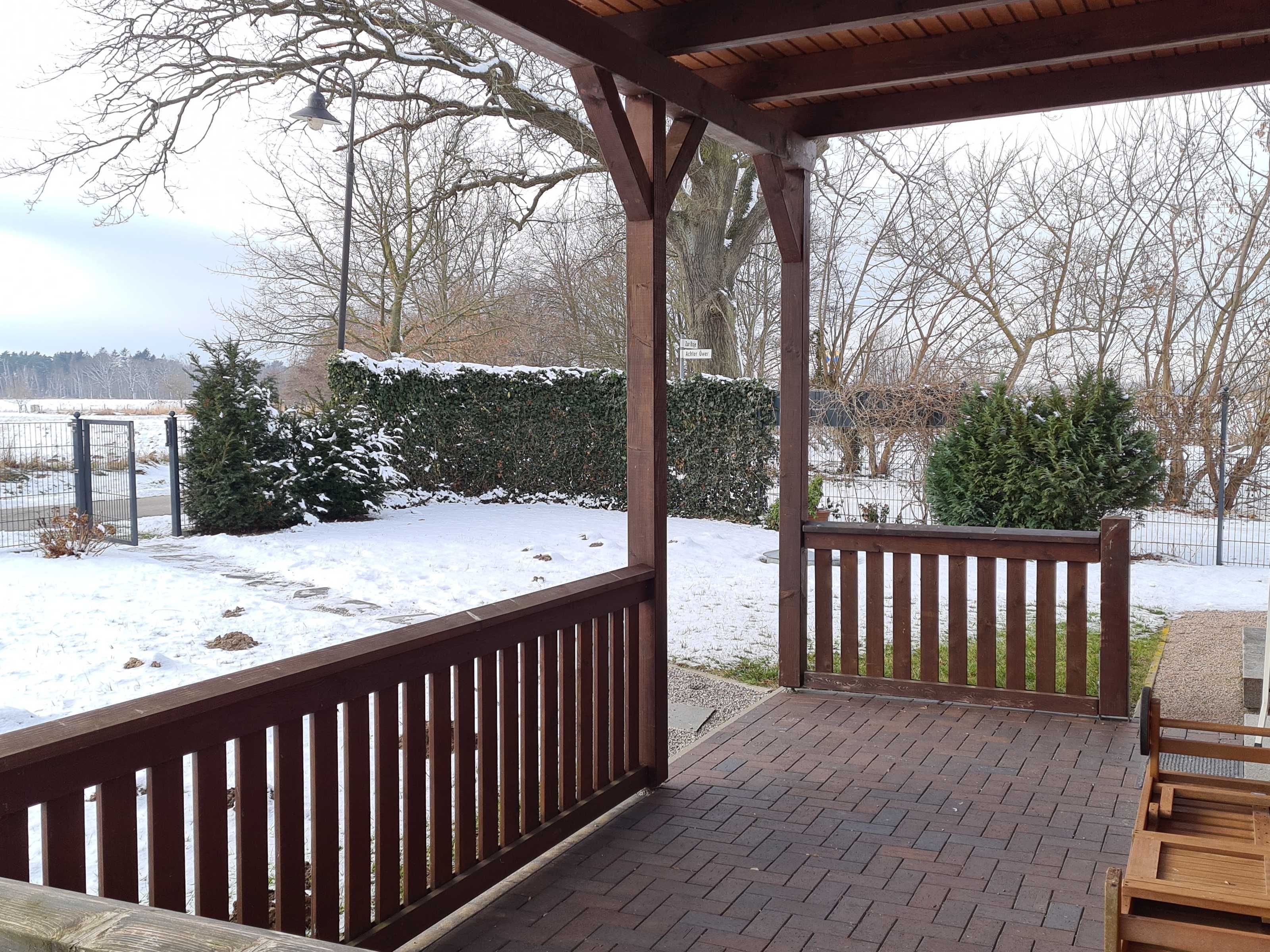 3-Raum-Ferienhaus (90m²; für max. 5 Personen), 2 Bäder, Süd-West-Terrasse mit Fernblick auf die Salzwiesen am Haff. Überdachte Terrasse mit Gartenmöbel. Abschließbarer Unterstellplatz für eigene Fahrräder oder Surfbretter. 2 PKW-Stellplätze hintereinander auf abgeschlossenem Grundstück.