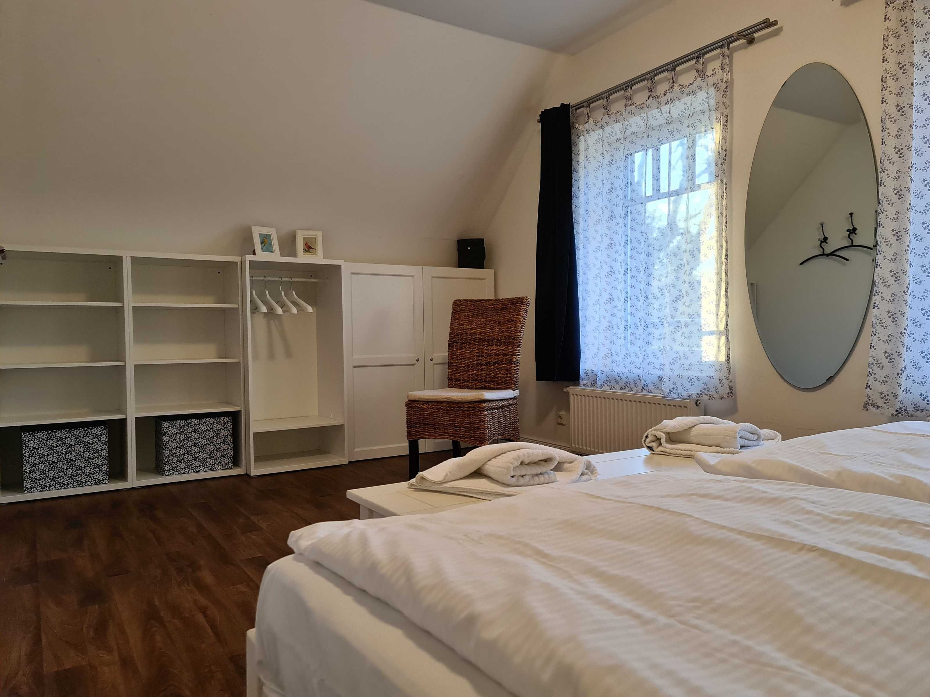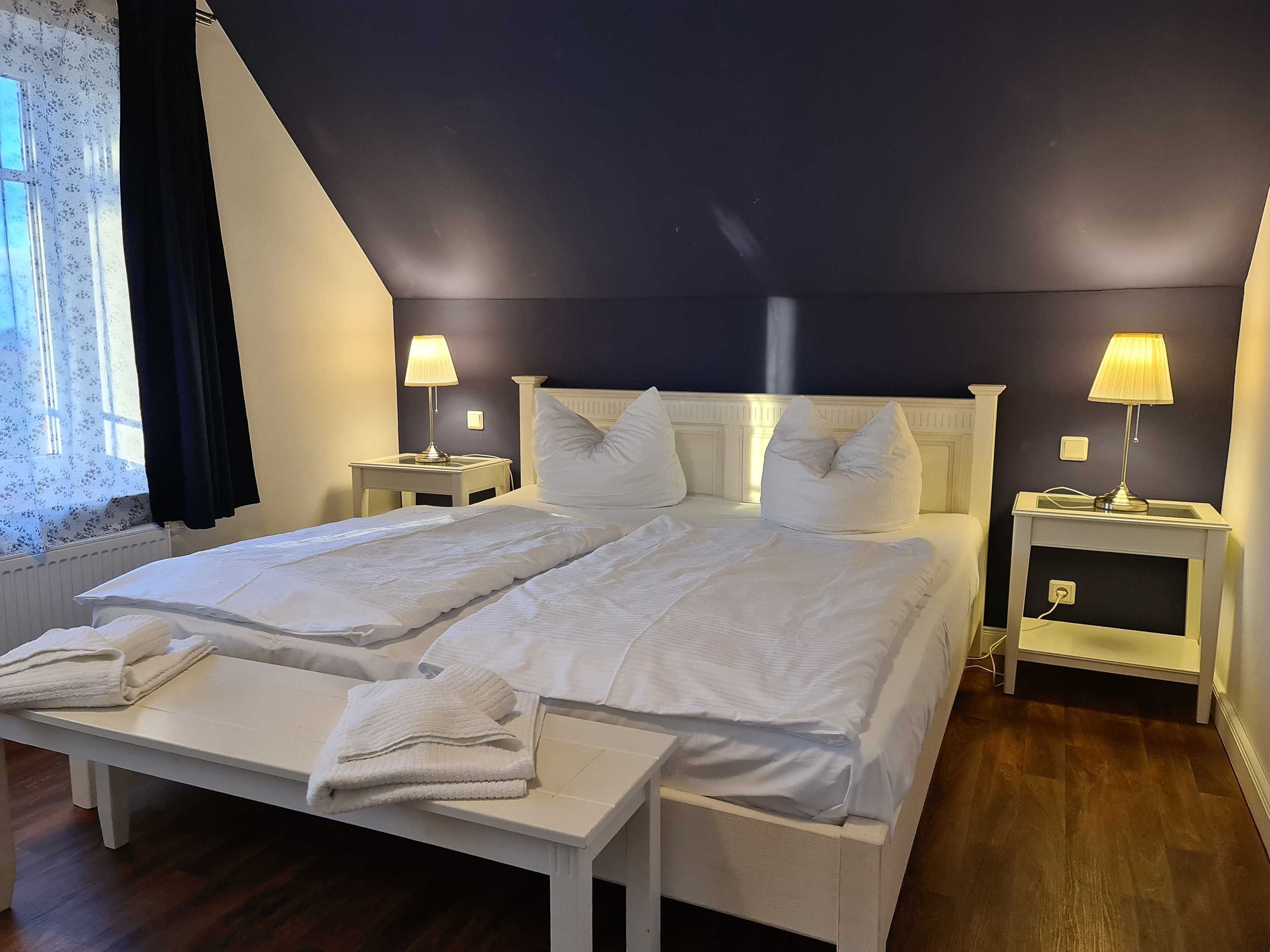 2 Schlafräume: Schlafraum Nr. 1 mit Doppelbett (1,80 x 2 m mit getrennten Matratzen, verstellbare Lattenroste), Schlafraum Nr. 2 mit zwei Einzelbetten (auch zusammenstellbar), Bad mit Badewanne und WC.