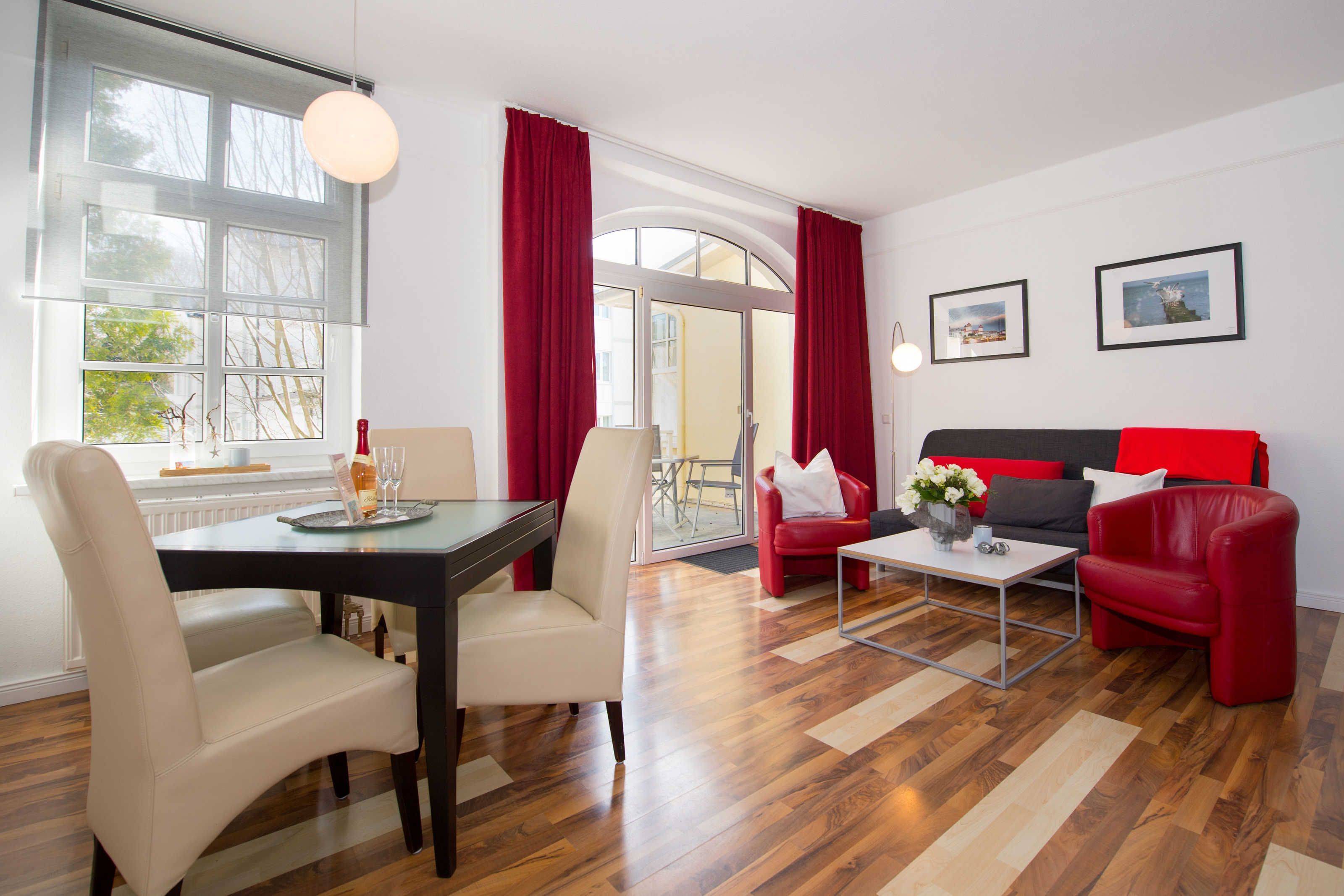Die Ferienwohnung befindet sich im 1. Obergeschoss eines Appartementhauses und ist 65 qm groß. Sie wurde modern und komfortabel eingerichtet und bietet maximal 4 Erwachsenen Raum für einen erholsamen Urlaub. Über den Flur mit Garderobe gelangen Sie direkt in den Wohnbereich. Im hell und stilvoll eingerichteten Wohnraum stehen eine Schlafcouch, Sessel und Tisch sowie Schränke, Radio und ein moderner Flachbild-TV. In der separaten kleinen Küche stehen Ihnen ein Herd mit Cerankochfeld, Spülmaschine, Mikrowelle, Kühlschrank, Toaster, Kaffeemaschine, ein externer Backofen sowie ein Wasserkocher zur Verfügung.