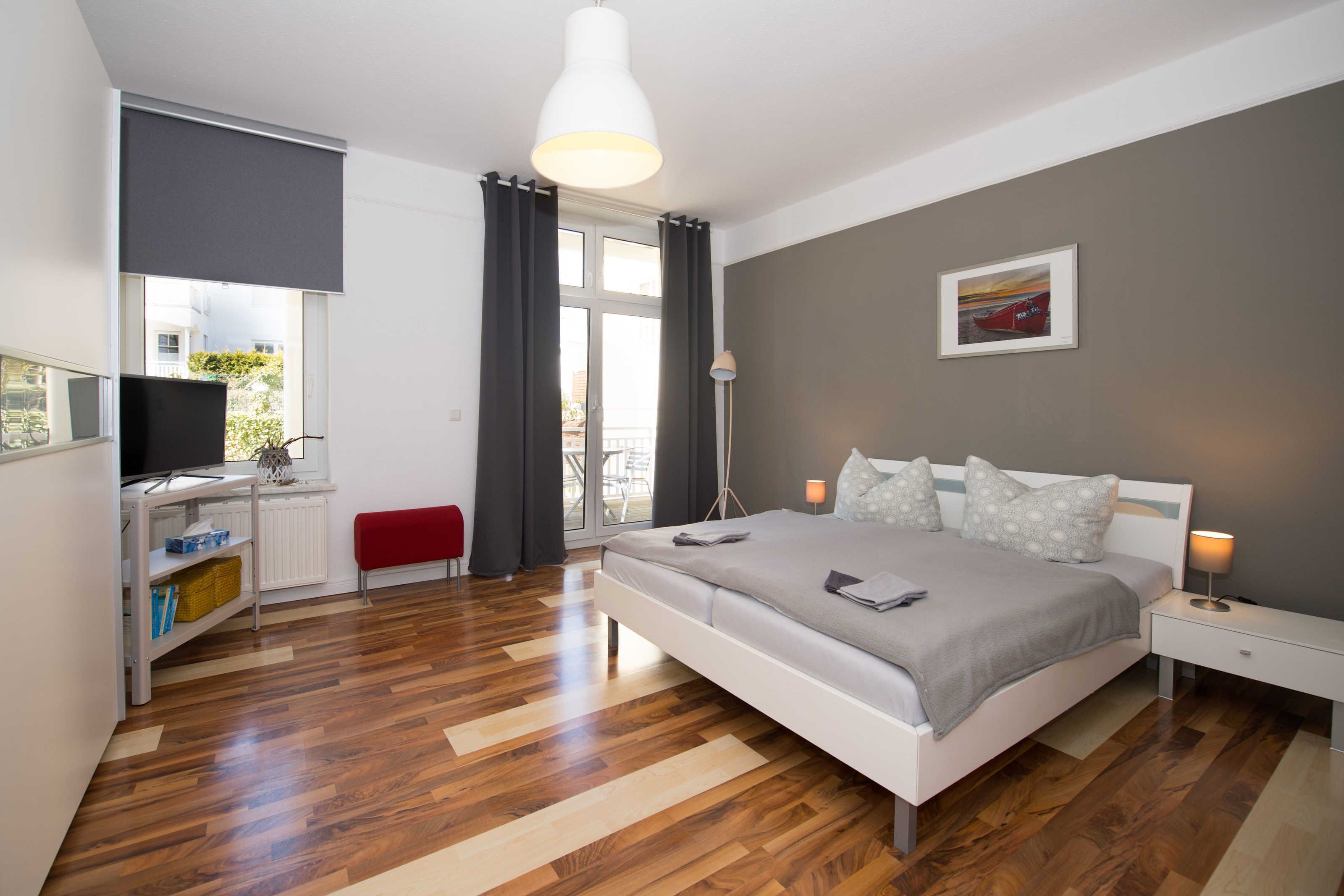 Im großen ruhig gelegenen Schlafzimmer erwarten Sie ein bequemes Doppelbett mit Nachttischen und Leselampen sowie ein Kleiderschrank und ein Flachbild-TV. Vom Schlaf- und vom Wohnraum aus gelangt man auf den schönen Balkon mit Sitzgelegenheiten.