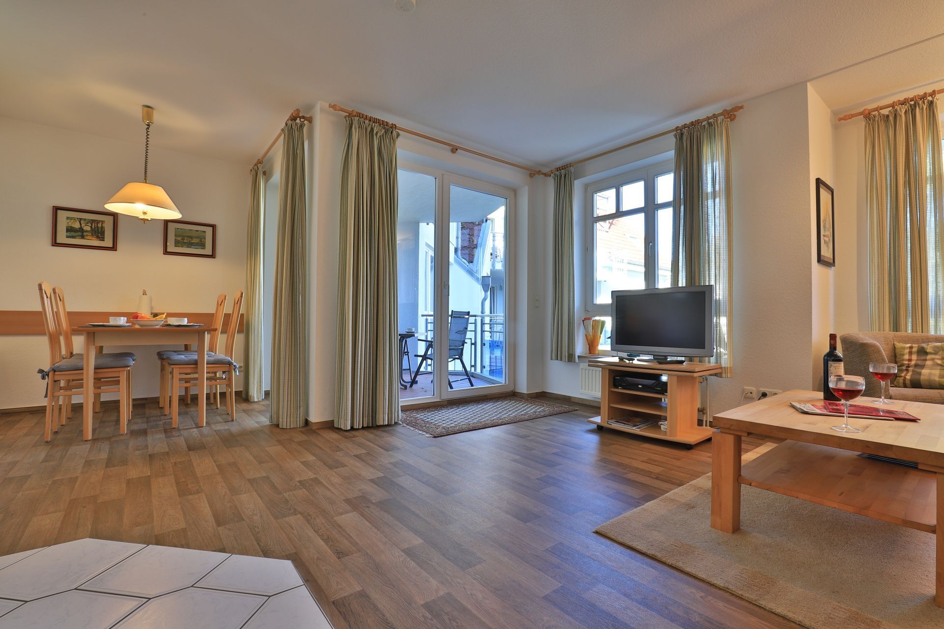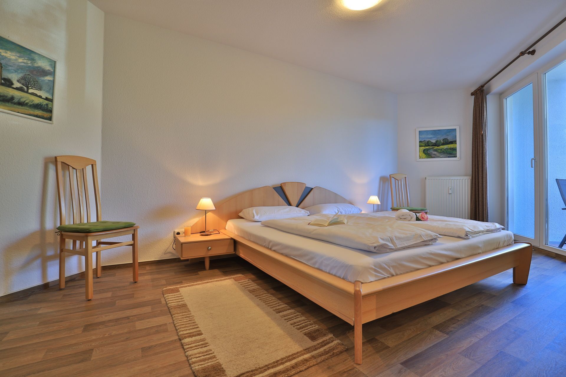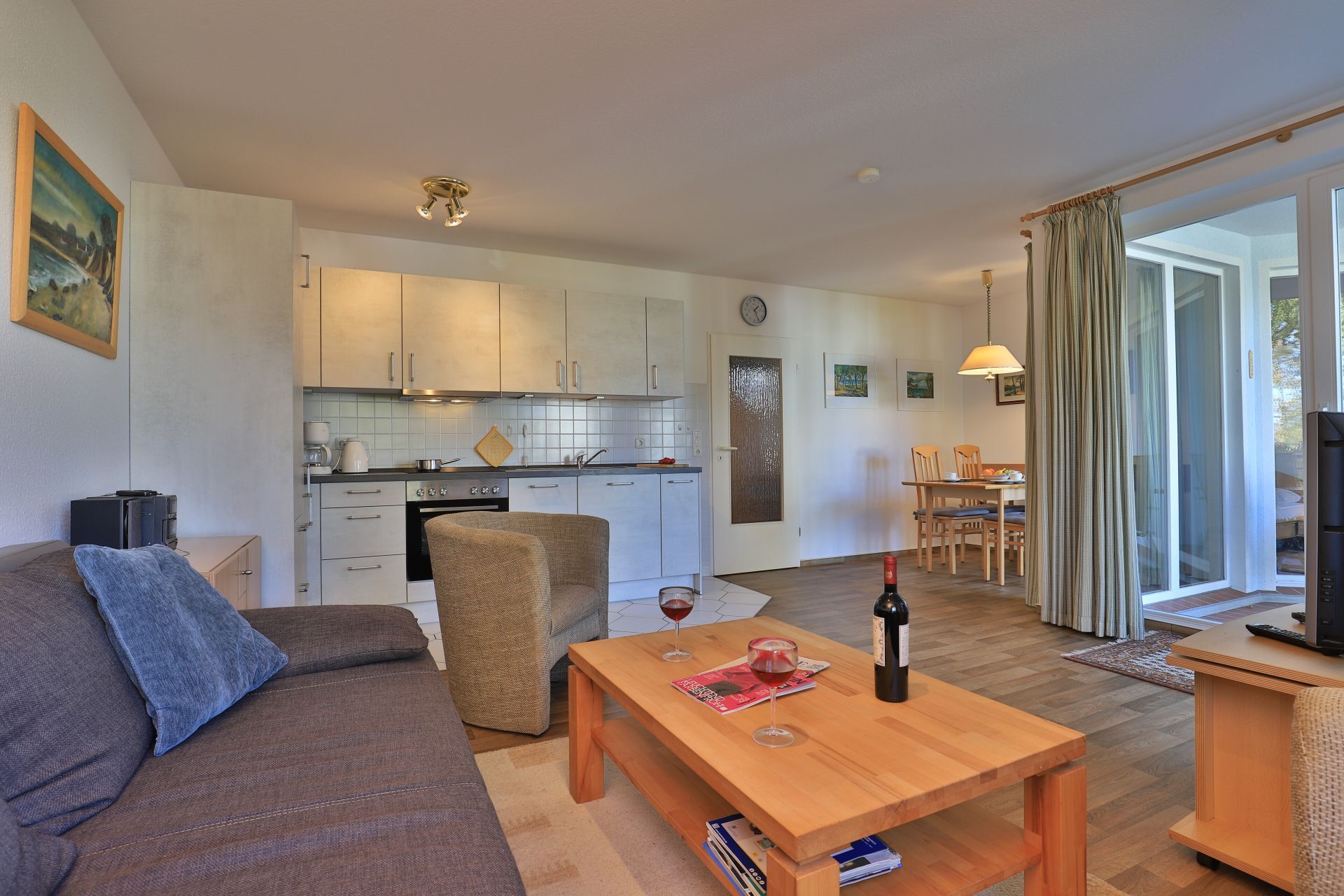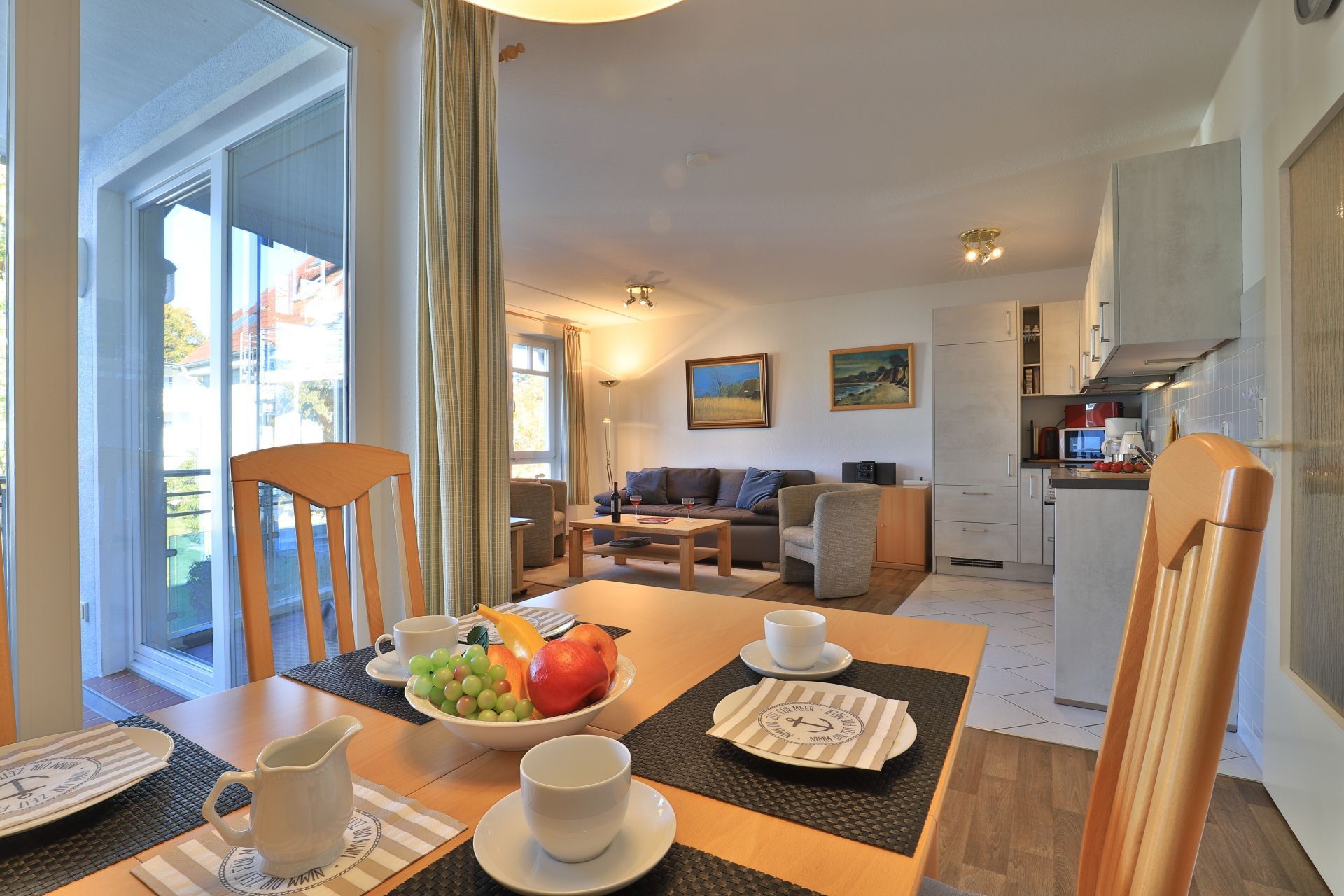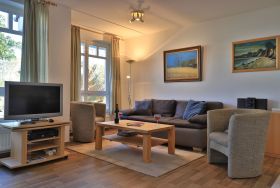 Die 2-Zimmer Ferienwohnung ?Likedeeler 24? mit Balkon, befindet sich im 1. Obergeschoss und besitzt eine großzügige Wohnfläche von 60qm. Eine Belegung mit bis zu 2 Personen möglich. Das mit drei Sternen klassifizierte Appartement ist insgesamt sehr komfortabel eingerichtet. Im Wohn-/Essbereich empfängt Sie eine bequeme Sofagarnitur ? erweiterbar als weitere Schlafgelegenheit- mit zwei Sesseln sowie ein Esstisch mit vier Sitzplätzen. Für technische Unterhaltung können Sie den Fernseher und die Musikanlage nutzen zudem steht WLAN kostenfrei bereit. Die in den Wohnbereich integrierte und bestens ausgestattete Wohnküche ist offen integriert und ermöglicht die Eigenversorgung mit: Ceranherd, Backofen, Mikrowelle, Dunstabzug, Kühlschrank mit integr. Gefrierfach, Geschirrspüler, Kaffeemaschine, Wasserkocher, Toaster usw. Ihre Speisen nehmen Sie am Esstisch zu sich, oder während der wärmeren Jahreszeit auf dem saisonal möblierten Balkon in Nord-Ost Ausrichtung. Ihre Nächte verbringen Sie in einem separaten, sehr behaglichen Schlafzimmer mit Doppelbett und großem Kleiderschrank. Idealerweise besitzt das Schlafzimmer einen zweiten Balkonzugang. Das hell geflieste Duschbad ist mit Waschtisch, Föhn, WC ausgestattet. Allen Hausgästen stehen eine Waschmaschine und Wäschetrockner gegen Gebühr im Untergeschoss der Ferienanlage zur Verfügung. Ihr Fahrzeug parken Sie in der hauseigenen Tiefgarage auf einem fest zugeordneten Stellplatz. Mit dem Fahrstuhl gelangen Sie zu den Wohnungsetagen.