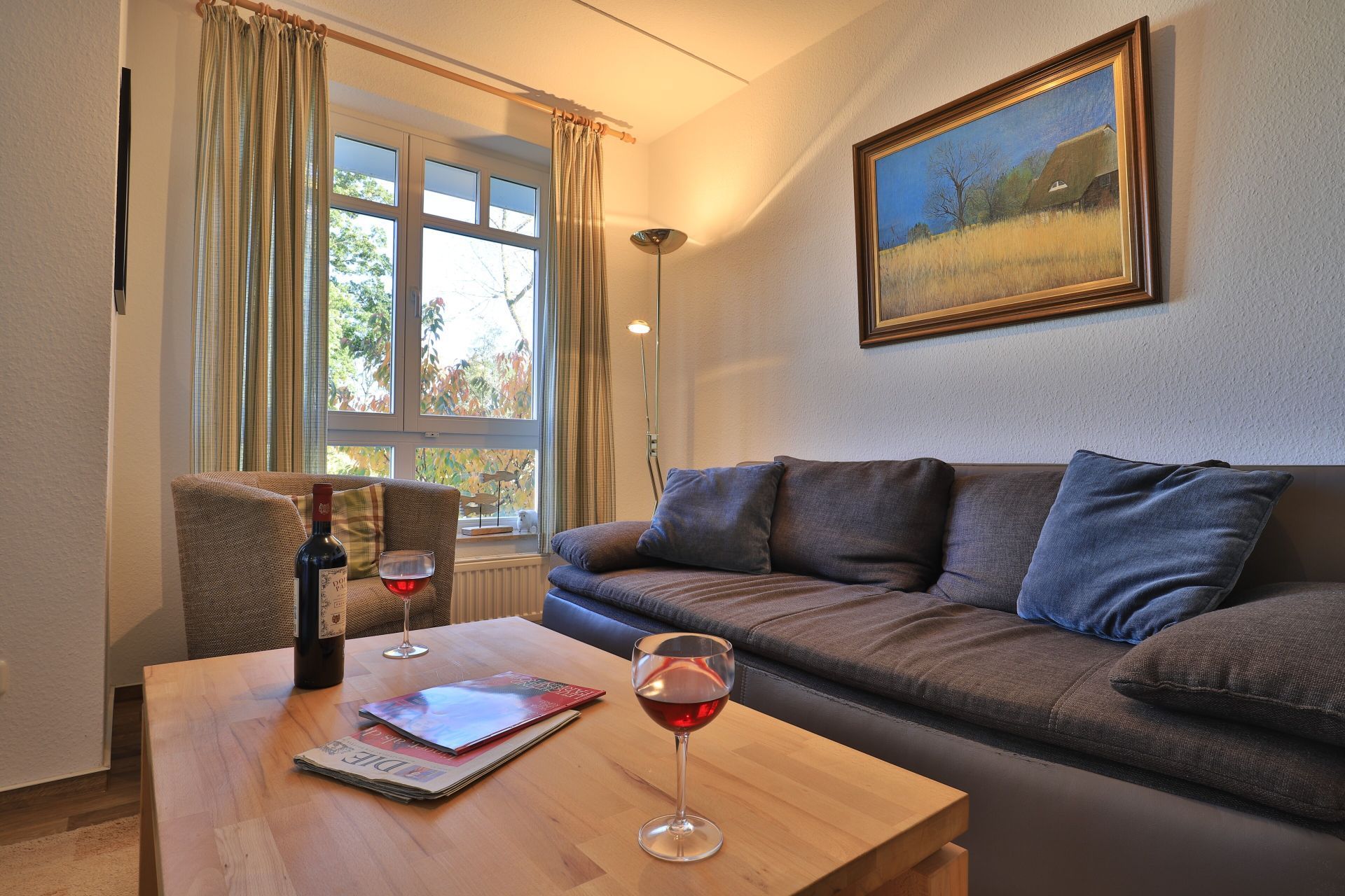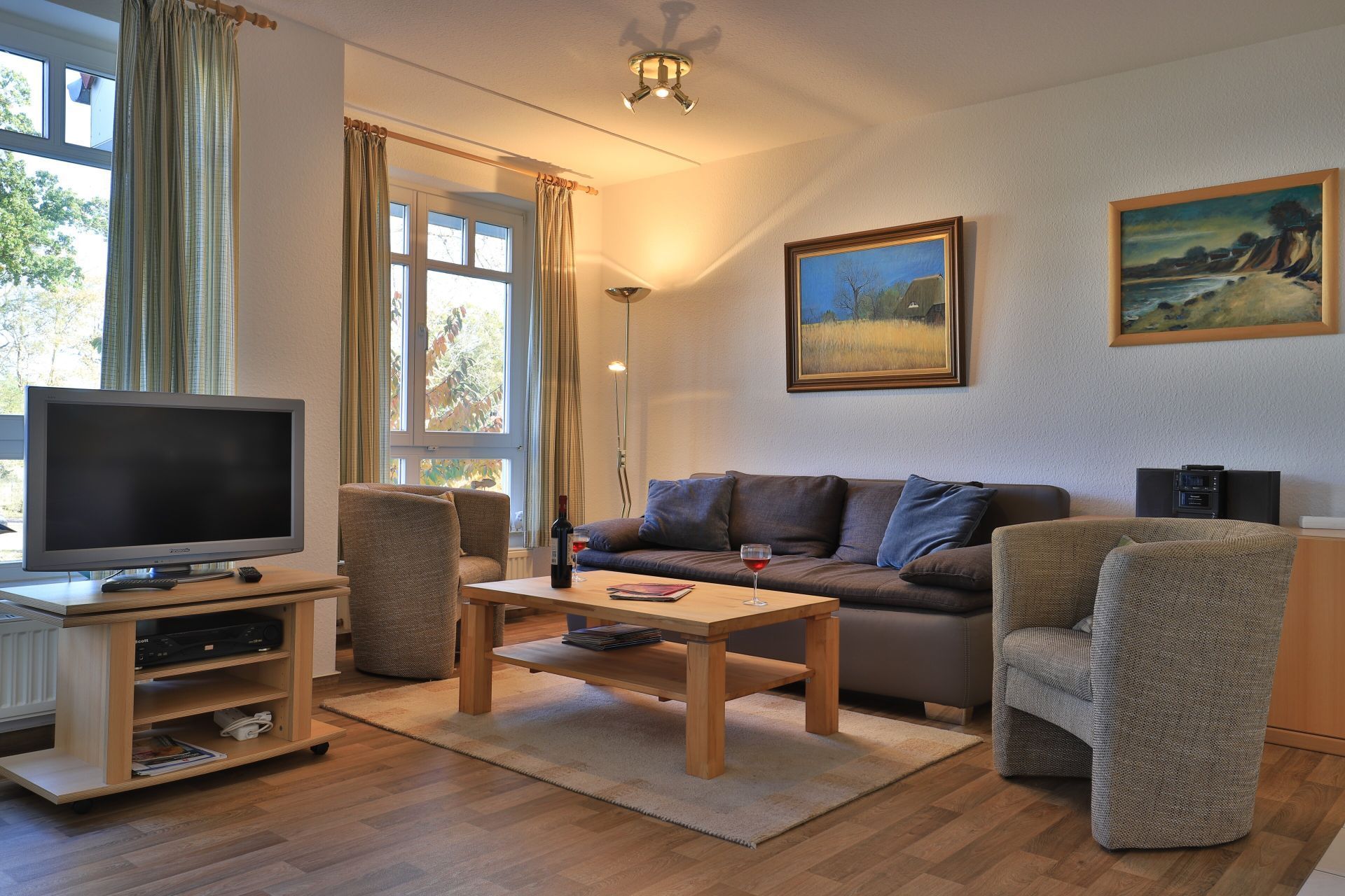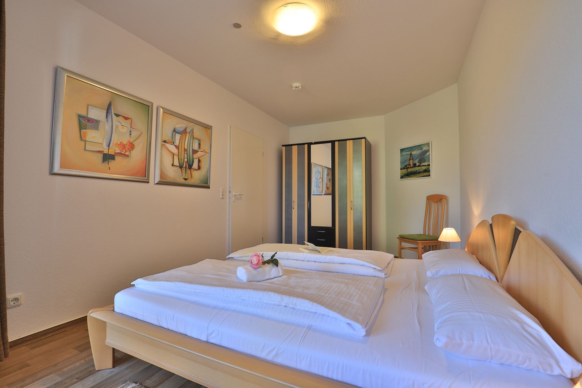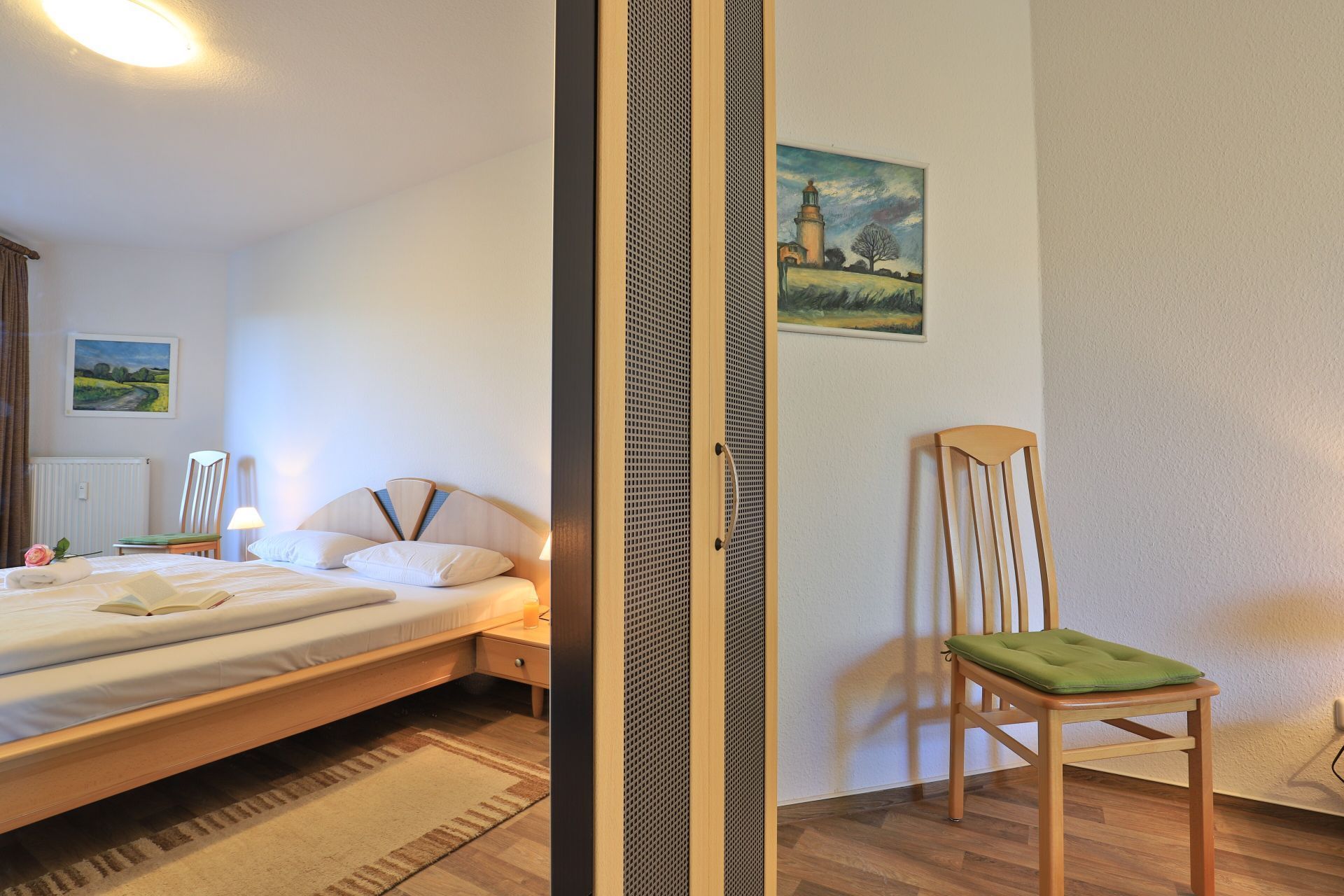 Die 2-Zimmer Ferienwohnung ?Likedeeler 24? mit Balkon, befindet sich im 1. Obergeschoss und besitzt eine großzügige Wohnfläche von 60qm. Eine Belegung mit bis zu 2 Personen möglich. Das mit drei Sternen klassifizierte Appartement ist insgesamt sehr komfortabel eingerichtet. Im Wohn-/Essbereich empfängt Sie eine bequeme Sofagarnitur ? erweiterbar als weitere Schlafgelegenheit- mit zwei Sesseln sowie ein Esstisch mit vier Sitzplätzen. Für technische Unterhaltung können Sie den Fernseher und die Musikanlage nutzen zudem steht WLAN kostenfrei bereit. Die in den Wohnbereich integrierte und bestens ausgestattete Wohnküche ist offen integriert und ermöglicht die Eigenversorgung mit: Ceranherd, Backofen, Mikrowelle, Dunstabzug, Kühlschrank mit integr. Gefrierfach, Geschirrspüler, Kaffeemaschine, Wasserkocher, Toaster usw. Ihre Speisen nehmen Sie am Esstisch zu sich, oder während der wärmeren Jahreszeit auf dem saisonal möblierten Balkon in Nord-Ost Ausrichtung. Ihre Nächte verbringen Sie in einem separaten, sehr behaglichen Schlafzimmer mit Doppelbett und großem Kleiderschrank. Idealerweise besitzt das Schlafzimmer einen zweiten Balkonzugang. Das hell geflieste Duschbad ist mit Waschtisch, Föhn, WC ausgestattet. Allen Hausgästen stehen eine Waschmaschine und Wäschetrockner gegen Gebühr im Untergeschoss der Ferienanlage zur Verfügung. Ihr Fahrzeug parken Sie in der hauseigenen Tiefgarage auf einem fest zugeordneten Stellplatz. Mit dem Fahrstuhl gelangen Sie zu den Wohnungsetagen.
