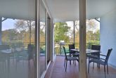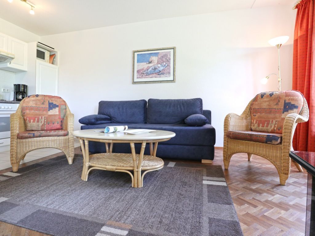 Die 2-Zimmer Ferienwohnung ?Likedeeler 25 ? mit Balkon, befindet sich im 1. Obergeschoss und besitzt eine Wohnfläche von 49qm. Eine Belegung mit bis zu 4 Personen möglich. Das Appartement ist insgesamt wohnlich möbliert. Der Wohn-/Essbereich empfängt Sie mit einem Sofa, welches als ausziehbare Couch einen zusätzlichen Schlafplatz ermöglicht. Zwei weitere Sitzgelegenheiten sowie ein Esstisch mit vier Sitzplätzen sind ebenfalls vorhanden. Für technische Unterhaltung befinden sich ein Fernseher sowie Musikanlage in der Wohnung. WLAN nutzen Sie kostenfrei. Die in den Wohnbereich integrierte, offene und voll ausgestattete Wohnküche ermöglicht die Eigenversorgung mit: Ceranherd, Backofen, Mikrowelle, Dunstabzug, Kühlschrank mit integr. Gefrierfach, Geschirrspüler, Kaffeemaschine, Wasserkocher, Toaster usw. Ihre Speisen nehmen Sie am Esstisch zu sich, oder während der wärmeren Jahreszeit auf dem saisonal möblierten Balkon in Nord-Ost Ausrichtung. Ihre Nächte verbringen Sie in einem separaten Schlafzimmer mit Doppelbett, Kleiderschrank, Fernseher. Auch ein Beistellbett ist vorhanden. Für Kleinkinder stehen ein Hochstuhl und ein Kinderreisebett bereit. Ein Bügeleisen und Bügelbrett können ebenfalls genutzt werden.  Das hell geflieste Duschbad ist mit Waschtisch, Föhn, WC ausgestattet. Allen Hausgästen stehen eine Waschmaschine und Wäschetrockner gegen Gebühr im Untergeschoss der Ferienanlage zur Verfügung. Ihr Fahrzeug parken Sie in der hauseigenen Tiefgarage auf einem fest zugeordneten Stellplatz. Mit dem Fahrstuhl gelangen Sie zu den Wohnungsetagen.