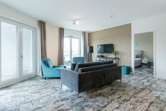 Die sehr geräumige Ferienwohnung Hafenspitze 14 darf sich durchaus als eines der Besonderen Appartements bezeichnen, da es mit einer Wohnfläche von 100 qm zu einer der großzügigsten Wohneinheiten im Haus gehört und zudem auch für unsere Gäste mit Hund bestens geeignet ist. Im schicken Style empfängt Sie der Wohn-/Essbereich, welcher mit bodentiefen Fenstern und zugehörigem Balkon die Aussicht auf den Hafen und Ostsee bietet. Zur Ausstattung gehören Internetradio und internetfähiges Fernsehen mit Hotelmodus. Kostenfrei nutzen Sie die WLAN-Anbindung. Zudem ist das Domizil mit elektrischen Wärmeschutz Rollläden versehen. Soweit Sie Ihre Urlaubsmahlzeiten gerne selbst zubereiten möchten bietet die integrierte, voll ausgestattete Küchenzeile auch hierfür allen Komfort.