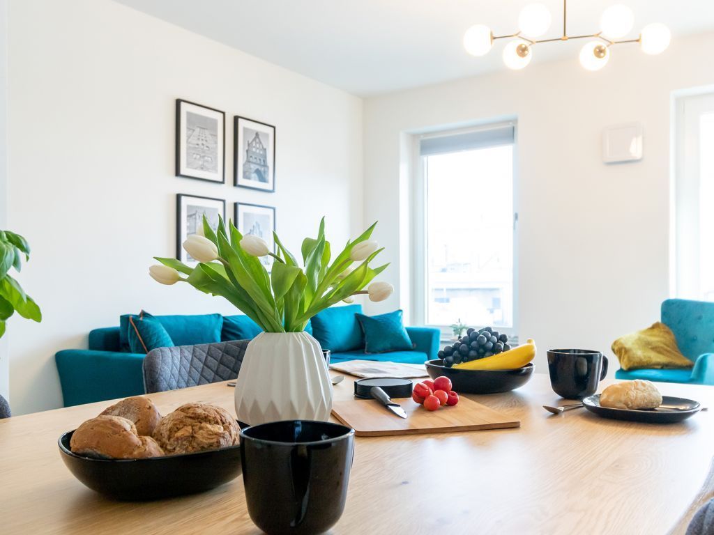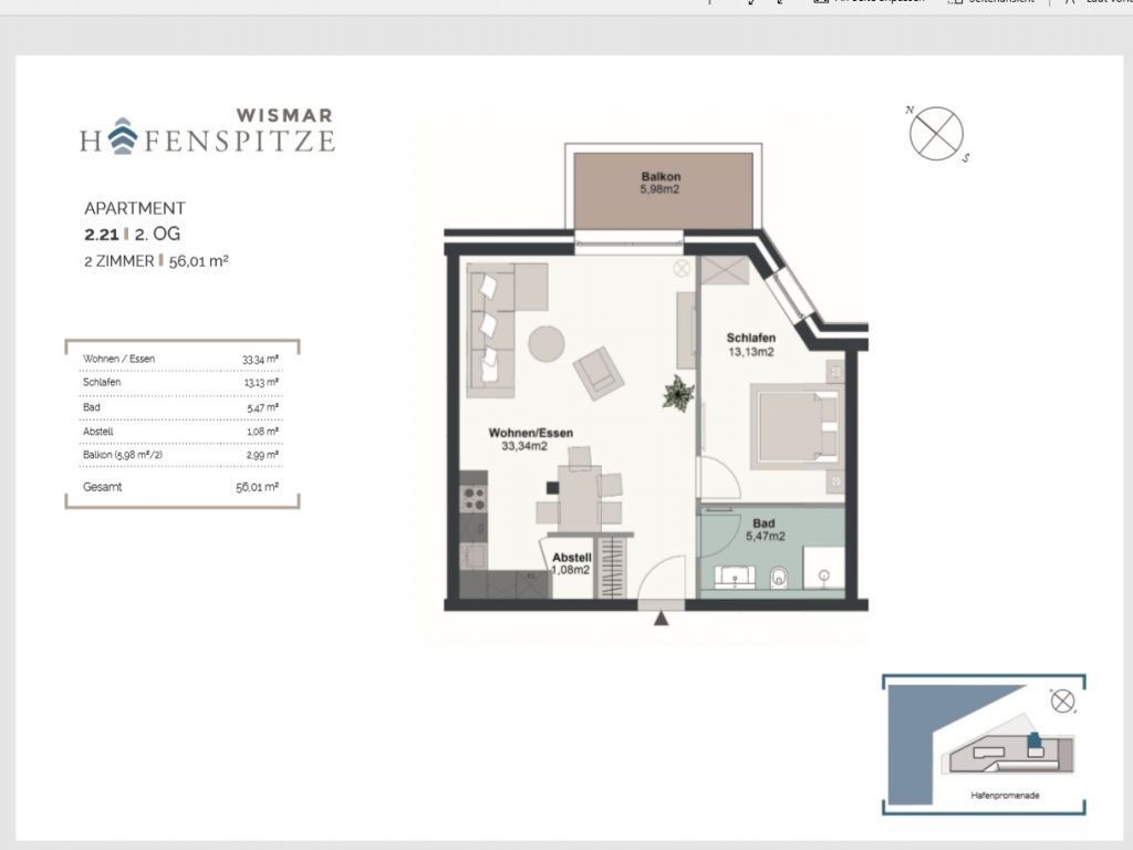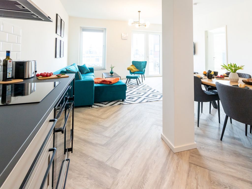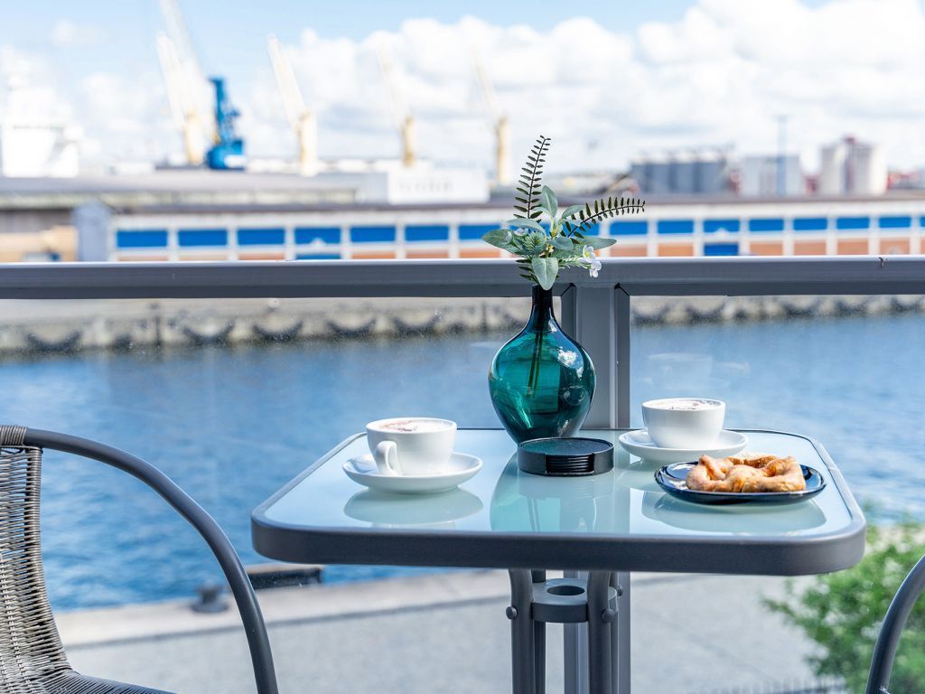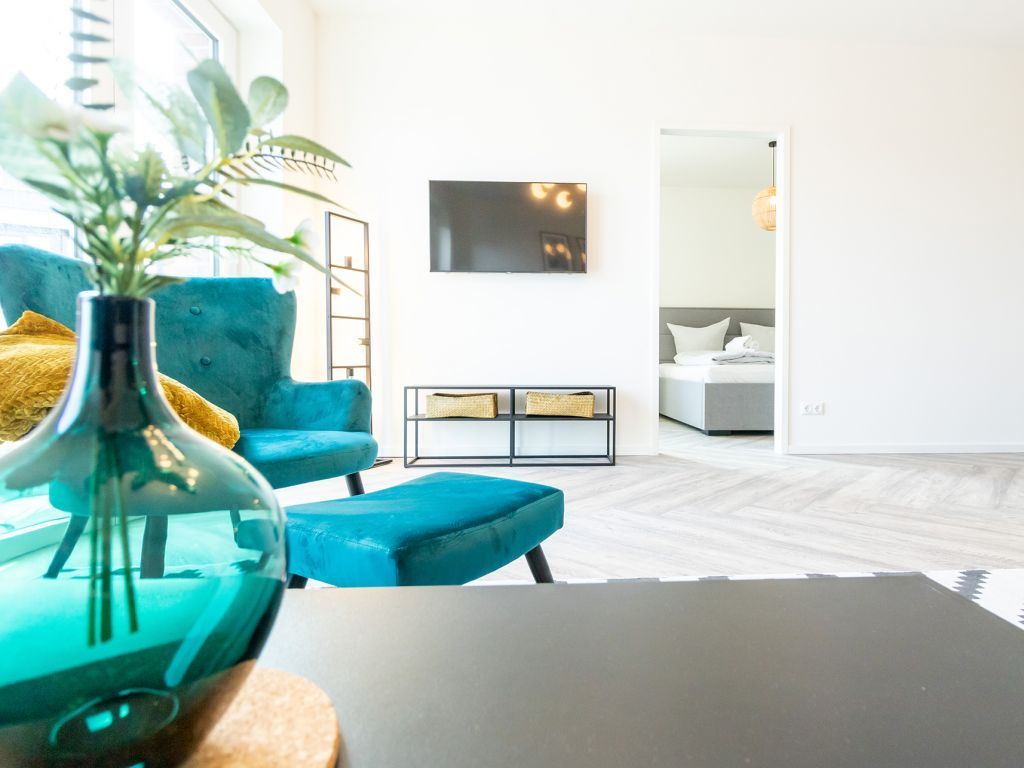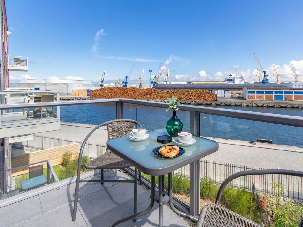 Das Appartement in der Hafenspitze 21 befindet sich im 2. Obergeschoss des Hauses und ist mit dem Personenaufzug leicht erreichbar. Die attraktive 2-Zimmer-Wohnung besitzt einen saisonal möblierten Balkon mit Blickrichtung zum Alten Holzhafen. Es empfängt Sie ein sehr modernes Ferienappartement für maximal 4 Personen mit einer Wohnfläche von 56qm. Der elegant gestaltete Wohn-Essbereich empfängt Sie herzlich mit einer bequemen Sitzgarnitur, welche Ihnen zwei zusätzliche Schlafgelegenheiten bieten kann, einem Ruhesessel sowie technischer Unterhaltung mit Internet fähigem TV sowie Radio mit Hotelmodus. WLAN nutzen Sie selbstverständlich kostenfrei.