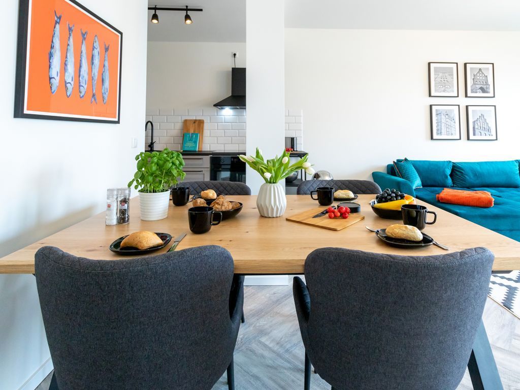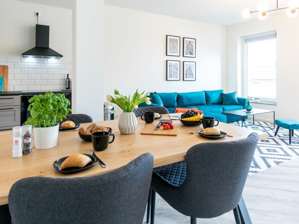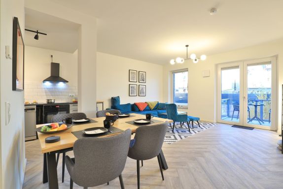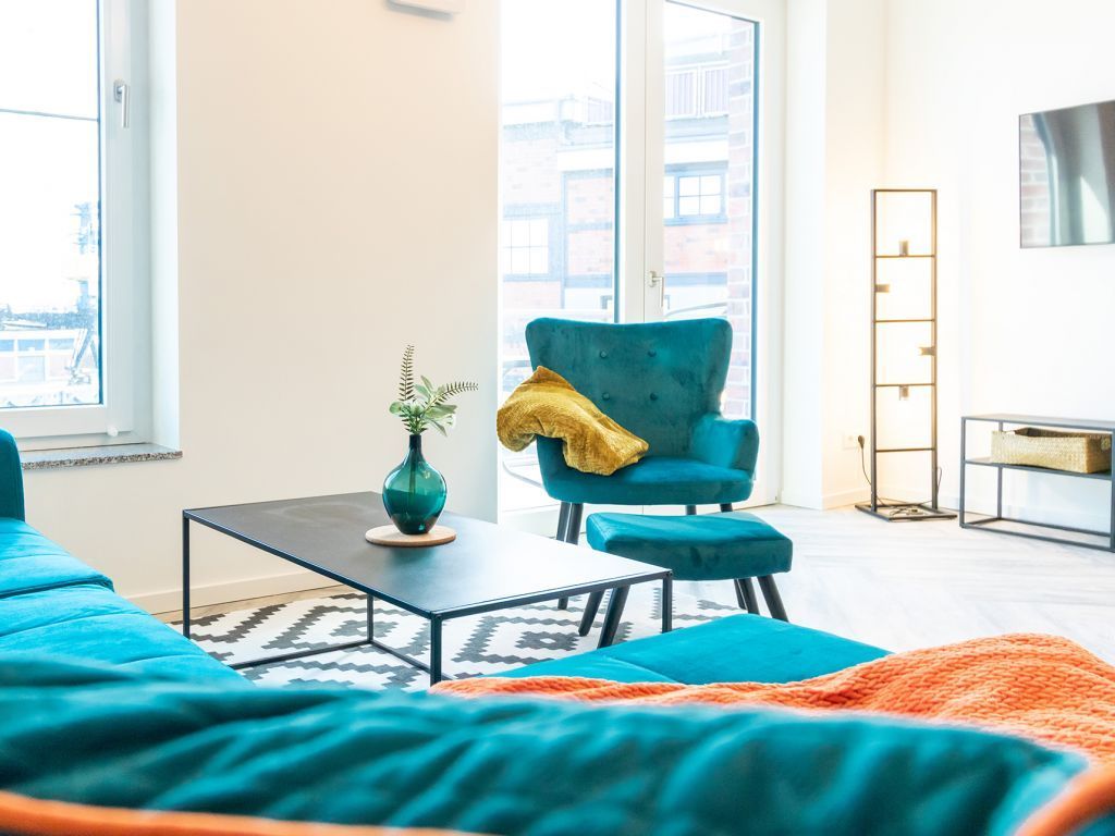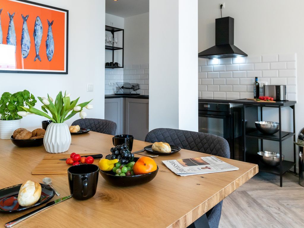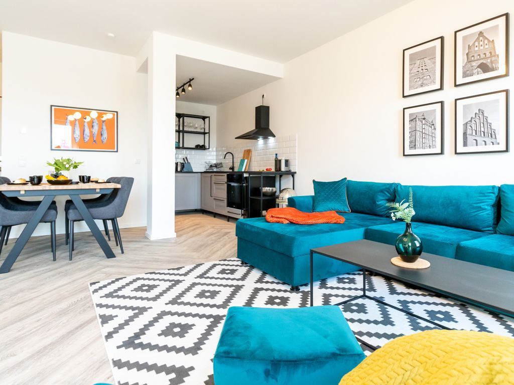 Das Appartement in der Hafenspitze 21 befindet sich im 2. Obergeschoss des Hauses und ist mit dem Personenaufzug leicht erreichbar. Die attraktive 2-Zimmer-Wohnung besitzt einen saisonal möblierten Balkon mit Blickrichtung zum Alten Holzhafen. Es empfängt Sie ein sehr modernes Ferienappartement für maximal 4 Personen mit einer Wohnfläche von 56qm. Der elegant gestaltete Wohn-Essbereich empfängt Sie herzlich mit einer bequemen Sitzgarnitur, welche Ihnen zwei zusätzliche Schlafgelegenheiten bieten kann, einem Ruhesessel sowie technischer Unterhaltung mit Internet fähigem TV sowie Radio mit Hotelmodus. WLAN nutzen Sie selbstverständlich kostenfrei.
