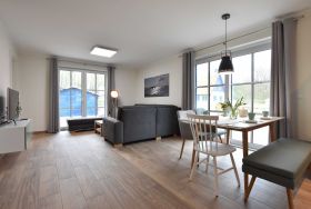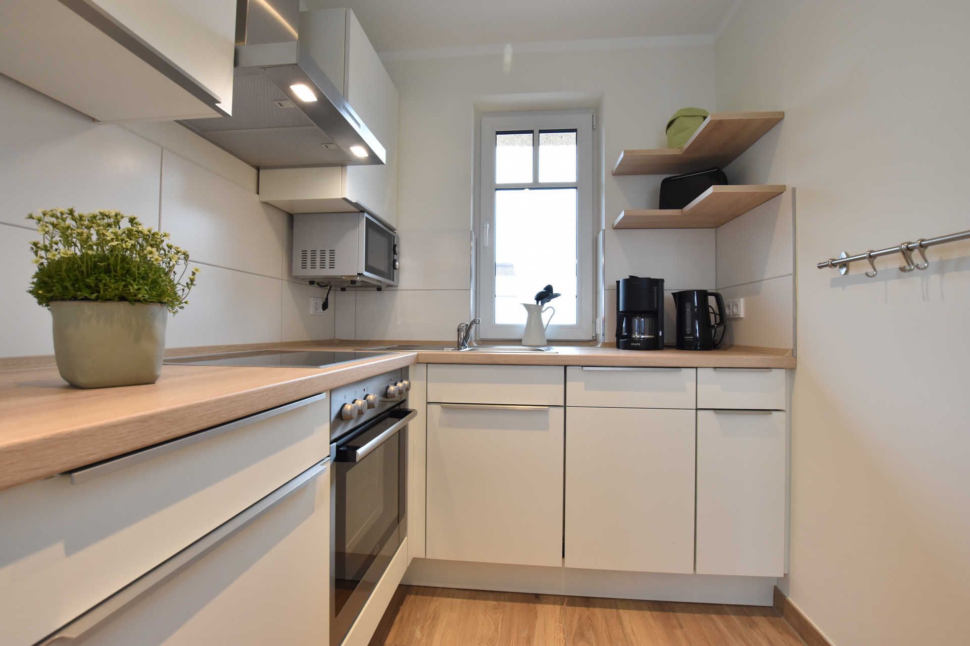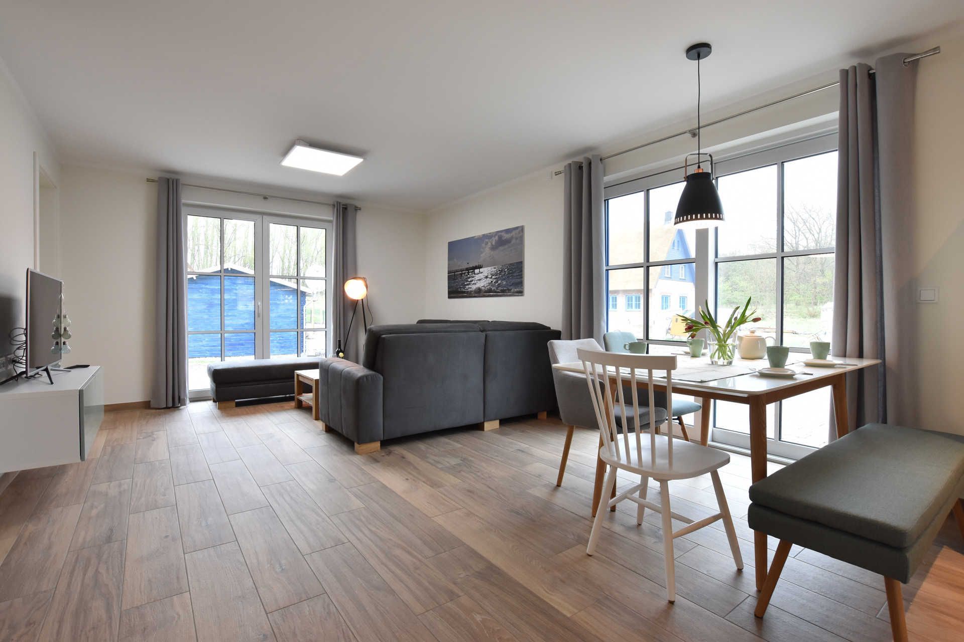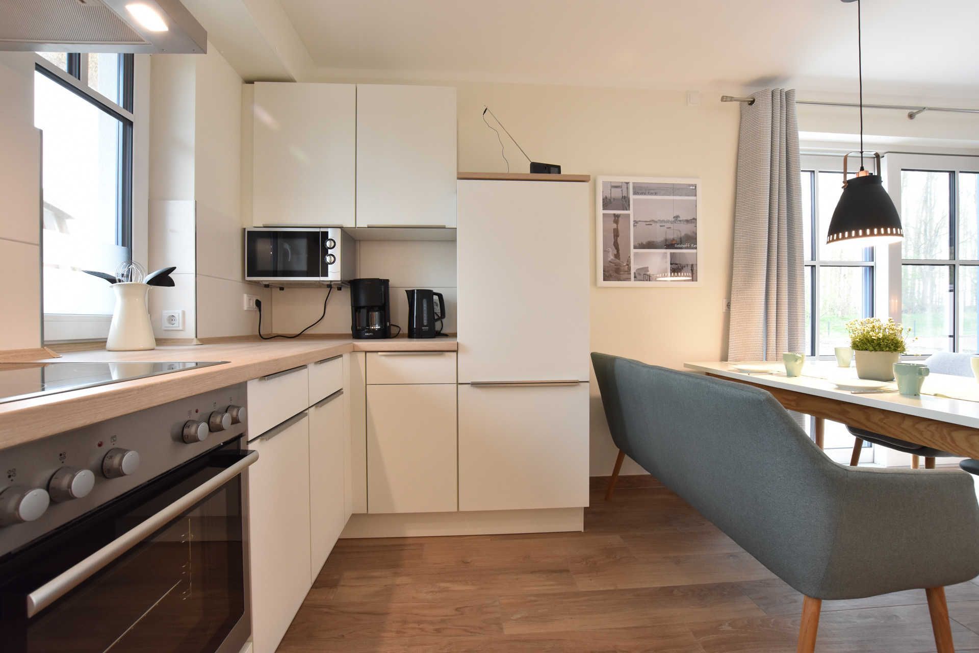 Im Erdgeschoss großzügiger Wohn-/ Essbereich mit Esstisch und integrierter Küche mit Backofen, 4-Platten-Herd, Mikrowelle, Geschirrspüler, Kühl-/ Gefrierkombination, Kaffeemaschine ausgestattet. Im EG ein Schlafraum mit 1 Doppelbett (1,80 x 2 m). Gäste-WC.