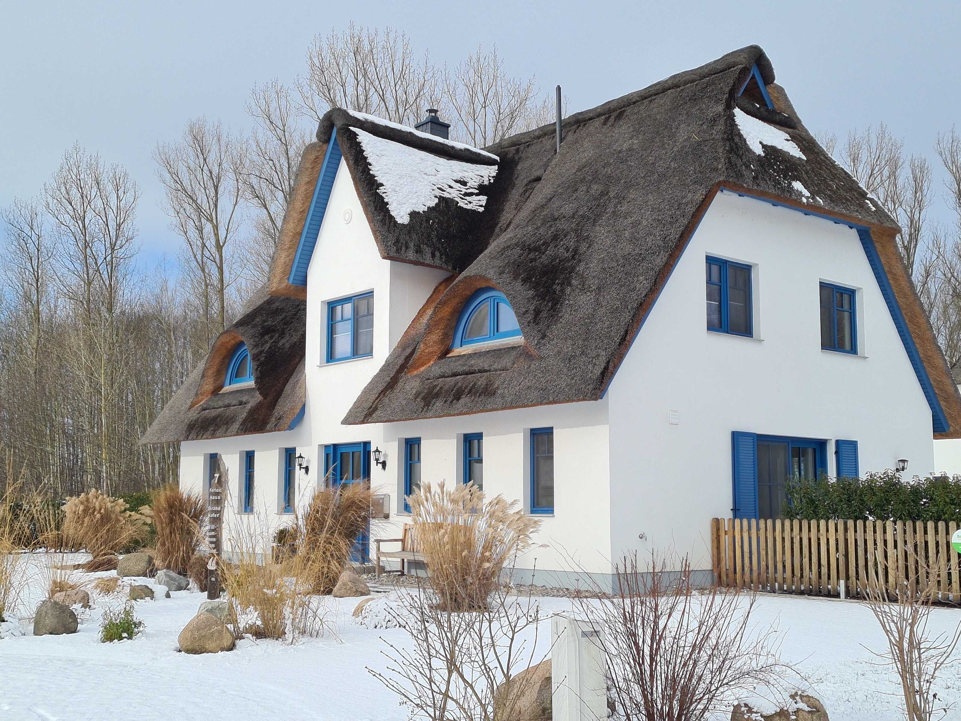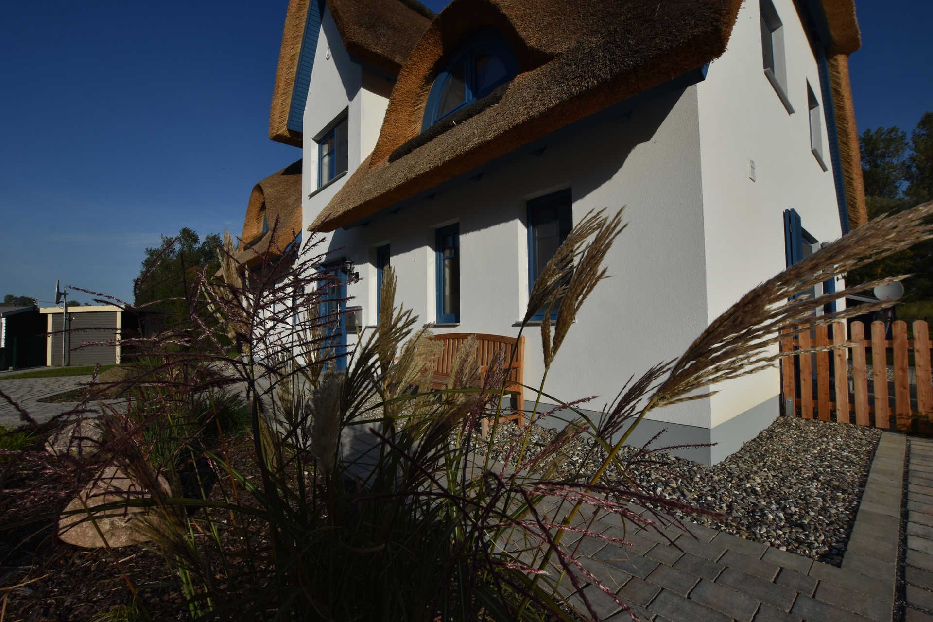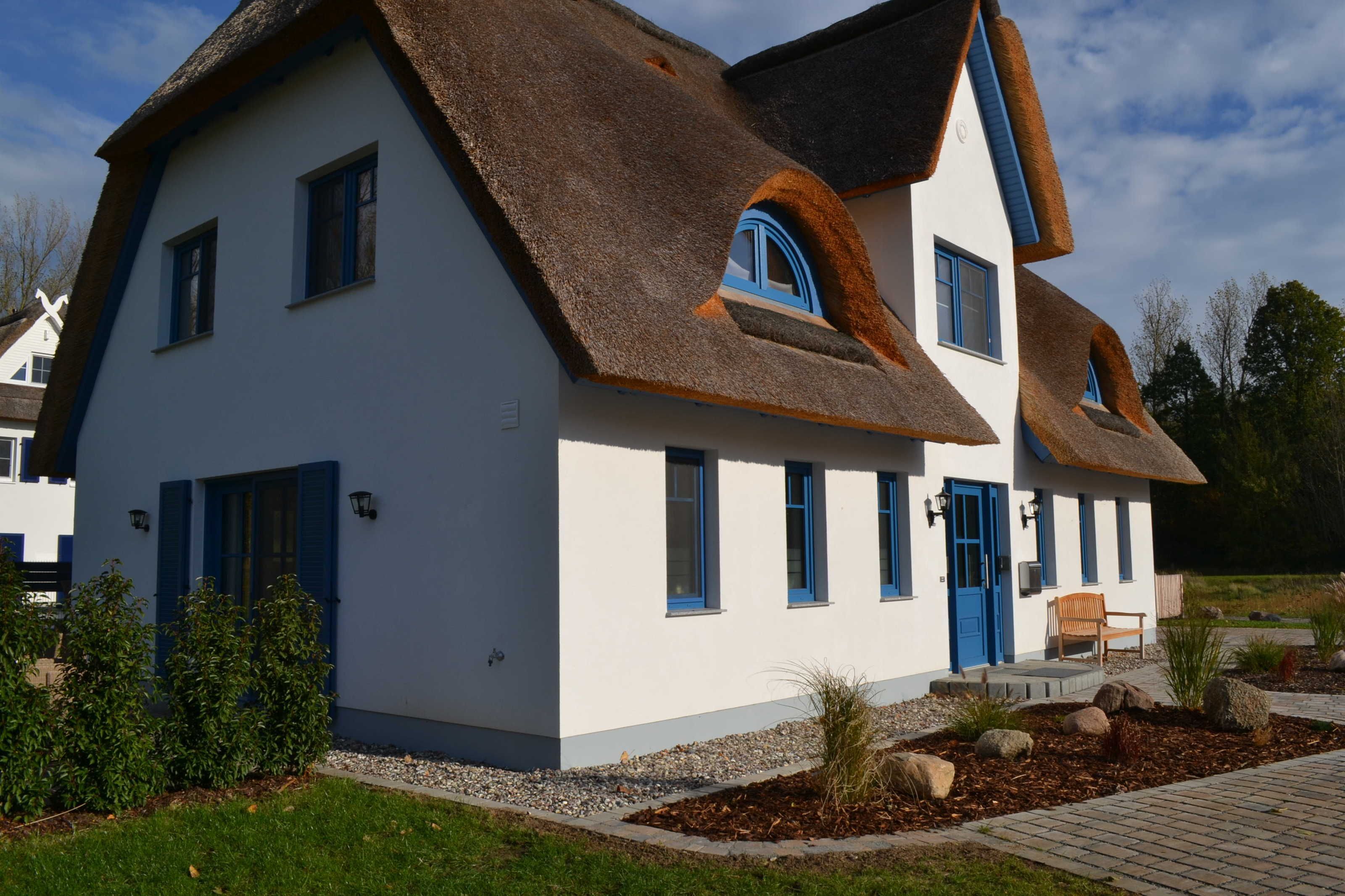 Reetdach-Ferienhaus im Ostseebad Rerik mit 2 Doppelhaushälften. Diese rechte Doppelhaushälfte rechts (85 m²) ist für 5 Personen + 1 Baby geeignet.