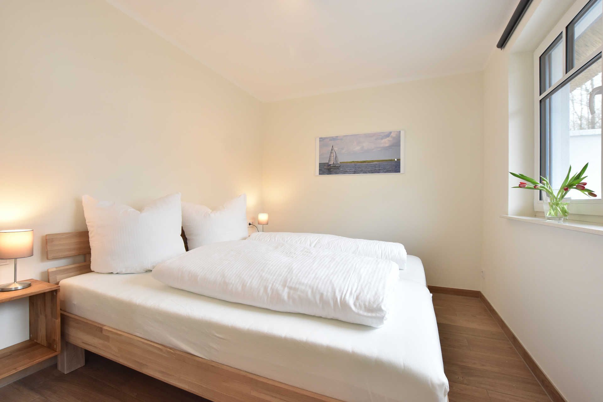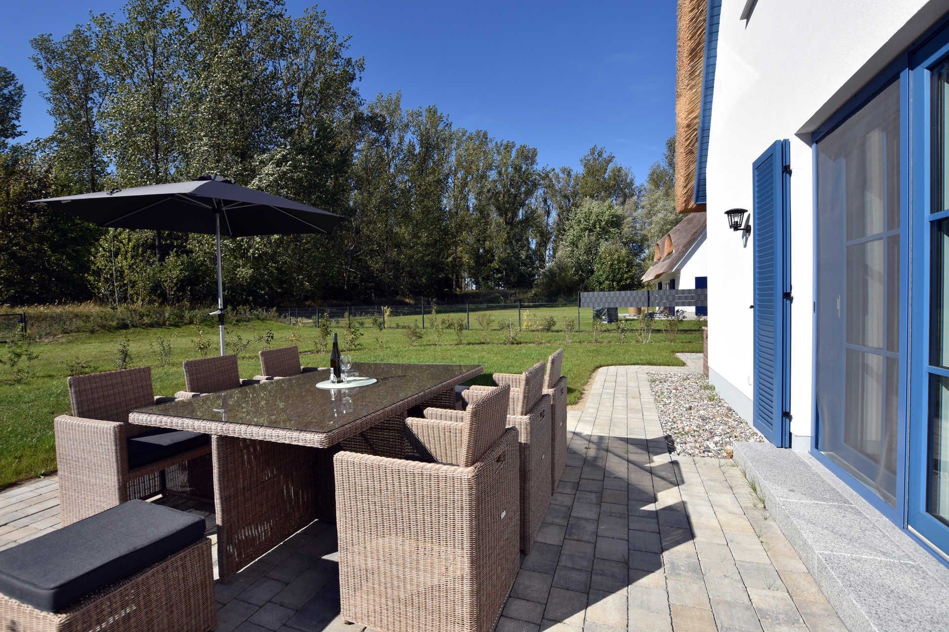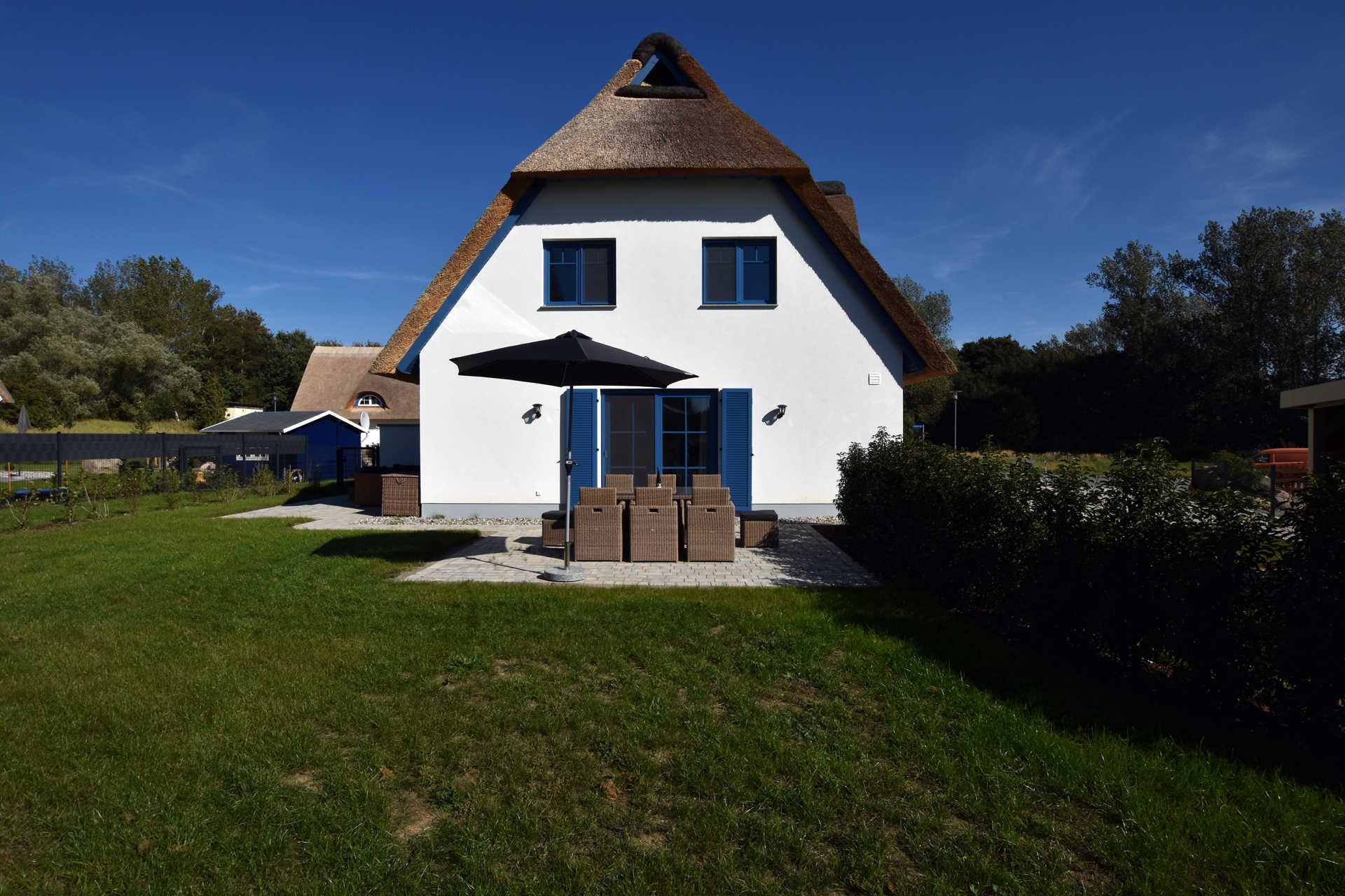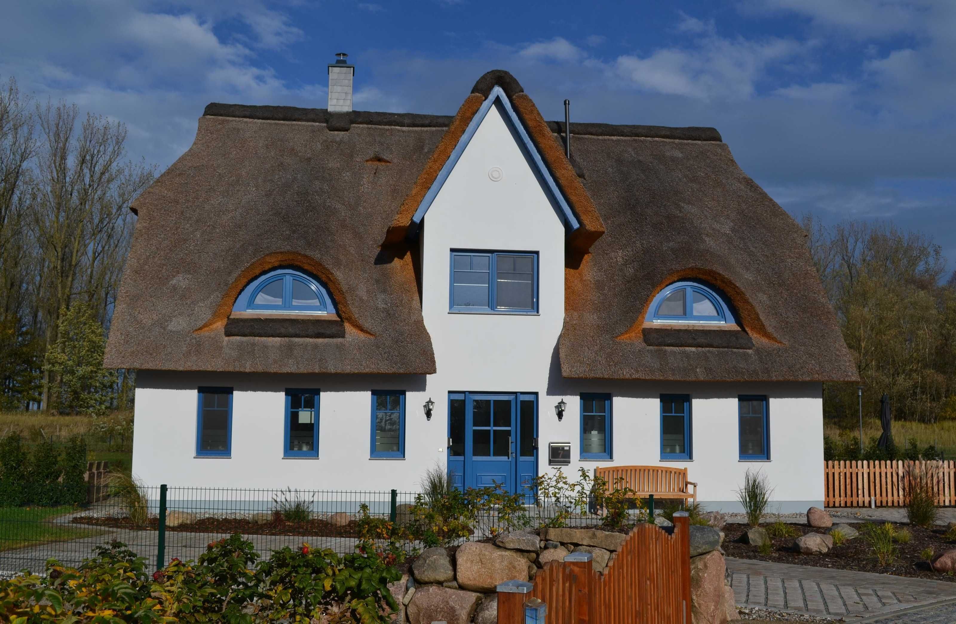 Reetdach-Ferienhaus im Ostseebad Rerik mit 2 Doppelhaushälften. Diese rechte Doppelhaushälfte rechts (85 m²) ist für 5 Personen + 1 Baby geeignet.
