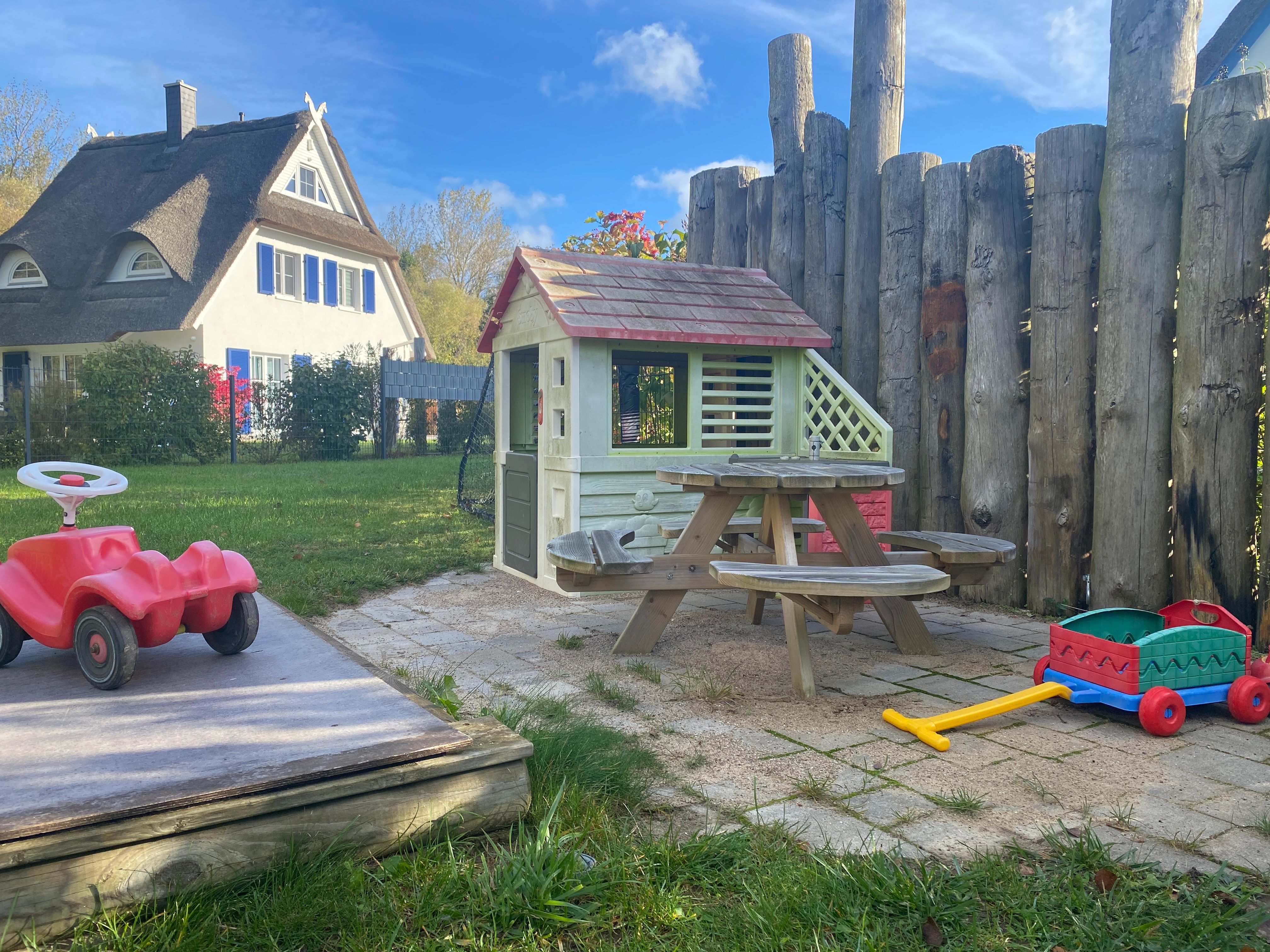 Babybett (Reisebett ohne Bettwäsche), Hochstuhl, kindersichere Steckdosen, Treppenschutzgitter, großer, eingezäunter Garten. Zusätzlich gibt es einen Gemeinschaftsgarten mit Strandkorb und Sandkasten, der bitte tierfrei bleibt.