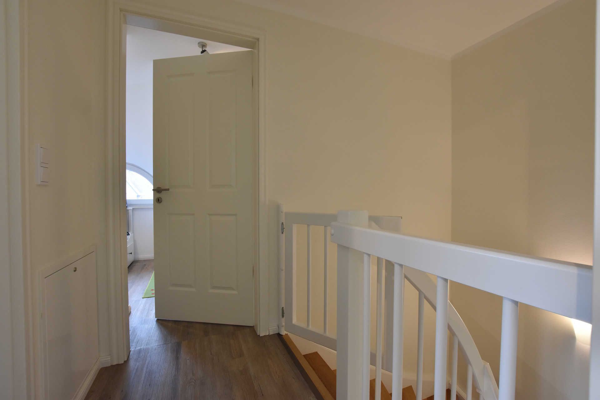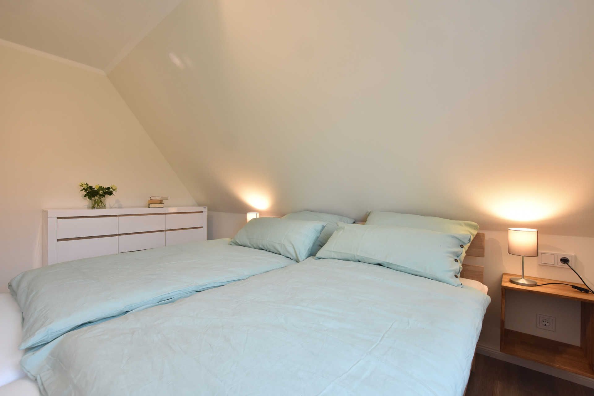 Im Obergeschoss zwei weitere Schlafzimmer. Davon ist ein Schlafraum mit Doppelbett (1,80 x 2 m) & TV ausgestattet. Im anderen Schlafzimmern steht ein Einzelbett. Das geräumige Bad verfügt über Dusche/ WC sowie Badewanne.