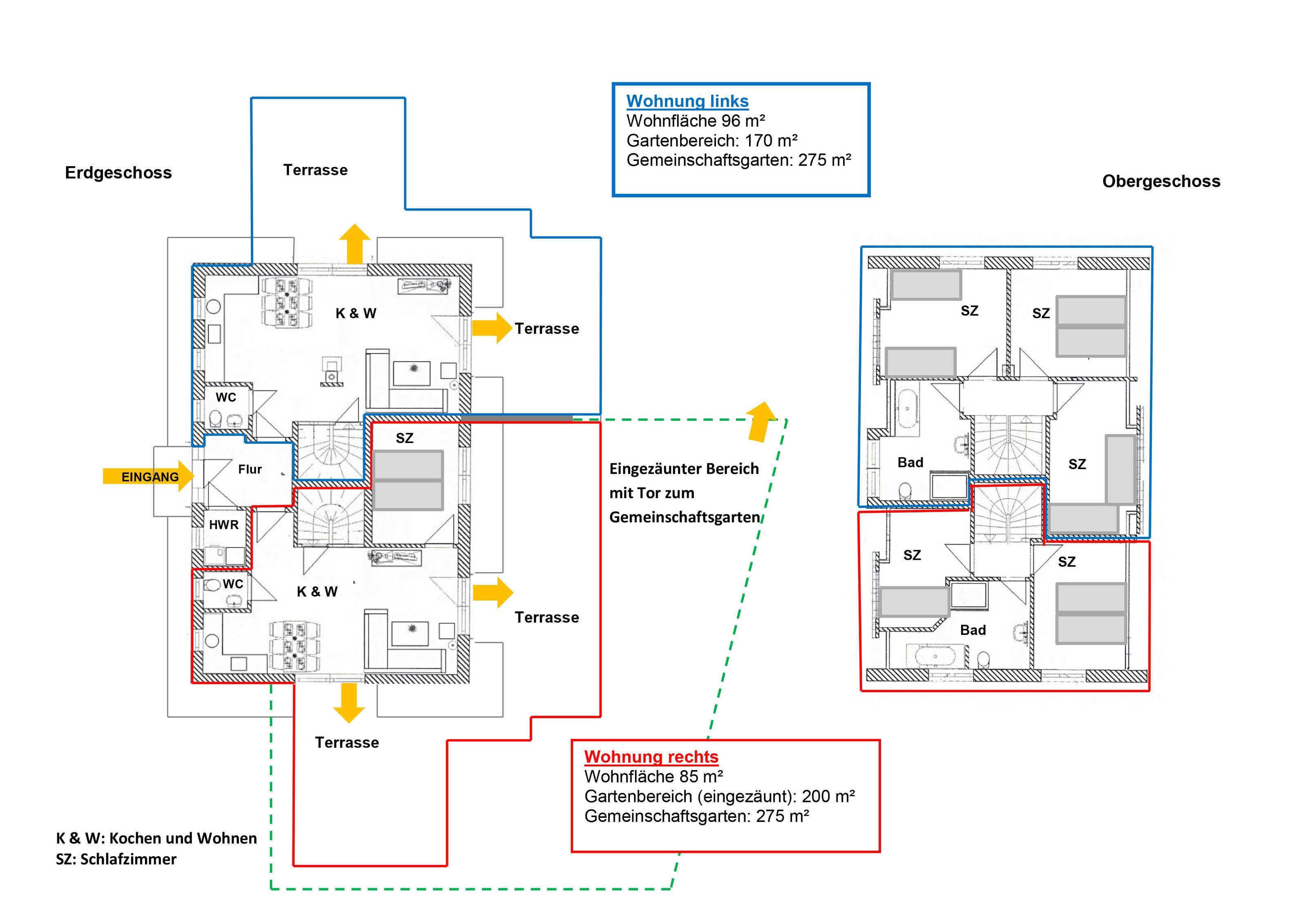 Eigener Garten (200 m²) plus Garten zur gemeinschaftliche Nutzung (275 m²), Terrassen mit Gartenmöbeln (Sitz-/ Essgruppe und Lounge Garnitur) sowie der abschließbare Gemeinschaftsschuppen mit Ladestation für E-Bikes sind für alle Gäste nutzbar. Elektro-Tisch-Grill vorhanden.