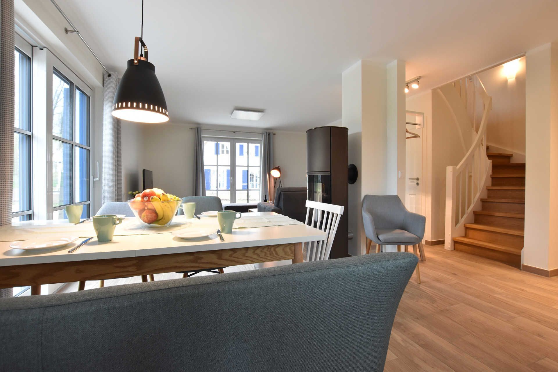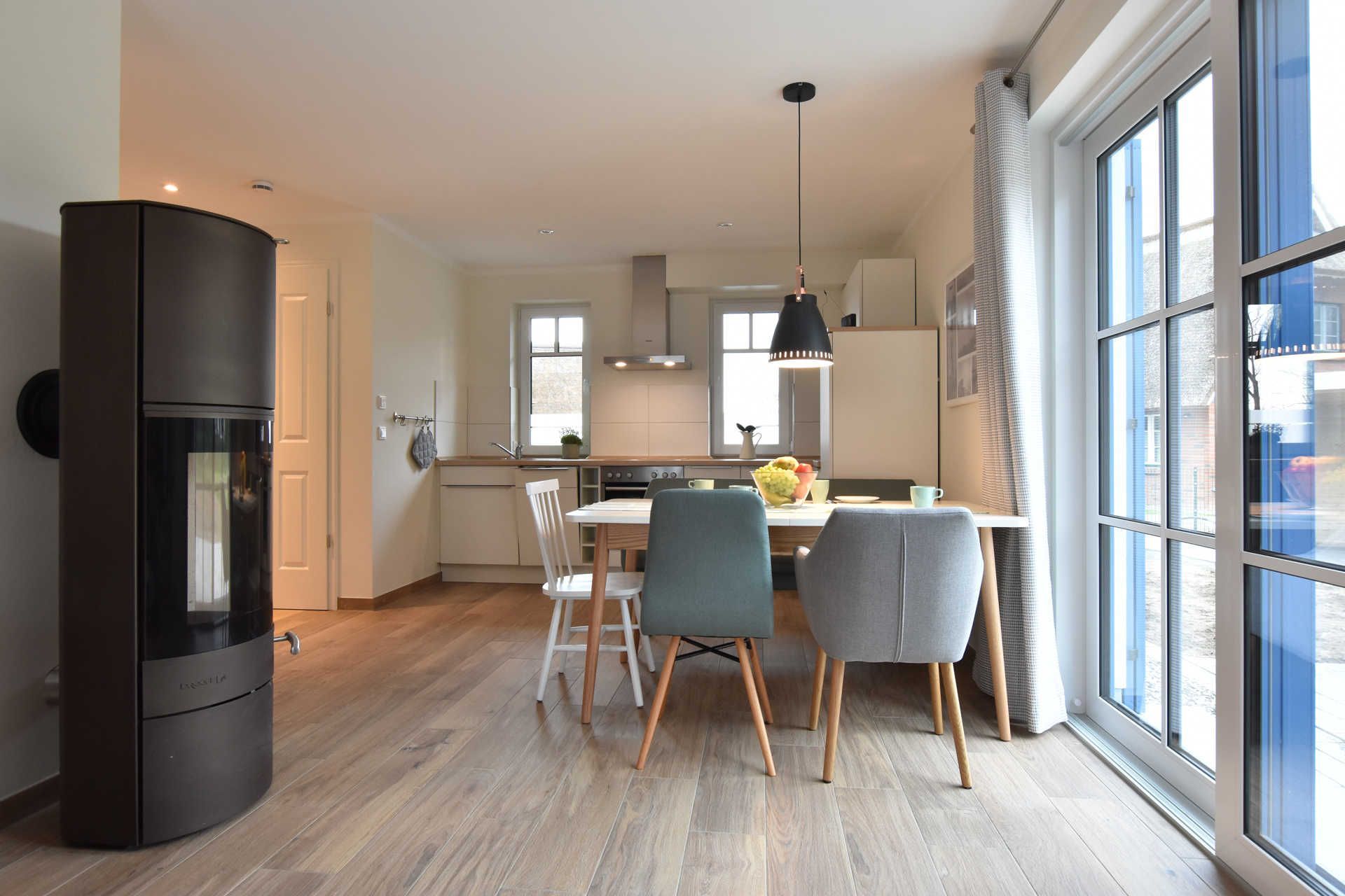 Im Erdgeschoss großzügiger Wohn-/ Essbereich mit Kamin, Esstisch und integrierter Küche mit Backofen, 4-Platten-Herd, Mikrowelle, Geschirrspüler, Kühl-/ Gefrierkombination, Kaffeemaschine. Gäste-WC.