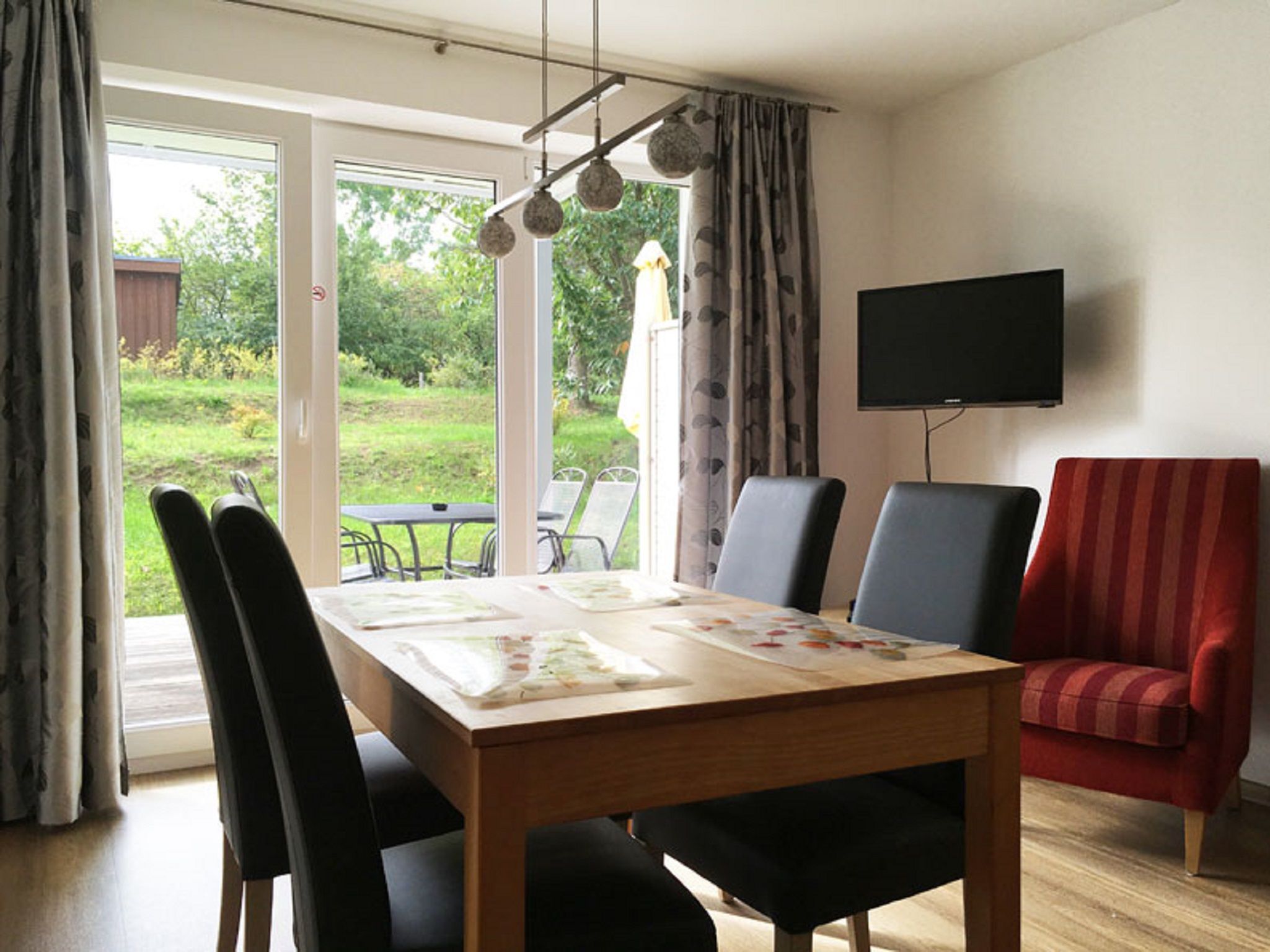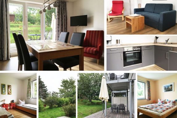 In unseren 4 Ferienwohnungen erwartet Sie ein großer Wohn- und Kochbereich, mit TV, Radio gemütlicher Couch und großem Esstisch. Die offene Küche ist solide ausgestattet. Zwei Schlafzimmer sorgen für erholsamen Schlaf. Von Ihrer geräumigen Terrasse / Balkon können Sie den Blick in den Garten genießen. Ideal für Familien.