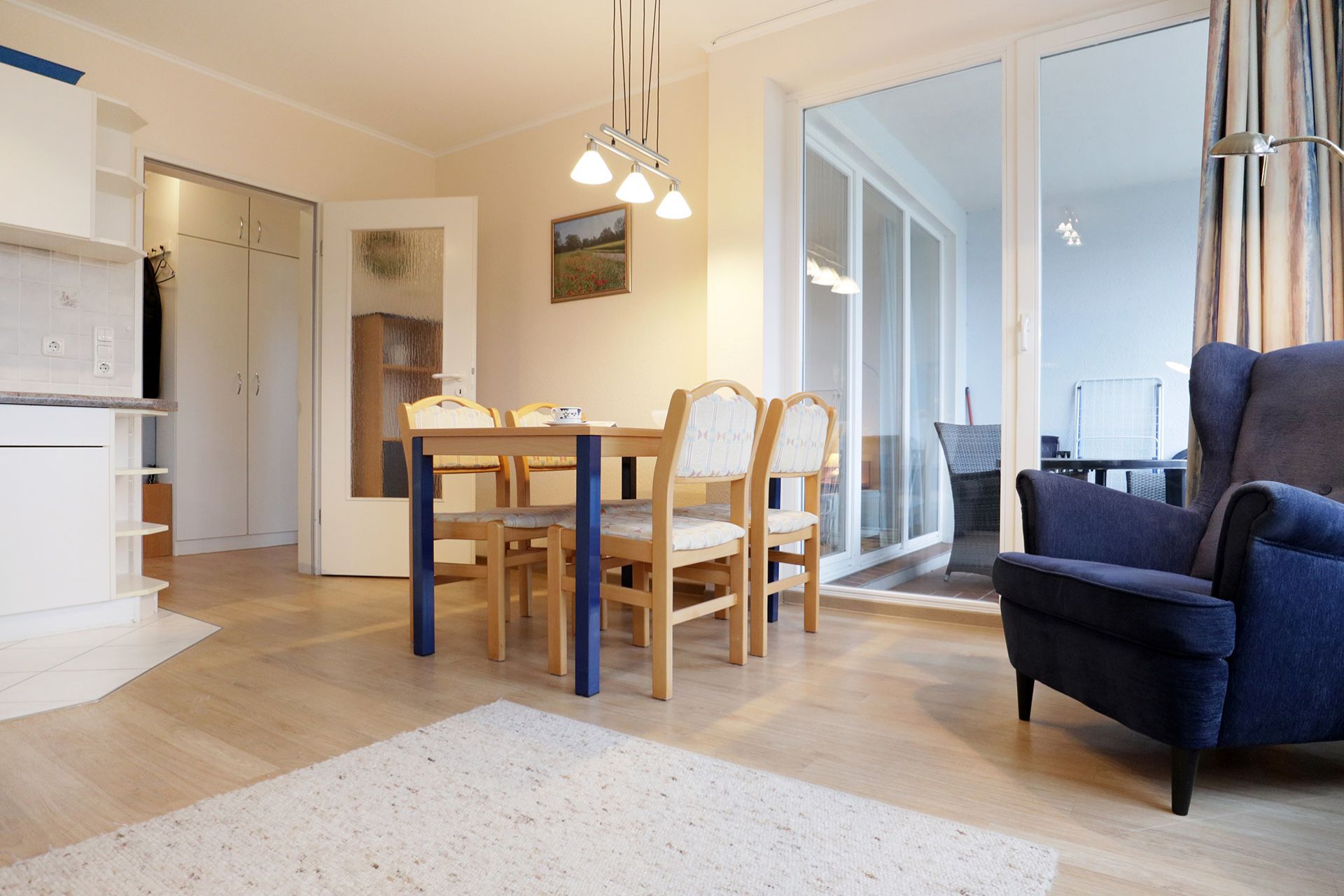 Die 2-Zimmer Ferienwohnung ?Likedeeler 26 ? mit Balkon, befindet sich im 1. Obergeschoss und besitzt eine Wohnfläche von 49qm. Mit bis zu 4 Personen können Sie die Allergiker geeignete Wohnung bewohnen. Das Appartement ist komfortabel möbliert. Der Wohn-/Essbereich empfängt Sie mit einem Sofa, welches als ausziehbare Couch zwei zusätzlichen Schlafplätze ermöglicht. Ein Lehnsessel sowie ein Esstisch mit vier Sitzplätzen sind ebenfalls vorhanden. Für technische Unterhaltung befinden sich ein Fernseher, DVD-Player sowie Musikanlage in der Wohnung. Den Internetzugang über WLAN nutzen Sie kostenfrei. Dür Selbstversorger befindet sich im Wohnbereich eine integrierte und voll ausgestattete Wohnküche mit: Ceranherd, Backofen, Mikrowelle, Dunstabzug, Kühlschrank mit integr. Gefrierfach, Geschirrspüler, Kaffeemaschine, Wasserkocher, Toaster usw. Ihre Speisen nehmen Sie am Esstisch zu sich, oder während der wärmeren Jahreszeit auf dem saisonal möblierten Balkon in Nord- Ausrichtung. Sie schlafen in einem separaten Schlafzimmer mit Doppelbett, Kleiderschrank. Diese Schlafbereich bietet einen weiteren Zugang auf den Balkon. Das hell geflieste Tageslicht Duschbad ist mit Waschtisch, Föhn, WC ausgestattet. Ein Bügeleisen und Bügelbrett stehen zur Verfügung. Allen Hausgästen stehen eine Waschmaschine und Wäschetrockner gegen Gebühr im Untergeschoss der Ferienanlage zur Verfügung. Ihr Fahrzeug parken Sie in der hauseigenen Tiefgarage auf einem fest zugeordneten Stellplatz. Mit dem Fahrstuhl gelangen Sie zu den Wohnungsetagen.