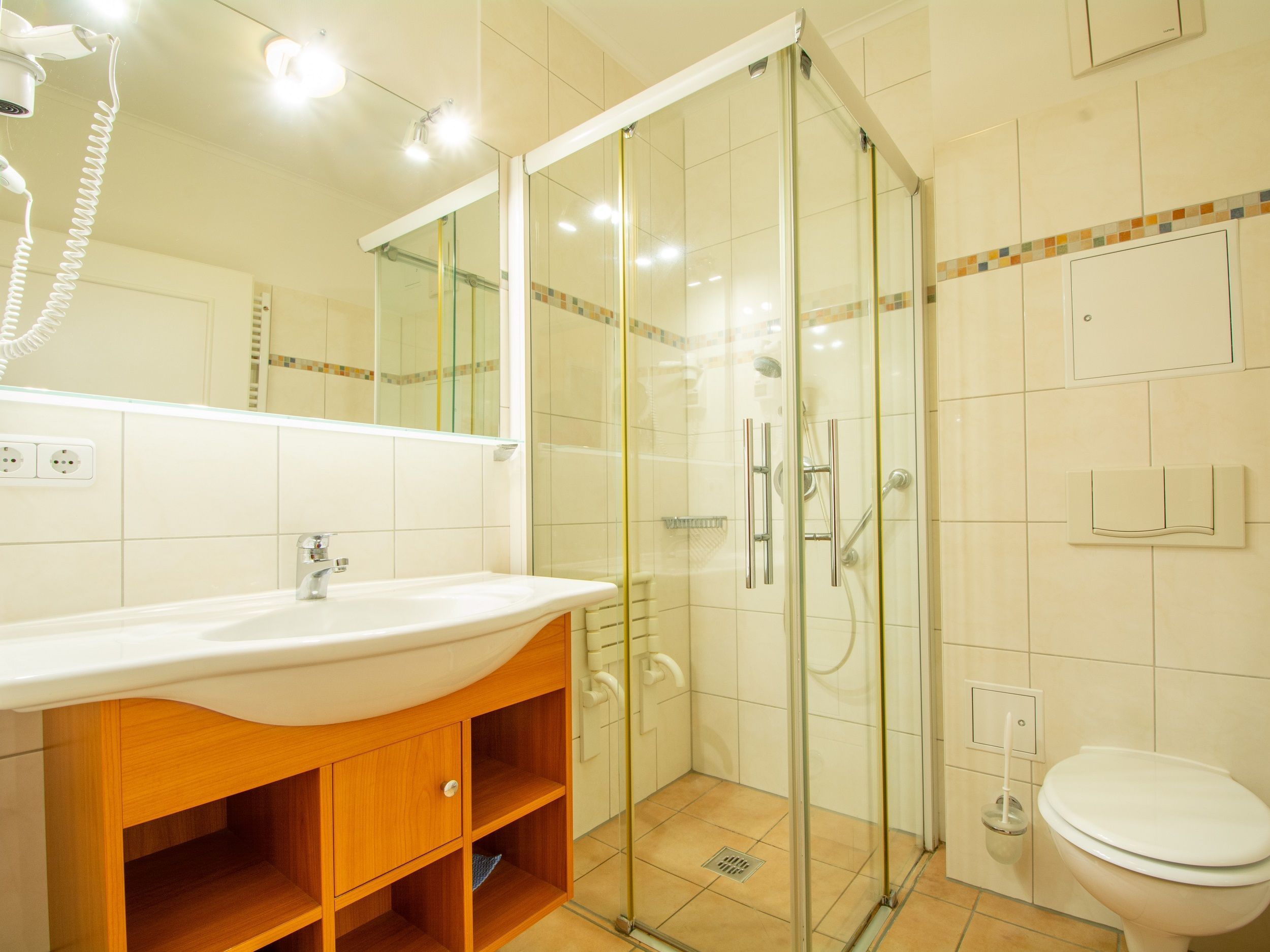 Das Bad mit bodengleicher Dusche, einem großen Waschtisch und Ablagemöglichkeit für Ihre Badutensilien rundet das Gesamtbild dieser wunderschönen Ferienwohnung ab.