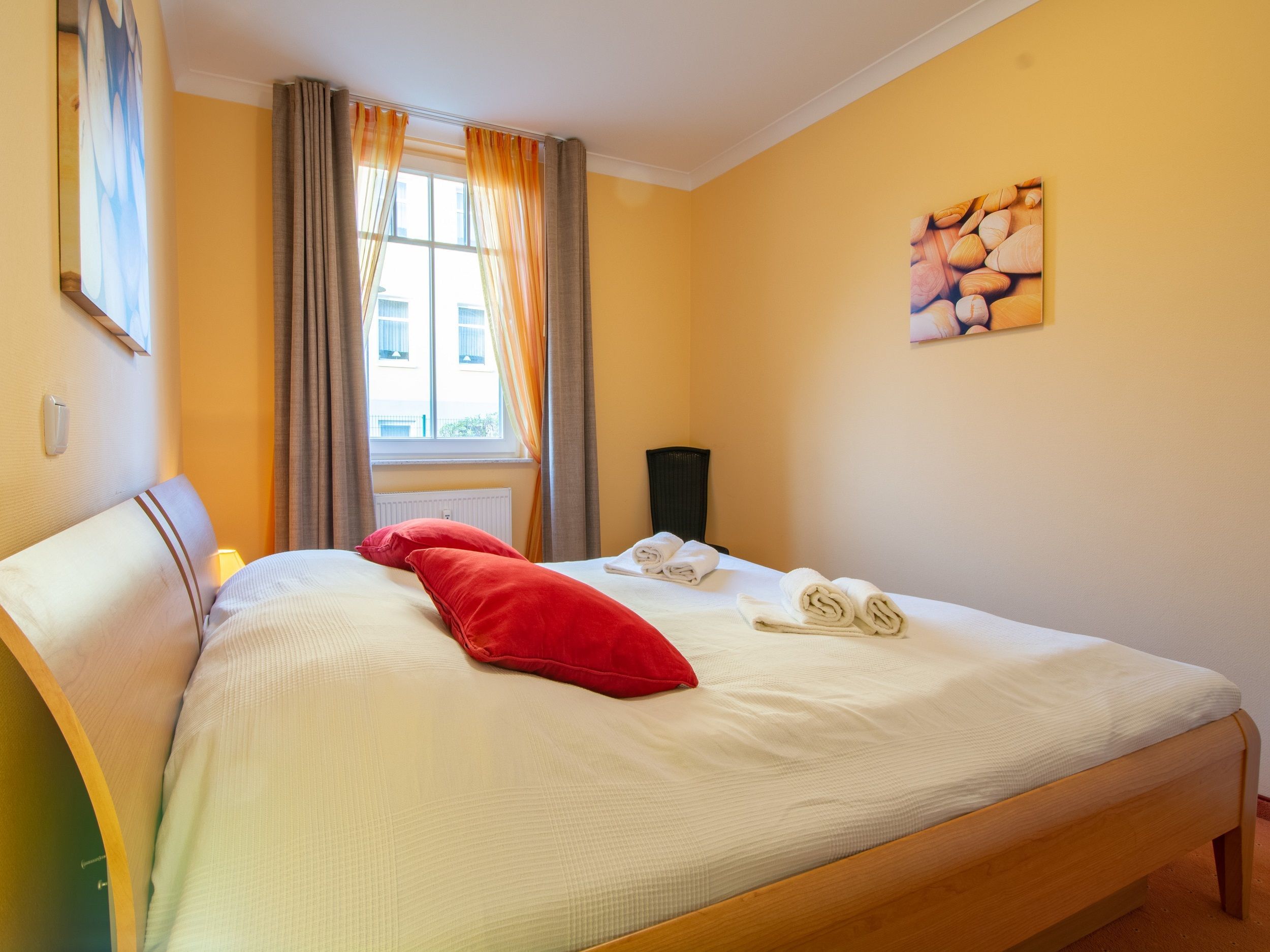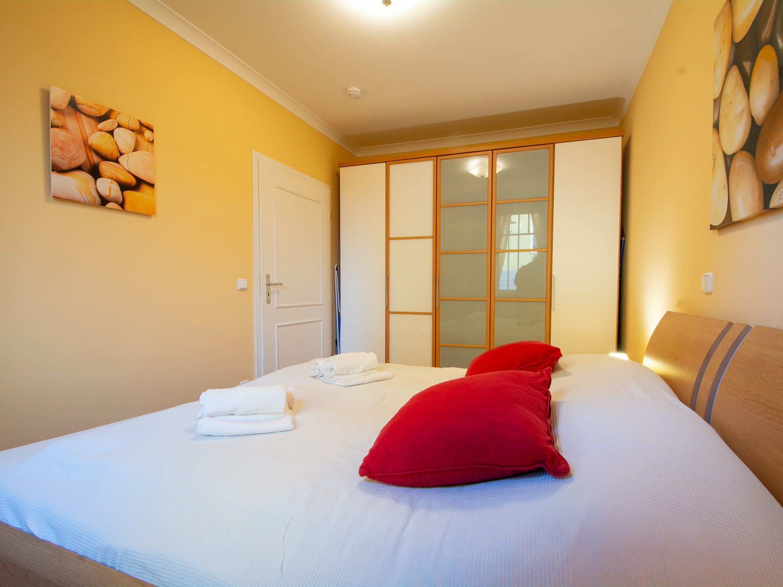 Im Schlafzimmer lädt Sie ein komfortables Doppelbett (2 x 90cm x 200 cm) zur Nachtruhe ein. Der großzügige Kleiderschrank bietet genügend Platz für Ihre Urlaubsgarderobe. Als Sichtschutz bzw. zum Verdunkeln sind im Schlafzimmer Gardinen und Vorhänge am Fenster angebracht.