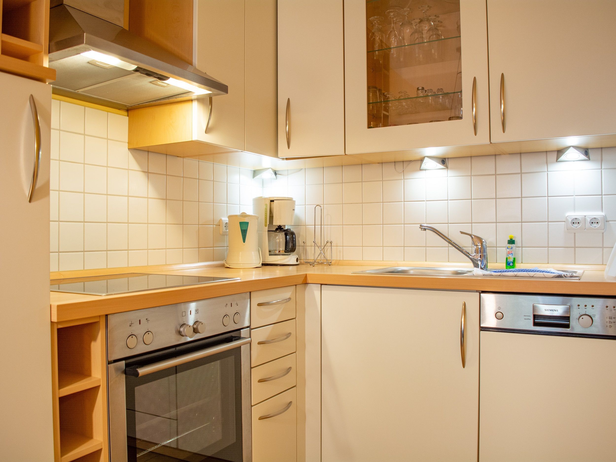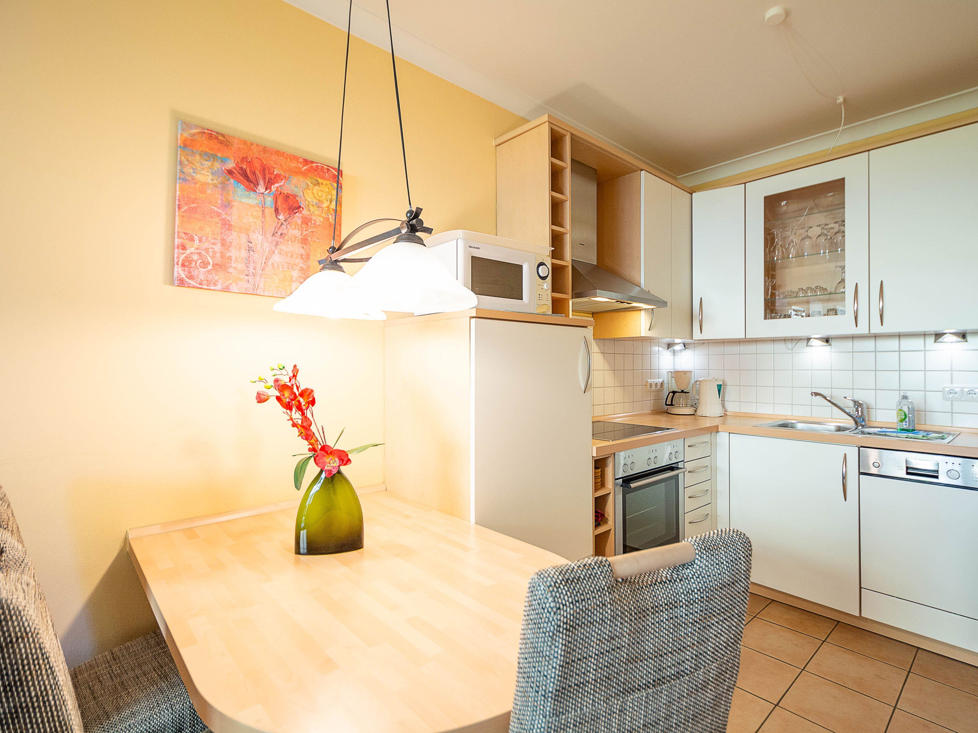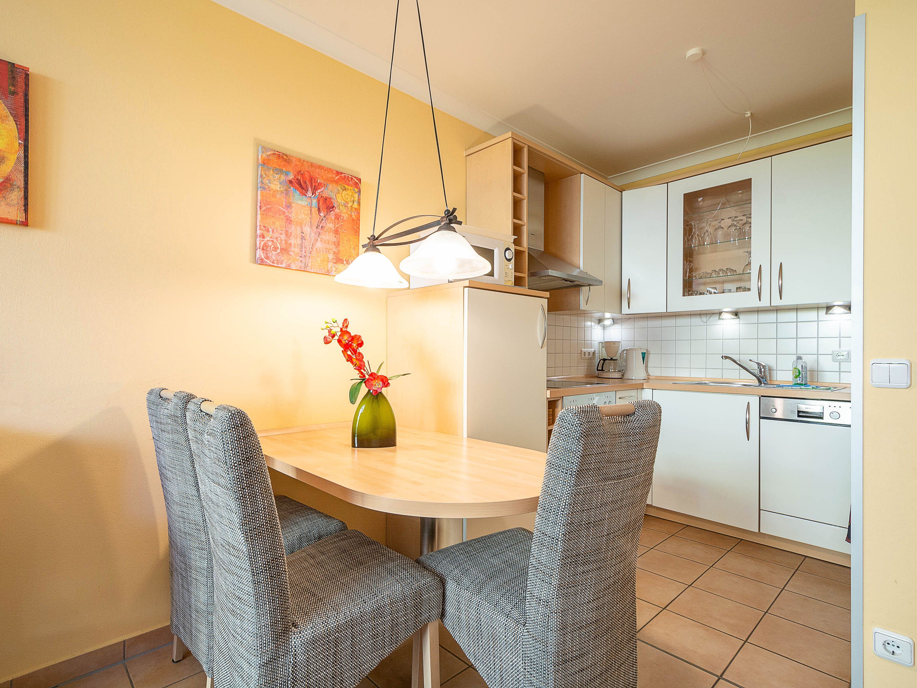 Der angrenzende Essbereich bietet Ihnen reichlich Platz für gemeinsame Mahlzeiten. Die offene Küchenzeile hält für Sie alle wichtigen Küchengeräte und -utensilien bereit, die Sie für Ihr perfektes Dinner benötigen: Ein 4-Zonen-Cerankochfeld mit Dunstabzug, ein Backofen, eine Mikrowelle, ein Geschirrspüler sowie ein Kühlschrank mit Gefrierfach befinden sich in der Küche. Eine Kaffeemaschine, ein Wasserkocher und ein Toaster sowie genügend Koch- und Essgeschirr vervollständigen die Kücheneinrichtung.