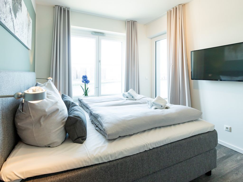 Sie wohnen in dem 2-Zimmer Appartement Hafenspitze 28 mit Blick zum Hafen. Ein Personenaufzug fährt Sie hinauf in die 2. Etage des Hauses. Mit 2 Personen ist die Belegung dieser attraktiven, 66qm großen Wohneinheit möglich. Der Balkon ist saisonal möbliert. Eine komfortable Küchenzeile ist ebenso vorhanden, wie ein separates Schlafzimmer und ein modernes Duschbad. Bei Ihrer Ankunft sind die Betten für 2 Personen bereits bezogen. Handtücher sind ebenfalls für 2 Personen inklusive. Es handelt sich um eine Nichtraucherwohnung. Gegen Gebühr können Sie im Parkhaus am Alten Hafen in ca. 300 Meter Ihr Fahrzeug abstellen.
