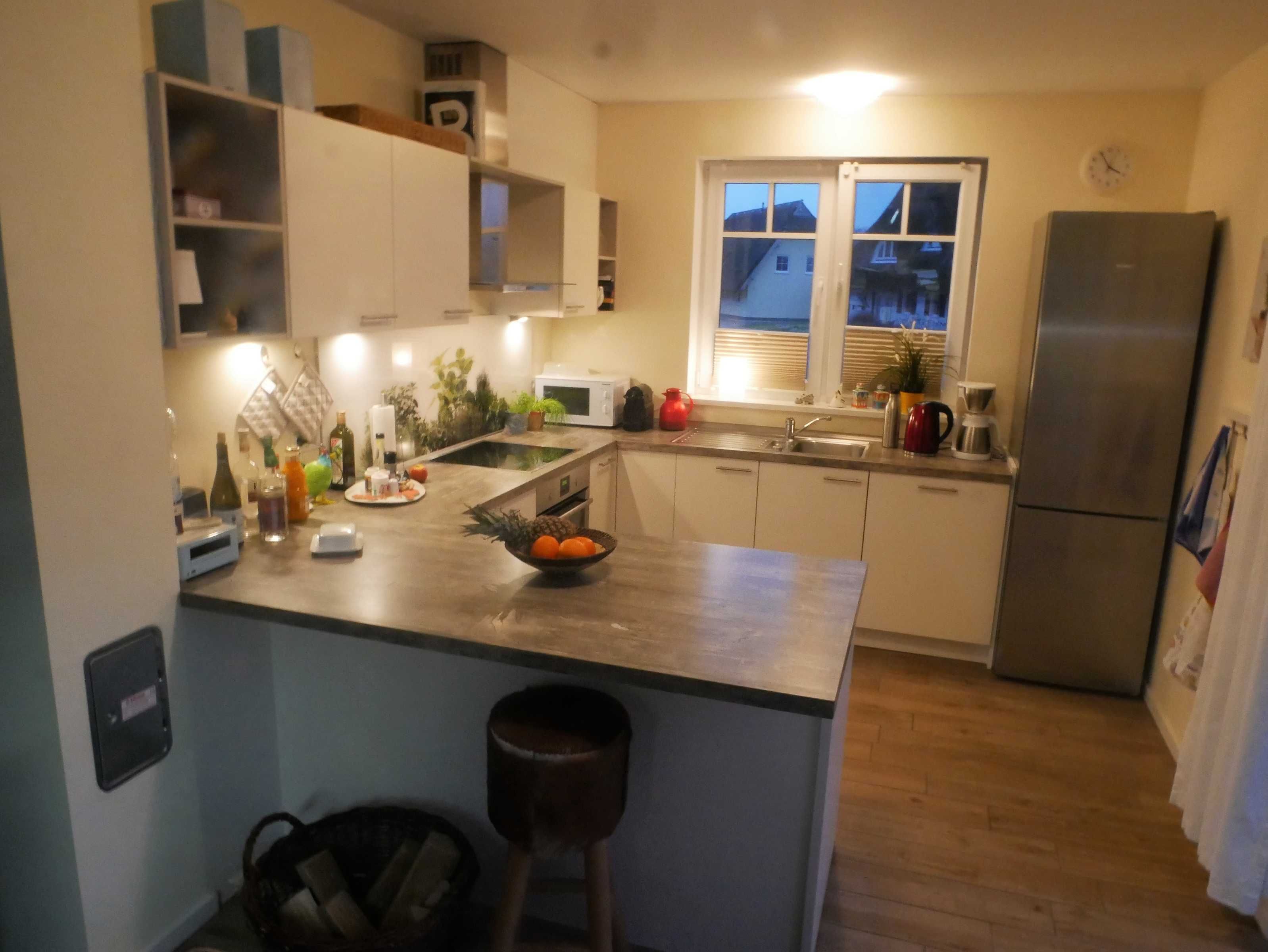 Offener Wohn-/ Küchenbereich. Küche mit Kühlschrank, Gefrierschrank, Induktions-Herd, Backofen, Spülmaschine, Mikrowelle, Kaffeemaschine, Nespresso-Kaffeeautomat, Toaster, Mixer, Salatschleuder. Großer Esstisch.