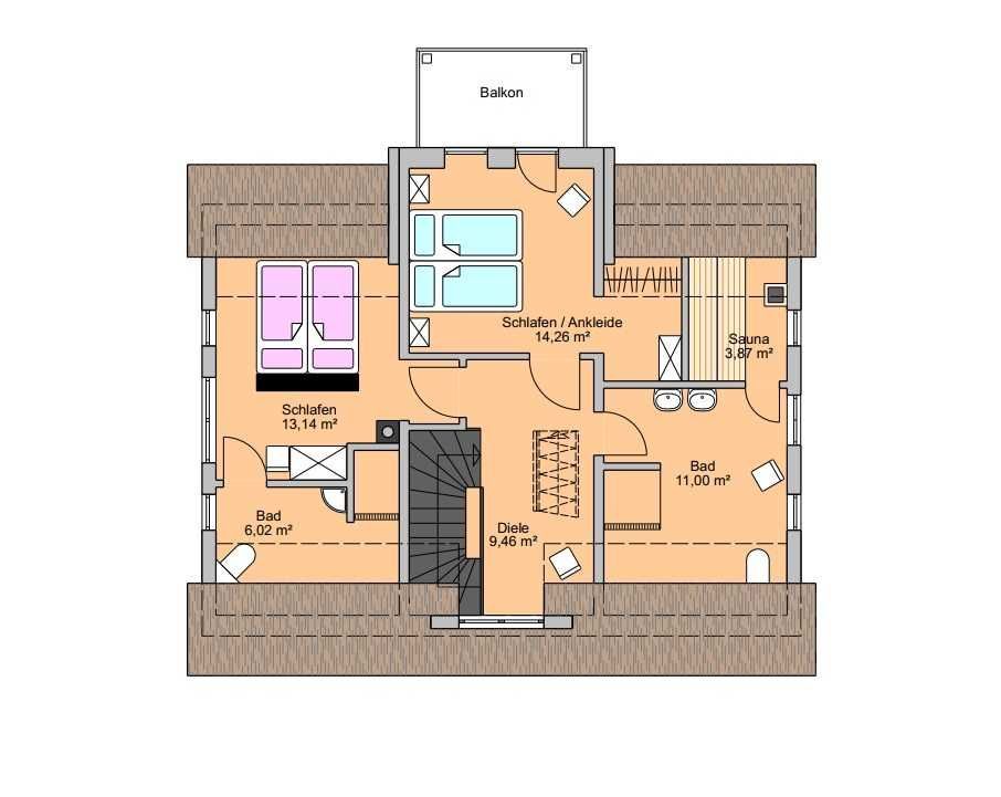 Obergeschoss mit 2 Schlafzimmern und 2 Duschbädern/ WC sowie Saunabereich mit Gartenblick.