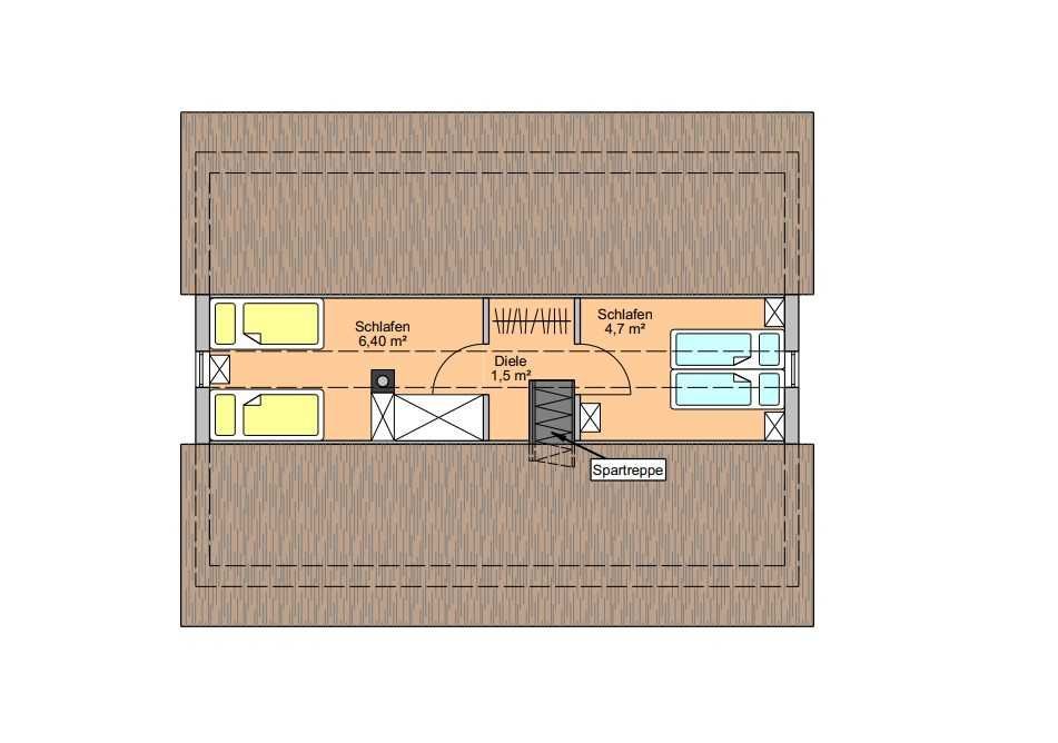 Eine steile Leitertreppe führt ins Dachgeschoss mit 2 Schlafzimmern unter Dachschrägen.