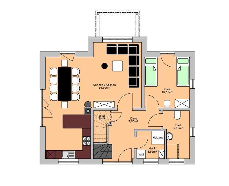 Erdgeschoss mit 1 Schlafzimmer, ebenerdig und barrierefrei.