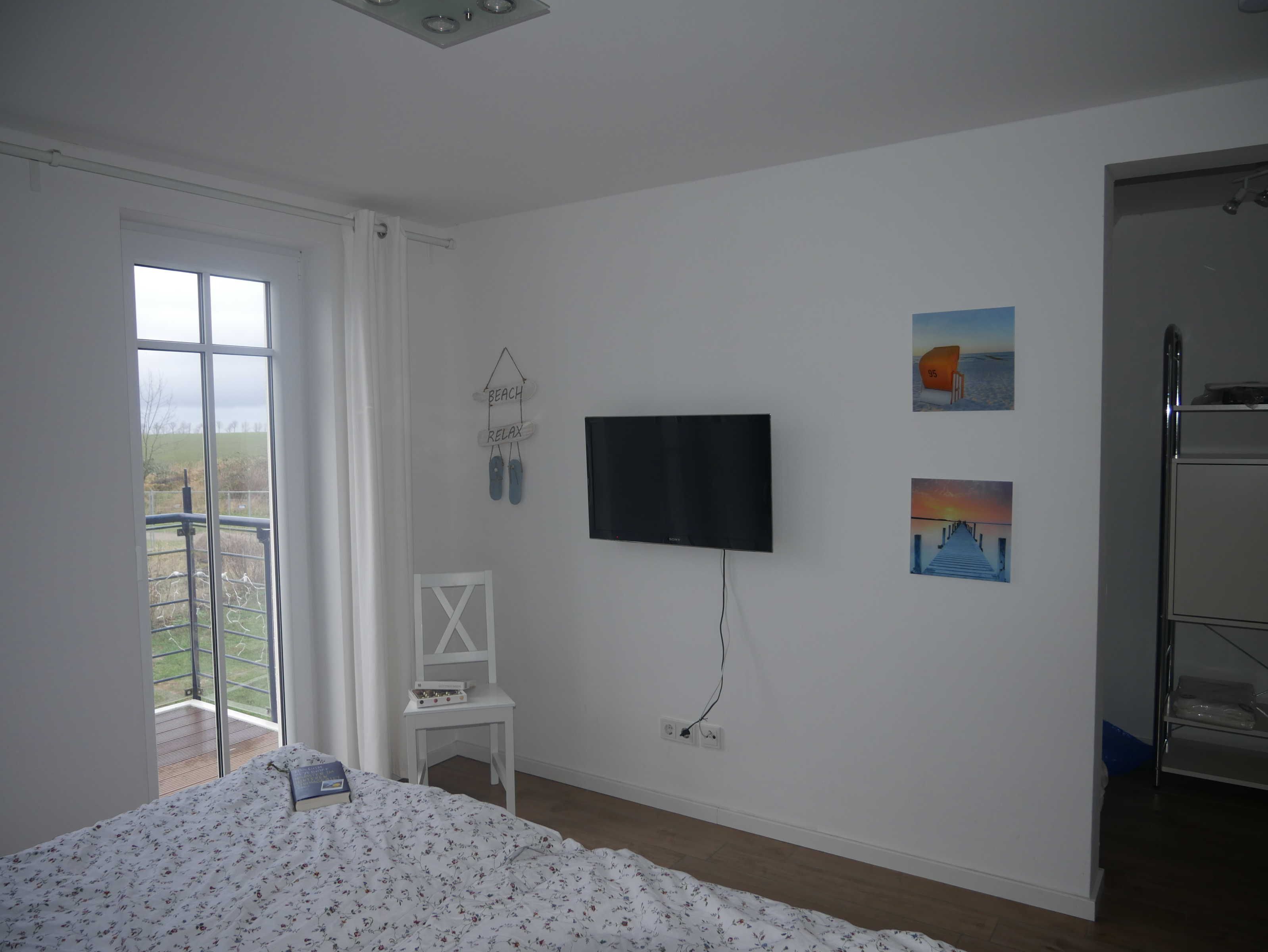 Schlafzimmer 3 mit Doppelbett (1,80m x 2m), TV, begehbarem Kleiderschrank und eigenem Balkon.