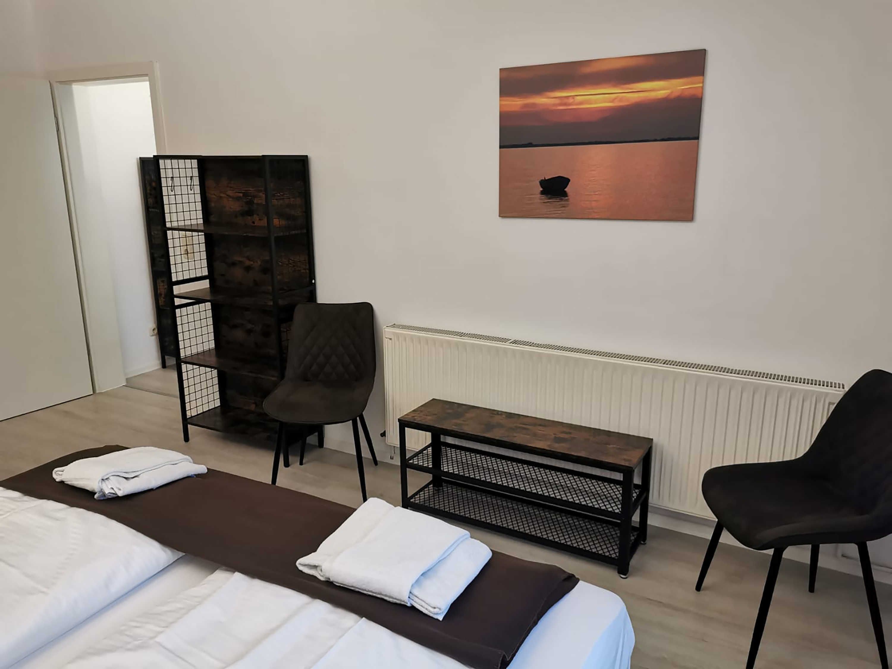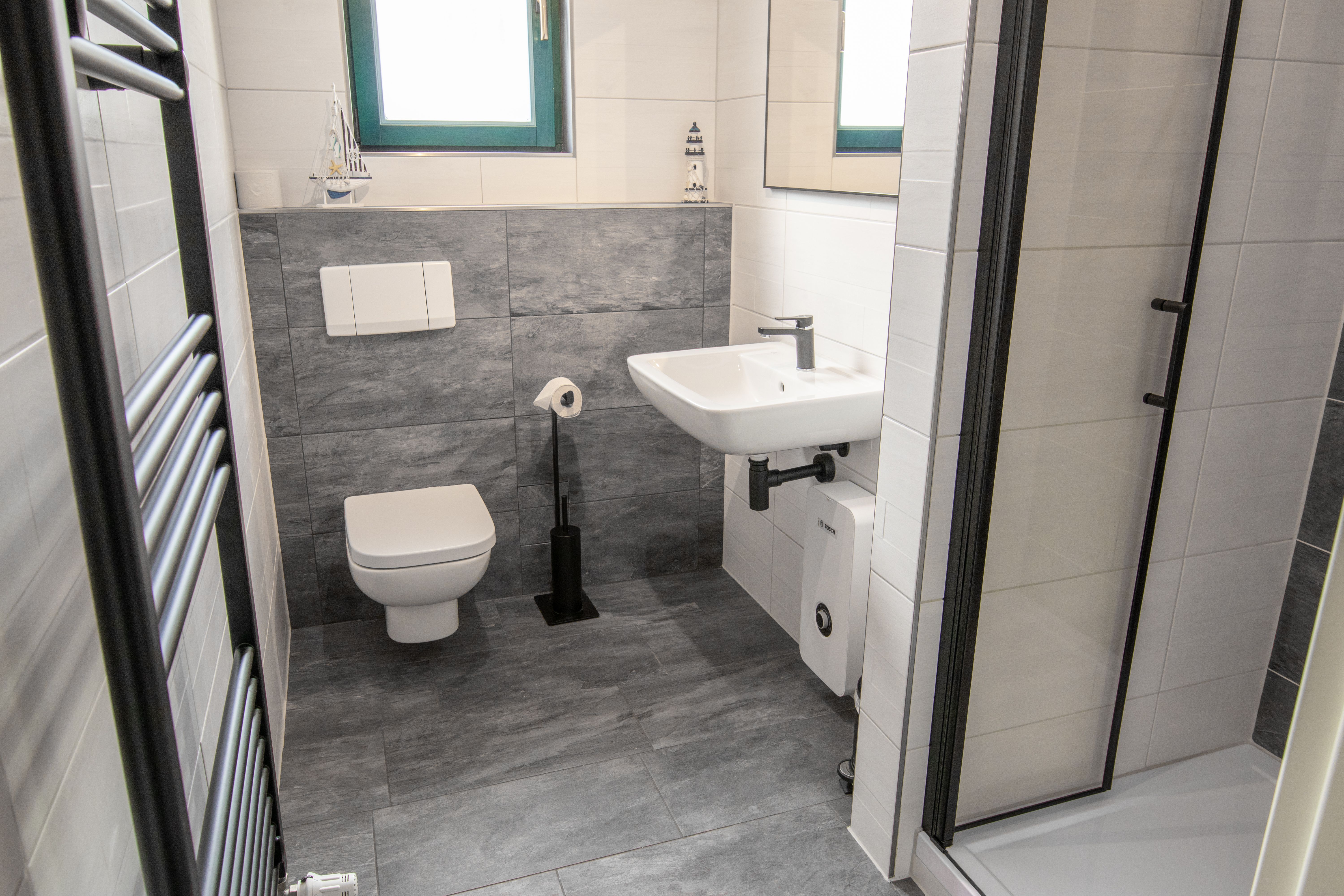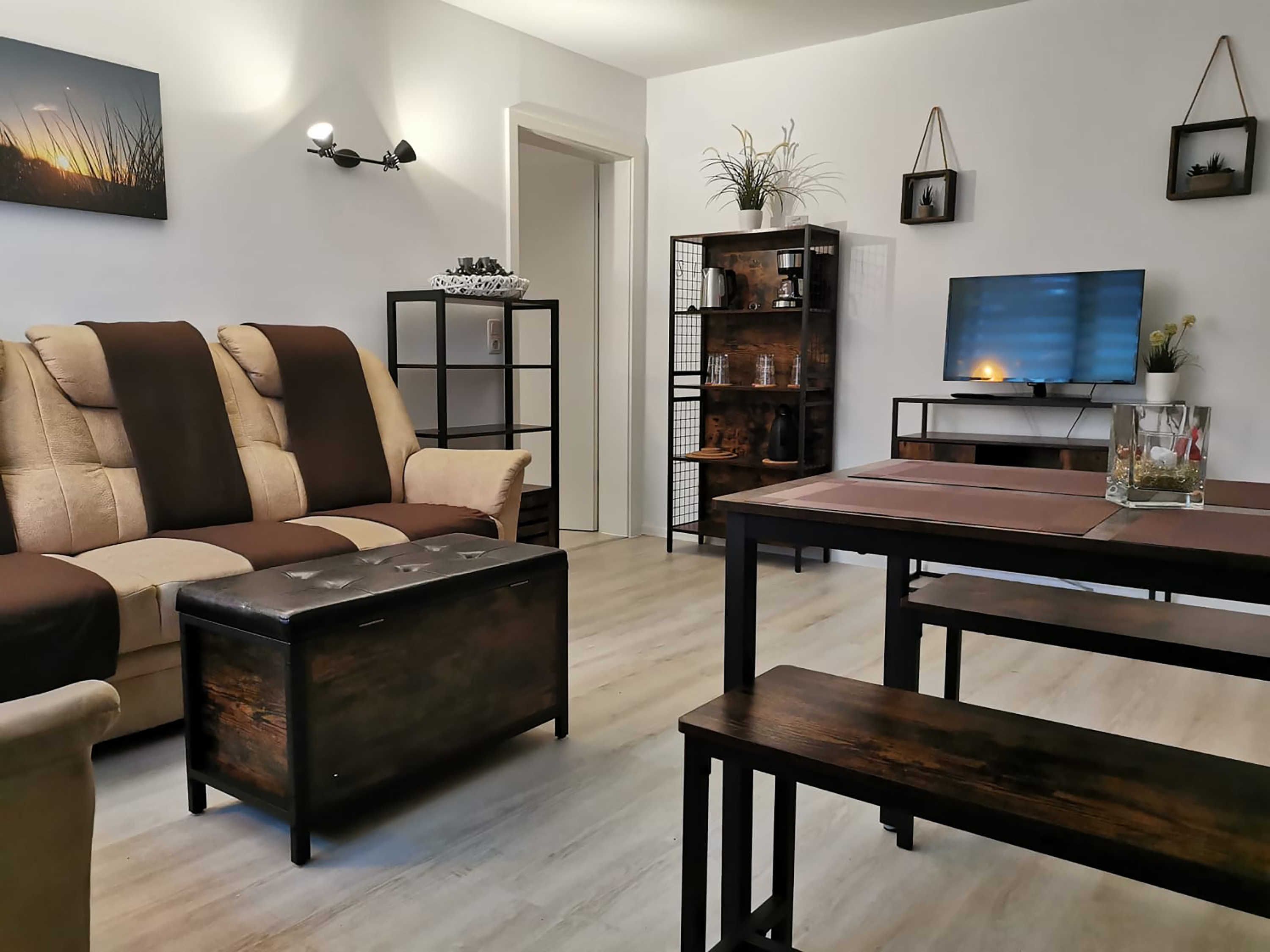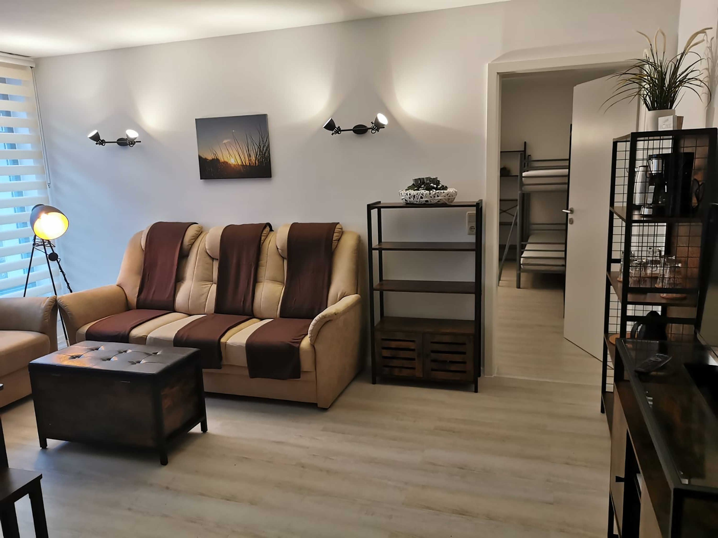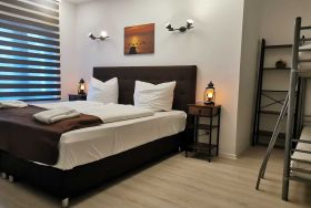 Die ca. 44 m² große Ferienwohnung mit Meerblick befindet im Gästehaus mit 5 Wohneinheiten. Sie verfügt über ein Wohnzimmer mit Küchenzeile, einem separatem Schlafzimmer, Flur, Bad mit Dusche und einer Terrasse. Das Wohnzimmer ist mit einer modernen Couch, TV, einem Esstisch und einer Küchenzeile mit Kühlschrank eingerichtet. Im Schlafzimmer befindet sich ein gemütliches Doppelbett und ein Etagenbett mit Kleiderschrank. Das freundliche Tageslichtbad hat eine Dusche und ein WC. Zum Entspannen und Sonne tanken lädt die Terrasse direkt vor der Wohnung ein.