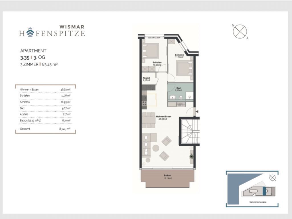 Diese im Hotelcharakter stylisch möblierte Wohneinheit in der Hafenspitze 35 ist als exklusive 3-Zimmer-Ferienwohnung ideal für bis zu 4 Personen. Die Lage ist im 3. Obergeschoss des Gebäudes. Der Fahrstuhl gleitet zum 2. Obergeschoss. Über das Treppenhaus gelangen Sie in die Wohnung mit einer Wohnfläche von 84qm. Die sonnige Loggia verwöhnt mit dem Blick auf die Hafenpromenade.
