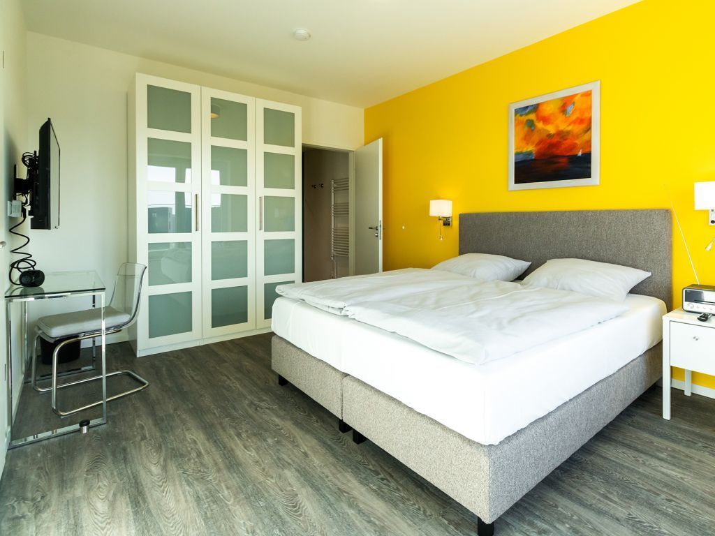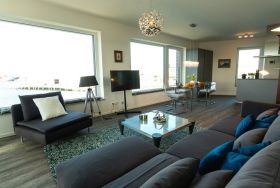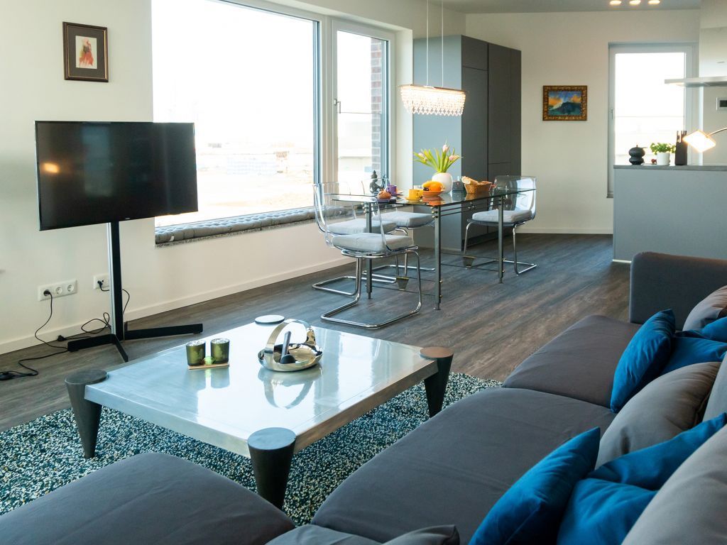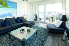 Im hellen Wohn-Essbereich mit bodentiefen Fenstern erwartet Sie eine schicke Sitzgruppe sowie eine voll ausgestattete Einbauküchenzeile mit angrenzendem Esstisch. Internetfähiges TV /Radio mit Hotelmodus ist hier ebenso selbstverständlich, wie die kostenfreie WLAN-Nutzung. Sommerliche Beschattung ermöglichen elektrisch bedienbare Außenrollos. Das Appartement kann mit bis zu 4 Personen bewohnt werden, wofür es mit idealen Bedingungen besticht. Zwei separate Schlafzimmer sind ebenso vorhanden, wie zwei sehr moderne, innenliegende Duschbäder. Somit eignet sich diese Traumwohnung auch bestens für befreundete Paare.