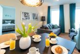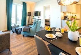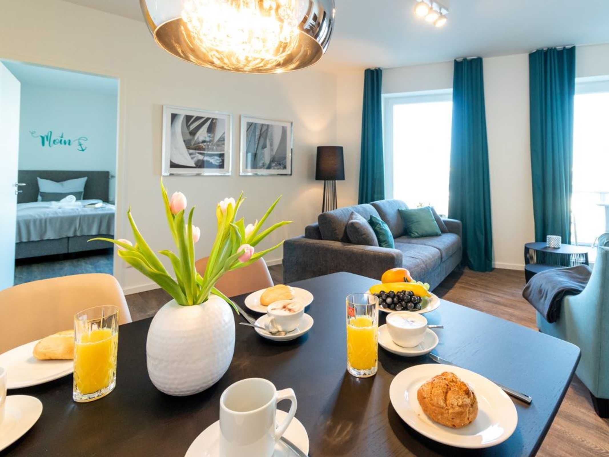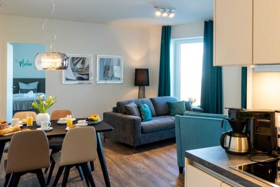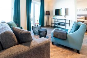 Internetfähiges Fernsehen mit Hotelmodus sowie ein Internetradio stehen ebenso zur Verfügung, wie kostenfreie WLAN-Nutzung. Das schicke Appartement bietet zudem einen saisonal möblierten Balkon in nördliche Ausrichtung, von dem Sie auf das Meer sowie den Holzhafen schauen. Die Belegung dieser Wohneinheit ist ideal für bis zu 3 Personen, da die großzügige Aufteilung mit zwei separaten Schlafzimmern nahezu ideal ist.