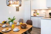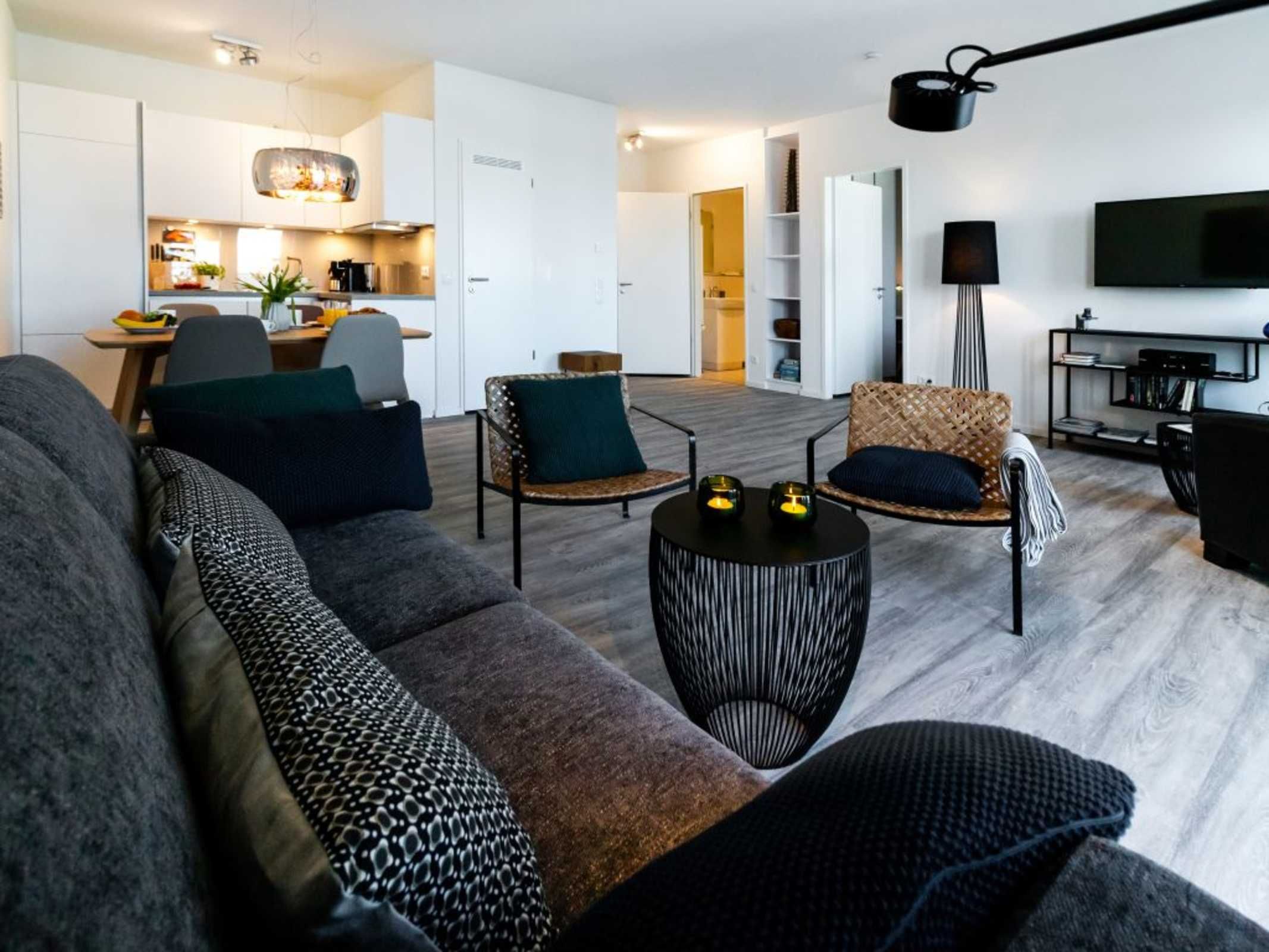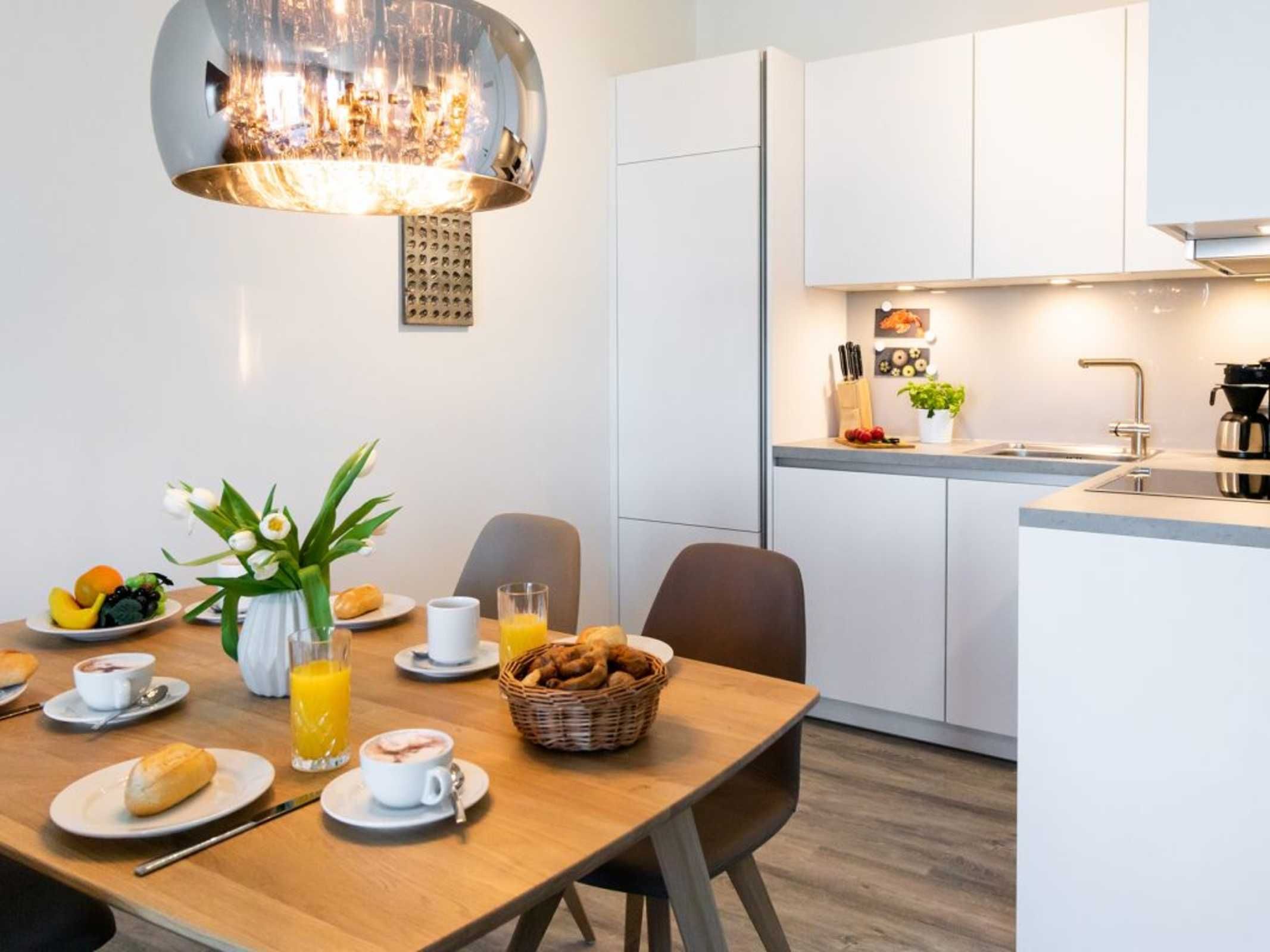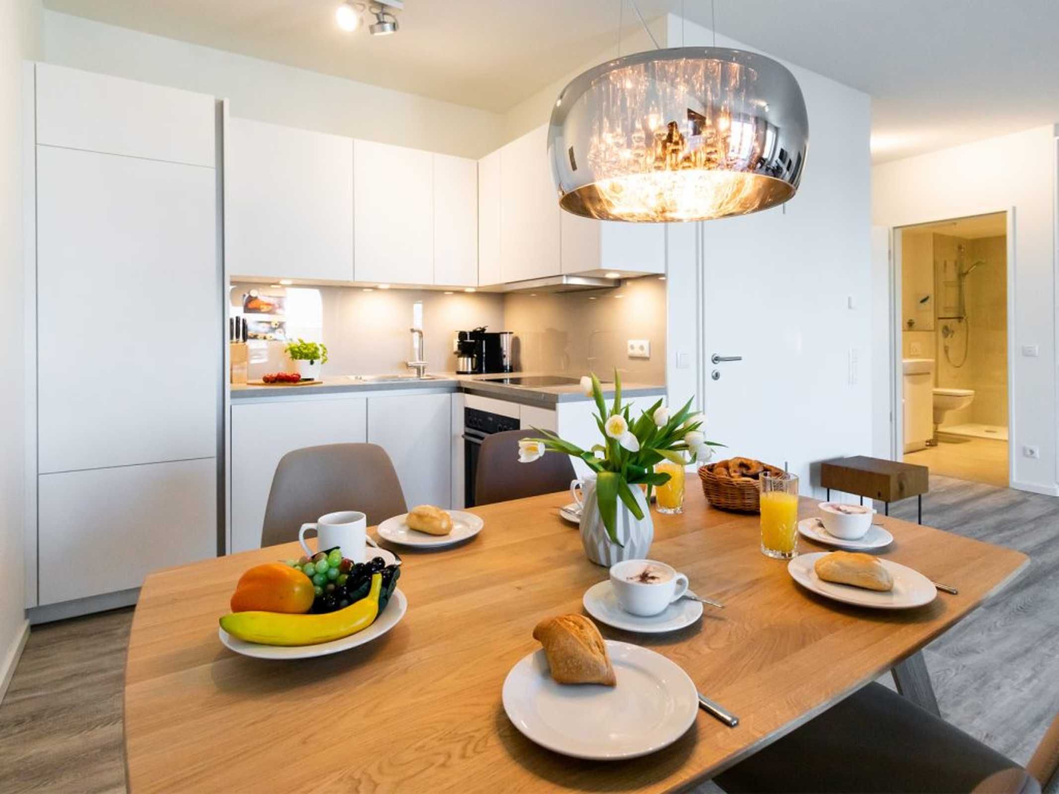 Internetfähiges TV sowie Internet Radio auch kostenfreies WLAN sind vorhanden. Die offene Küchenzeile ist in den Wohnraum integriert und voll ausgestattet mit Ceranherd, Backofen, Mikrowelle, Spülmaschine. Auch eine Kaffeemaschine, Wasserkocher und Toaster stehen bereit. Somit entscheiden Sie nach Bedarf, ob eine Selbstversorgung gewünscht ist, oder ob Sie sich ein einem der nah gelegenen Restaurants verwöhnen lassen möchten. Nach einem erlebnisreichen Tag nächtigen Sie in einem großzügigen Schlafzimmer mit Garderobenschrank.