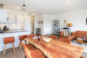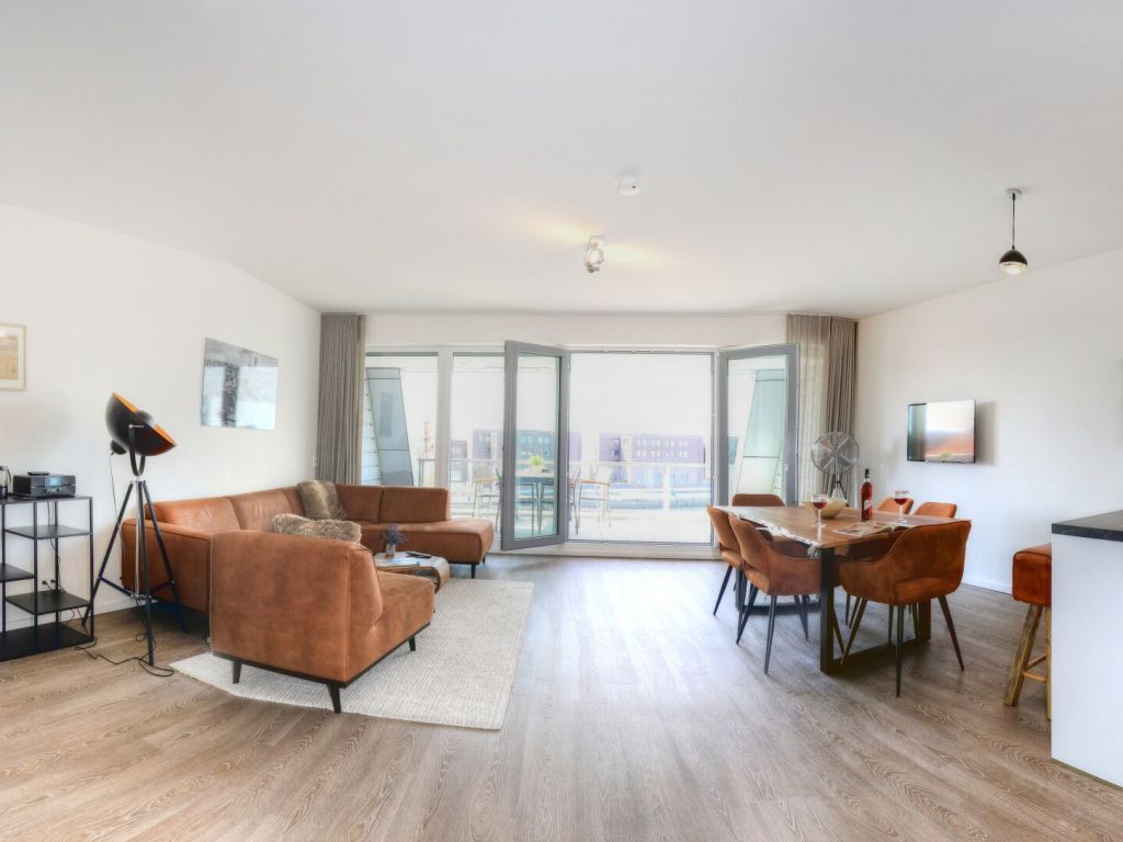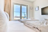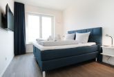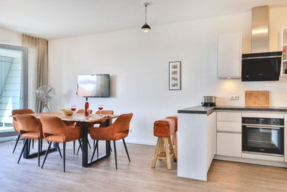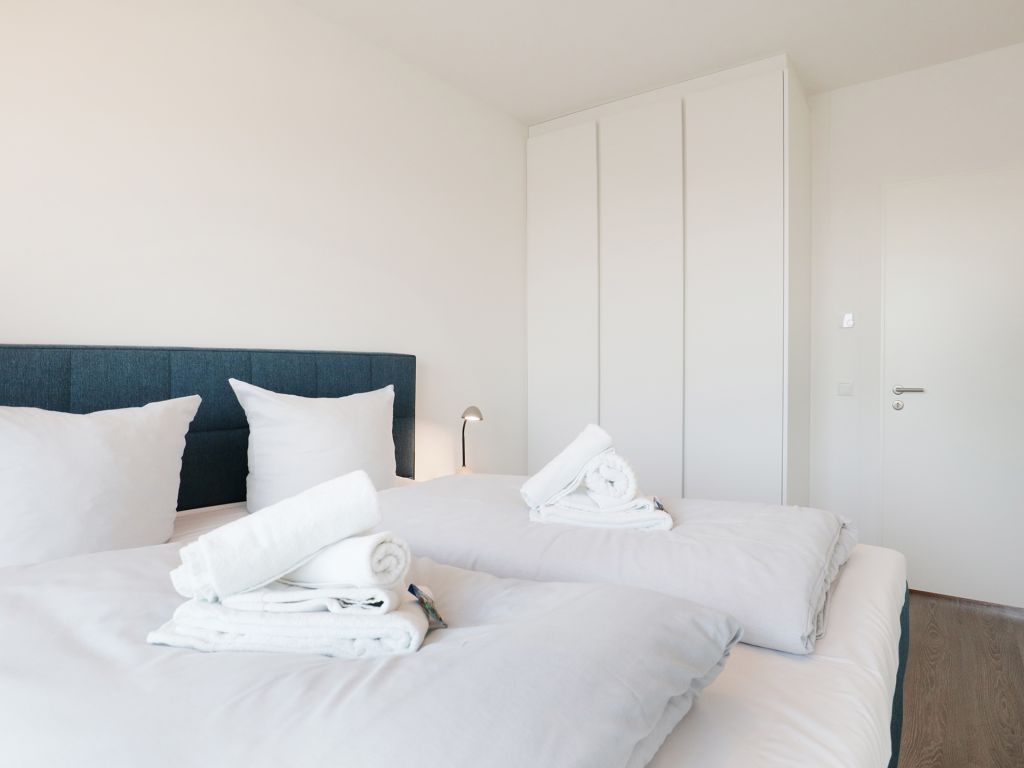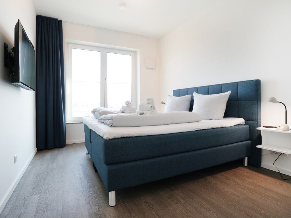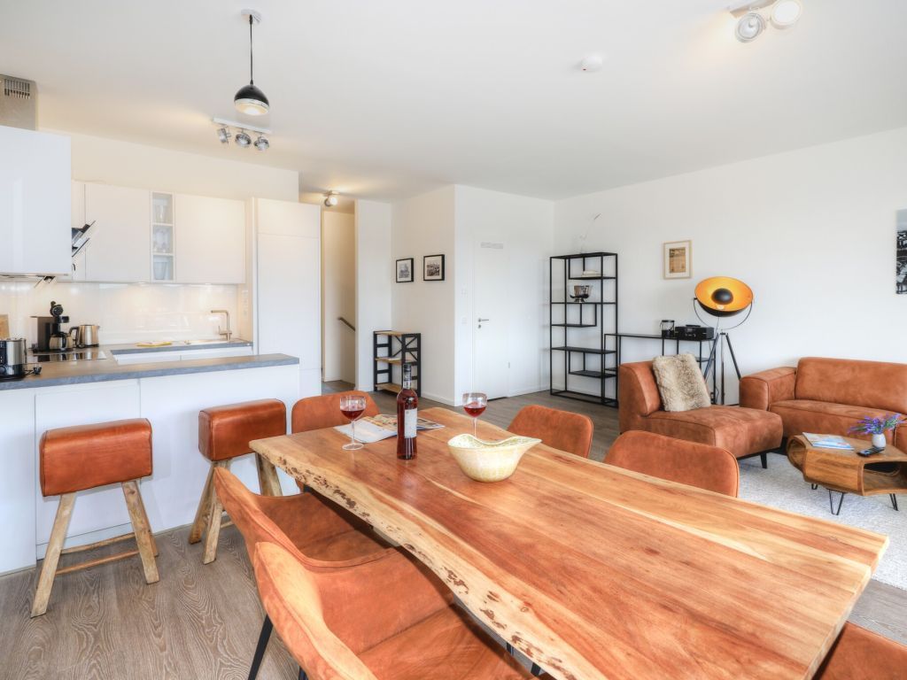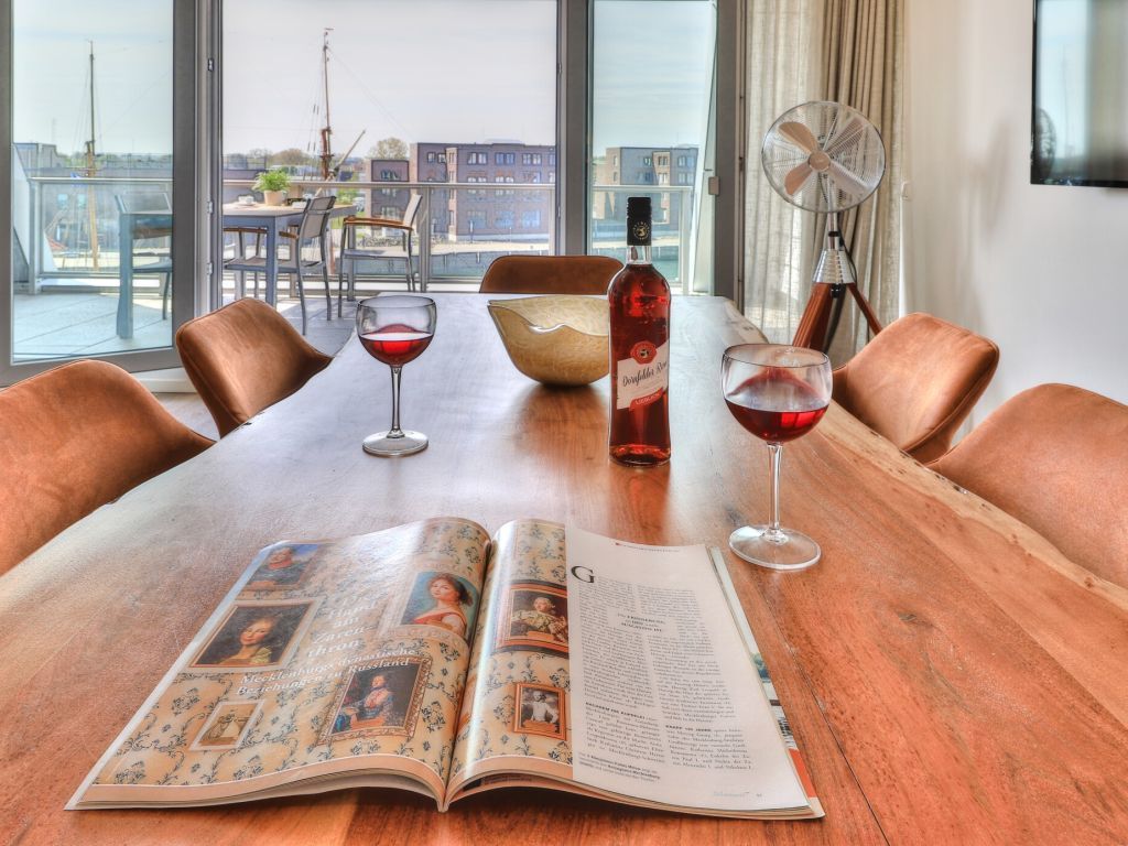 Sie betreten die Wohnung im 3. Obergeschoss des Gebäudes und gelangen über eine separate, in der Wohnung liegende Treppe, den schick möblierten Wohn/-Essbereich mit Esstisch sowie integrierter und voll ausgestatteter Wohnküche. Vom gemütlichen Wohnbereich mit Internetradio, Flachbild Fernseher mit Hotelmodus und kostenfreiem WLAN, gelangen Sie auf die Loggia in südwestliche Richtung. Von hier genießen Sie einen schönen Blick auf den Hafen. Das lichtdurchflutete Appartement verfügt zudem über zwei geräumige Schlafzimmer mit bodentiefen Fenstern.