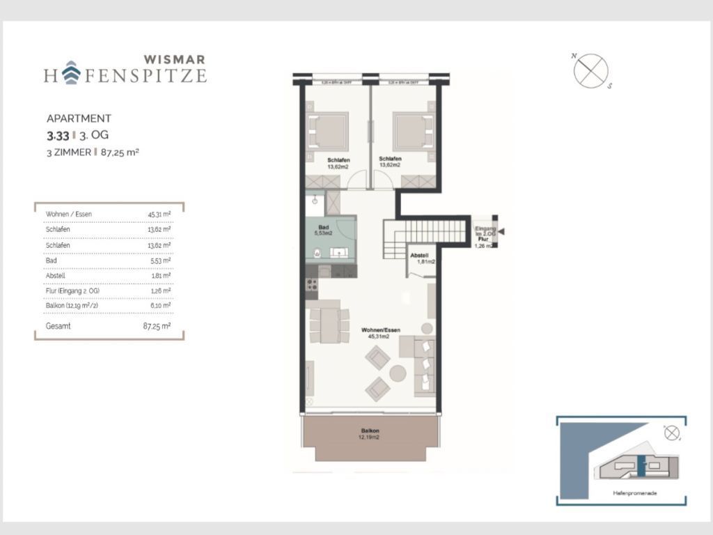 Die 3-Zimmer Maisonetten Ferienwohnung Hafenspitze 33 befindet sich im 3. Obergeschoss des Hauses. Der sonnige Balkon bietet Aussicht auf die Hafenpromenade. Die Wohnung besitzt eine Wohnfläche von 88qm. Eine voll ausgestattete Wohnküchenzeile ist integriert. Zwei separate Schlafzimmer sowie ein modernes Duschbad sind vorhanden. Eine Belegung ist mit maximal 4 Personen möglich. Ihr Hund ist herzlich willkommen. Bei Ihrer Ankunft sind die Betten für 2 Personen bereits bezogen. Handtücher/Duschtücher sind ebenfalls für 2 Personen inklusive. Weitere Wäschepakete sind zu buchbar. Es handelt sich um eine Nichtraucherwohnung. Haustiere sind gestattet. Gegen Gebühr können Sie im Hafenparkhaus in ca. 300 Meter Ihr Fahrzeug abstellen.