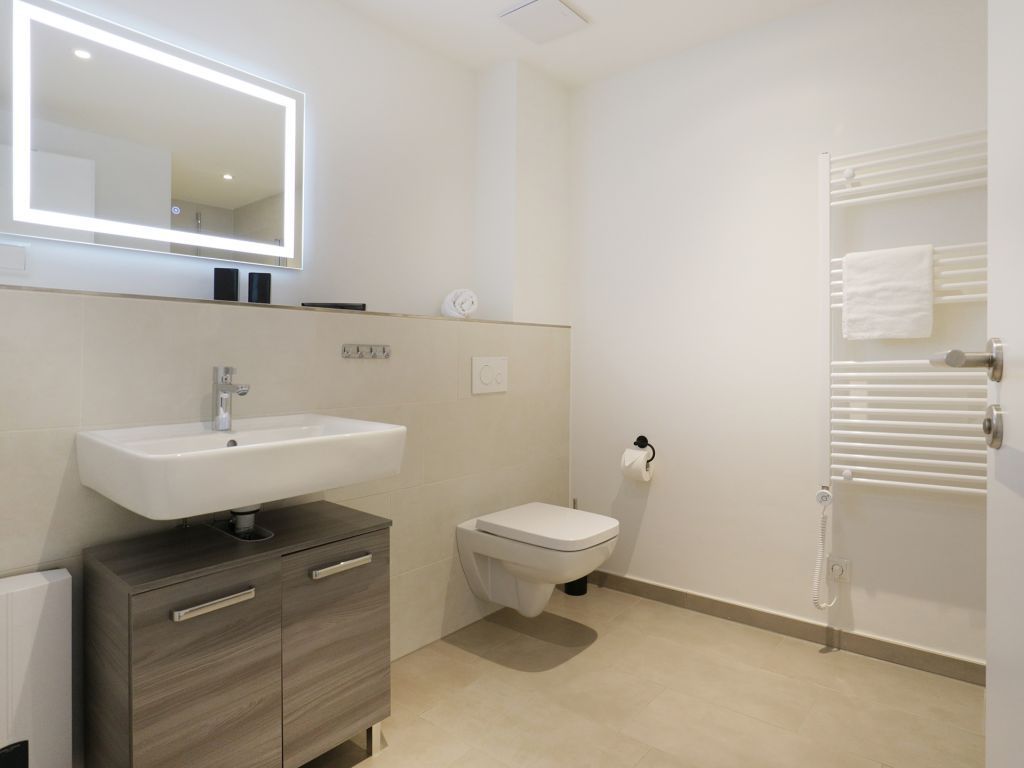 Die Fenster der Wohnräume bieten durch elektrisch bedienbare Außenrollos sommerlichen Wärmeschutz. Zugehörig ist selbstverständlich ein modernes Badezimmer mit ebenerdiger Dusche, Waschtisch, WC, Handtuchheizkörper und Fußbodenheizung. Bei Ihrer Ankunft sind die Betten für 2 Personen bereits bezogen und Hand/Duschtücher liegen ebenfalls als inklusive Leistung für 2 Personen bereit. Weitere Wäschepakete sind gegen Gebühr zu buchbar.