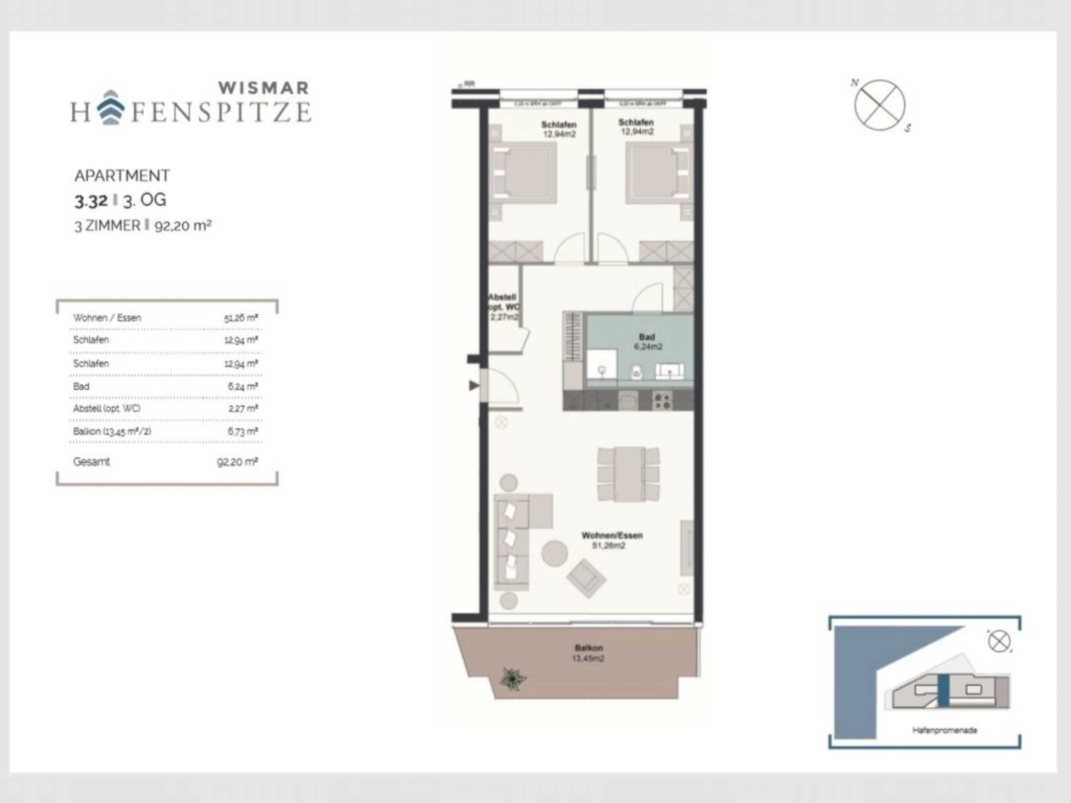 Die große 3-Zimmer-Ferienwohnung Hafenspitze 32 befindet sich im 3. Obergeschoss des Hauses, wohin Sie bequem mit dem Personenaufzug gelangen. Die großzügige Loggia bietet einen schönen Hafenblick. Die Wohnung besitzt eine Wohnfläche von 93qm. Eine voll ausgestattete Wohnküchenzeile ist integriert. Zwei separate Schlafzimmer sowie ein modernes Duschbad und auch ein Gäste-WC sind vorhanden. Eine Belegung ist mit maximal 4 Personen möglich. Bei Ihrer Ankunft sind die Betten für 2 Personen bereits bezogen. Handtücher/Duschtücher sind ebenfalls für 2 Personen inklusive. Weitere Wäschepakete sind zu buchbar. Es handelt sich um eine Nichtraucherwohnung. Gegen Gebühr können Sie im Hafenparkhaus in ca. 300 Meter Ihr Fahrzeug abstellen.