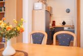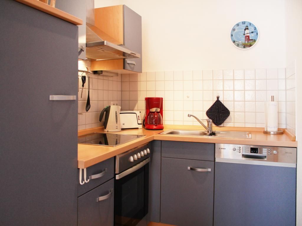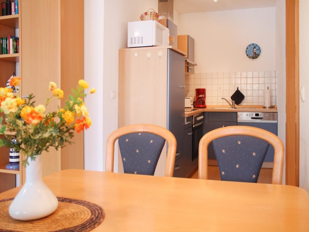 Die in den Wohnbereich integrierte Küchenzeile ermöglicht die Eigenversorgung: Herd, Backofen, Mikrowelle, Dunstabzug, Kühlschrank mit integr. Frostfach, Toaster, Kaffeemaschine, Wasserkocher, Geschirrspüler usw. sind vorhanden. Während der wärmeren Jahreszeit genießen Sie den saisonal möblierten Balkon in Ausrichtung Süd.