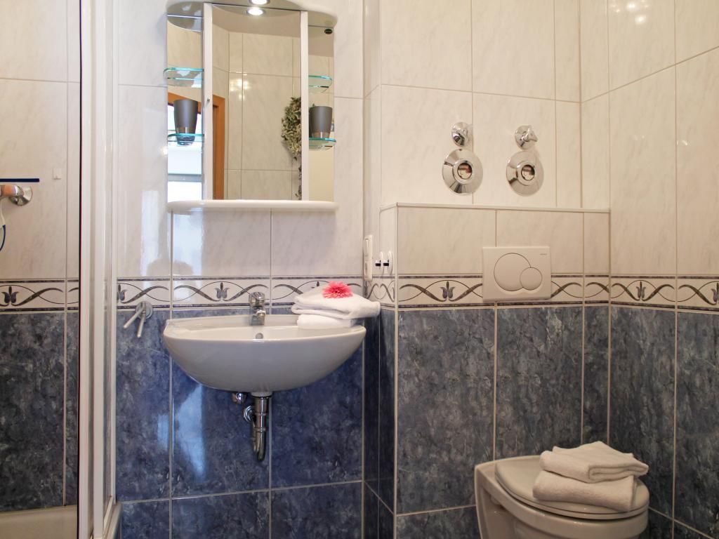 Zugehörig ist ein komfortables Duschbad mit Waschtisch, WC.