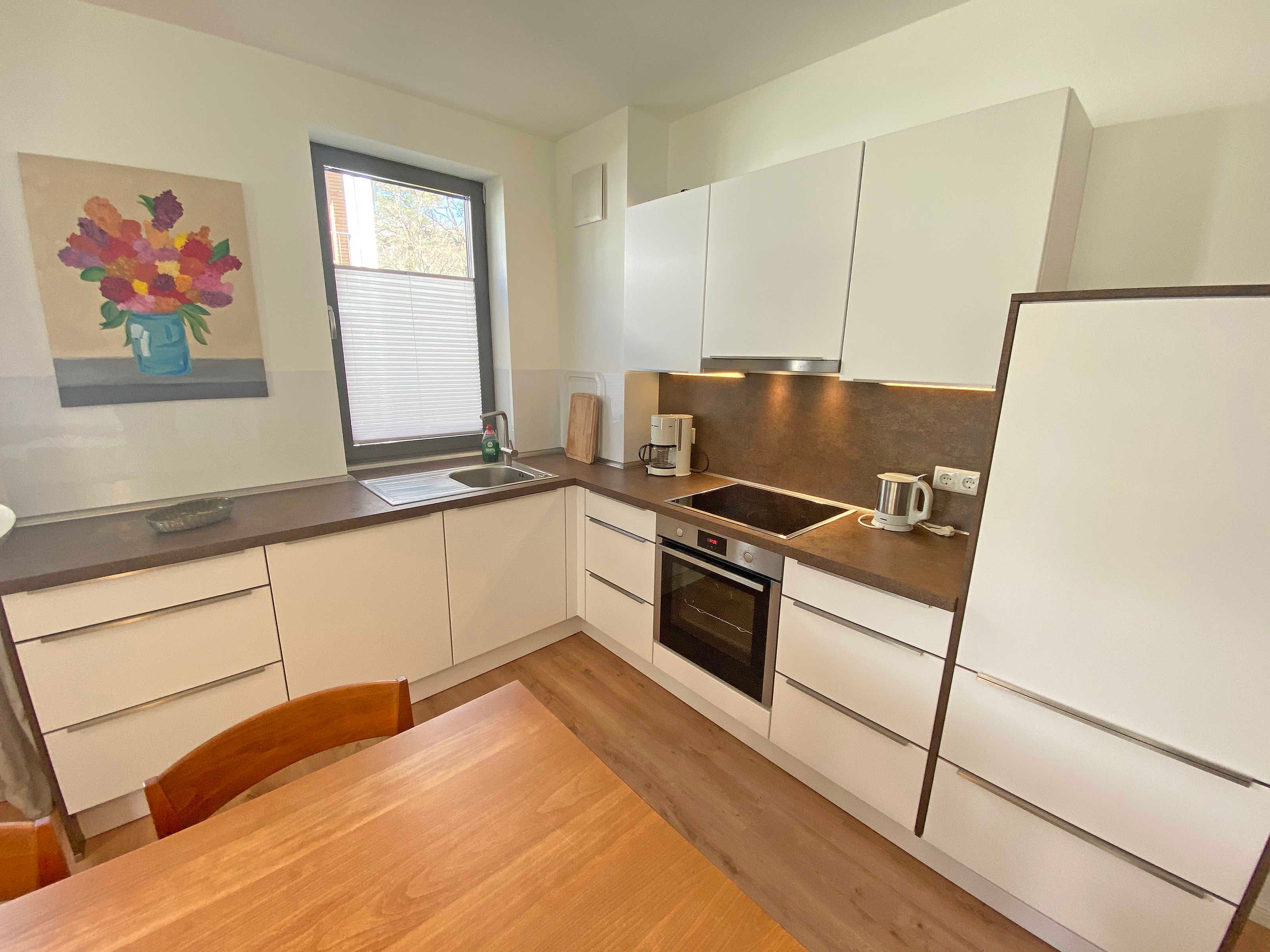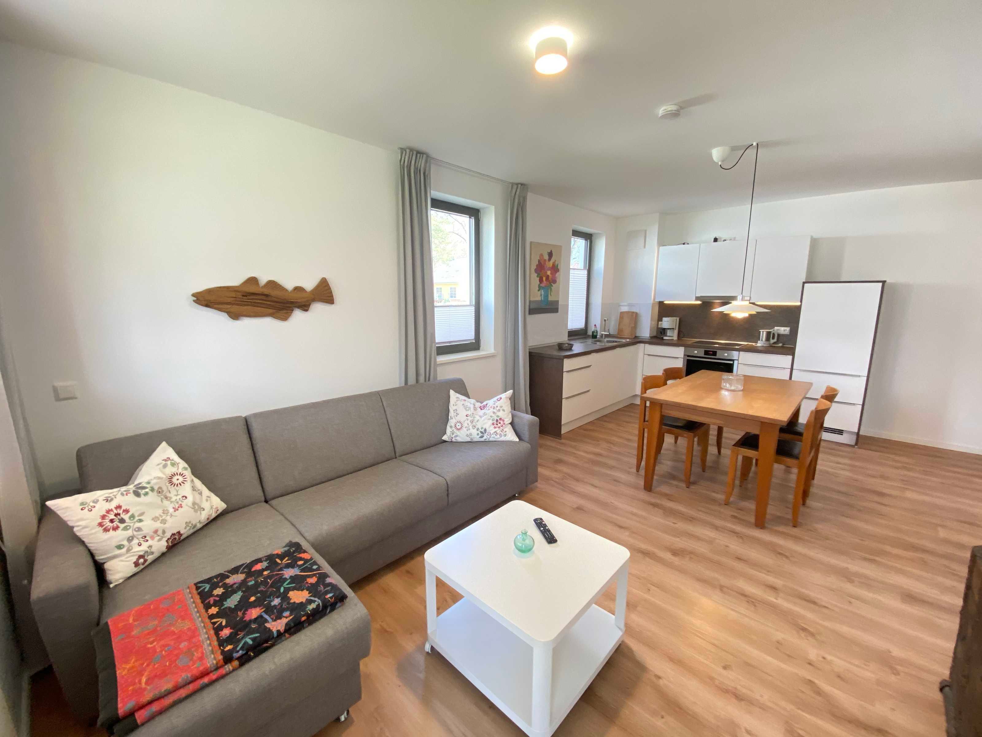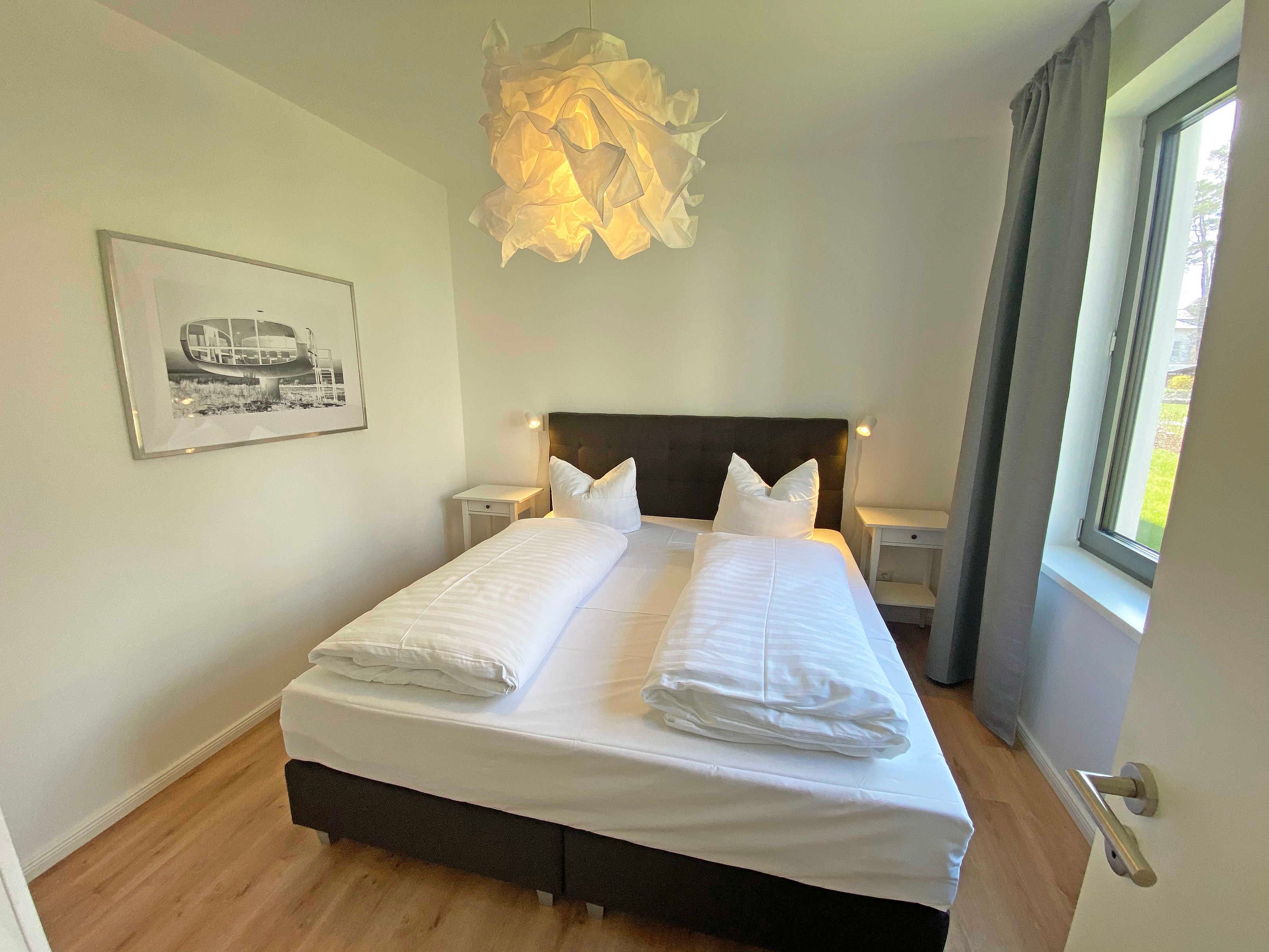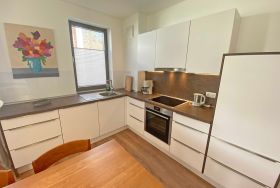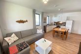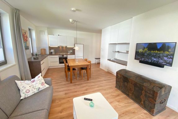 Die Nichtraucherwohnung umfasst ca. 61 m² und bietet als 2-Raumwohnung ausreichend Platz für maximal 2 bis 4 Personen. Über einen kleinen Flur mit Garderobe erreichen Sie den offenen Wohnbereich mit angrenzender Küchenzeile. Der Wohnbereich wird durch eine bequeme Couch (1,40m x 2,00m), einen mobilen Couchtisch sowie einen Smart-TV mit Denon-Soundbar abgerundet. Ein inklusiver Internetanschluss per WLAN steht Ihnen zusätzlich zur Verfügung, über das u.a. per Sono-App Musik gestreamt werden kann. Die moderne Küchenzeile mit Backofen, Kühlschrank mit Gefrierfach, Spülmaschine, Cerankochfeld, Wasserkocher, Kaffeemaschine, Espressokocher und Toaster fügt sich mit einem massiven Holzesstisch sowie lederbezogene Essstühle an. Vom Wohnbereich gelangen Sie auf Ihre bestuhlte Terrasse (Süd/West). Das Schlafzimmer wurde mit einem Boxspringbett (1,80m x 2,00m), Beistelltischen mit Nachtlicht, einen Kleiderschrank ausgestattet. Durch lichtdichte Vorhänge sowie Insektenschutzgitter steht einem angenehmen Schlaf nichts im Wege. Das innenliegende Bad verfügt über einen Waschtisch, einen beheizten und beleuchteten Spiegel, Handtuchheizung, Fön, Kosmetikspiegel, WC sowie eine große ebenerdige Klarglas-Dusche mit Regenduschkopf. Alle Räumlichkeiten sind mit einer separat regulierten Fußbodenheizung ausgestattet. Von Ihrem Tiefgaragenstellplatz (Nr.80, Einfahrtshöhe 2,15m) gelangen Sie bequem mit dem Aufzug zu Ihrer Ferienwohnung. Im Kellerraum Nr.13 haben Sie die Möglichkeit Strandgeräte, Fahrräder etc. einzuschließen. Haustiere sind nicht erlaubt. Die Erstausstattung eines Wäschepaketes (komplette Bettwäsche, 1 Duschhandtuch, 2 kleine Handtücher) können Sie bis 14 Tage vor Anreise gegen einen Aufpreis dazu buchen oder durch eigene ergänzen. Ab 2 gebuchten Paketen erhalten Sie einmalig 1 Geschirrhandtuch und 1 Duschvorleger hinzu.