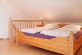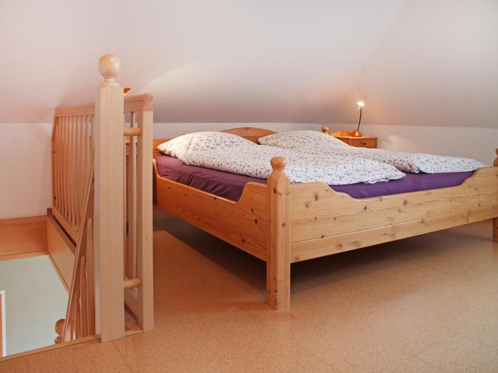 Über eine steile Treppe gelangen Sie in den oberen Wohnungstrakt mit zwei weiteren Schlafzimmern. Eines mit einem ausziehbaren Kojen Bett, Kleiderschrank. Das weitere als offener Galerieraum mit Doppelbett. Die familienfreundliche Ausstattung beinhaltet einen Kinderhochstuhl, Kinderbett.