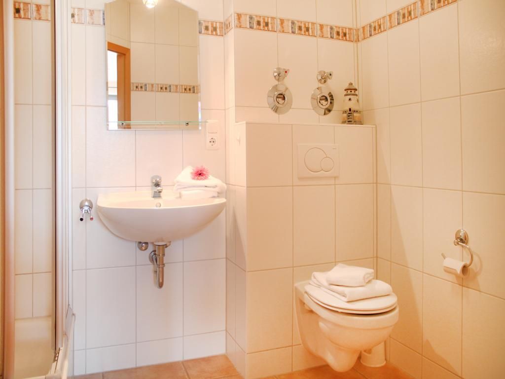 Zudem befindet sich auf der Wohnebene ein separates Schlafzimmer mit zwei Einzelbetten und Kleiderschrank. Ebenso ist ein kleines Duschbad mit Waschtisch und WC auf dieser Ebene vorhanden.