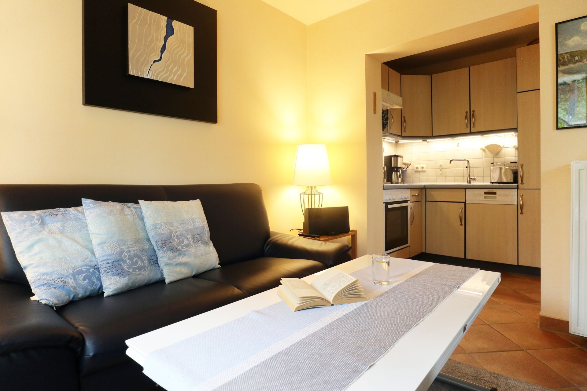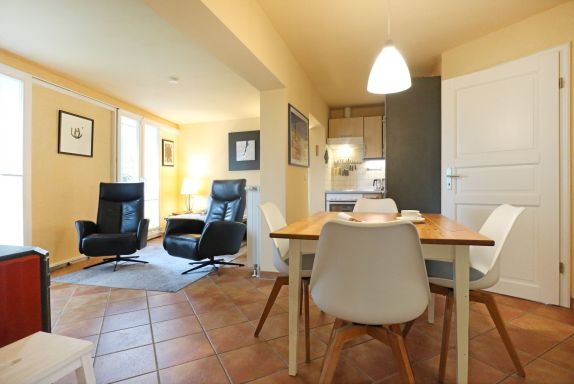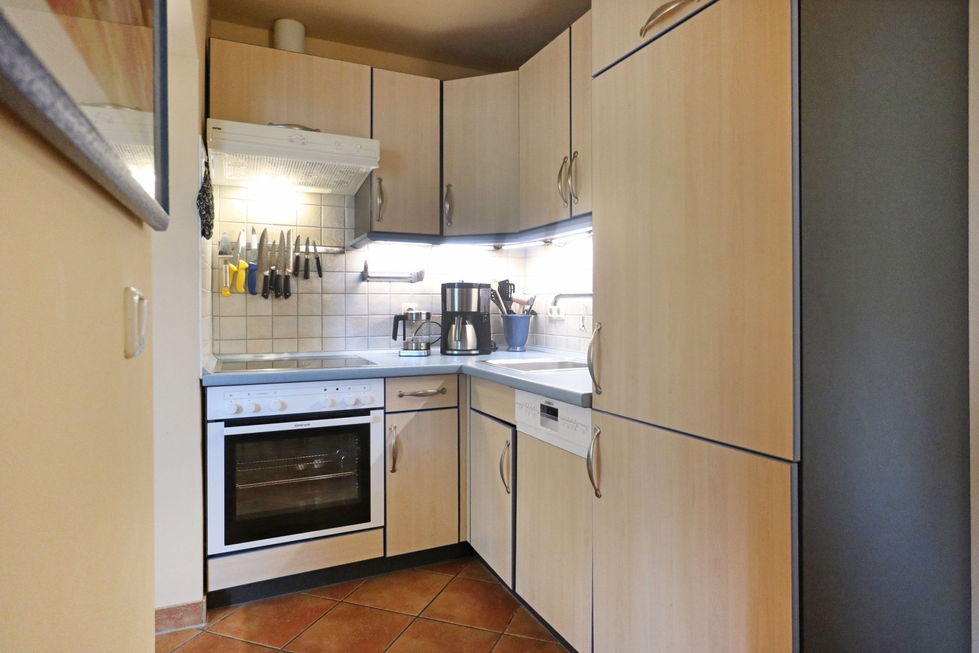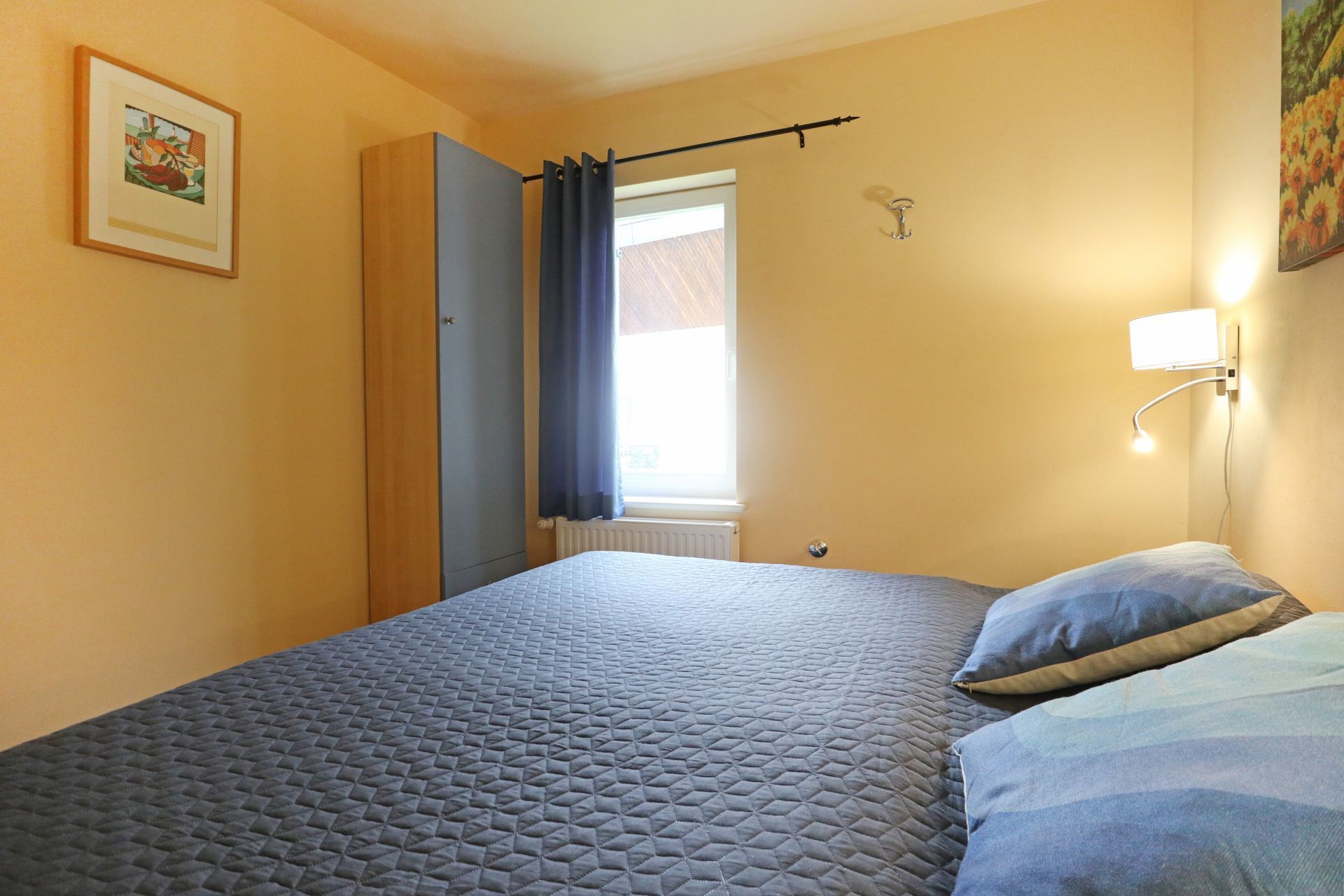 Die integrierte Küchenzeile ist ausgestattet mit Ceranfeldherd, Backofen, Dunstabzugshaube, Kühlschrank mit Gefrierfach, Spülmaschine sowie Kaffeemaschine, Toaster, Wasserkocher usw. Für gemeinsame Mahlzeiten befindet sich ein großer Esstisch im Wohnbereich. Entspannte Nächte ermöglichen Ihnen zwei separate Schlafzimmer 1x mit Doppelbett und Kleiderschrank, 1x mit zwei Einzelbetten und Kleiderschrank für die Urlaubsgarderobe. Zugehörig ist ein Duschbad mit Fenster, Waschtisch, WC sowie einer Waschmaschine zur gebührenfreien Nutzung.