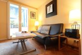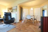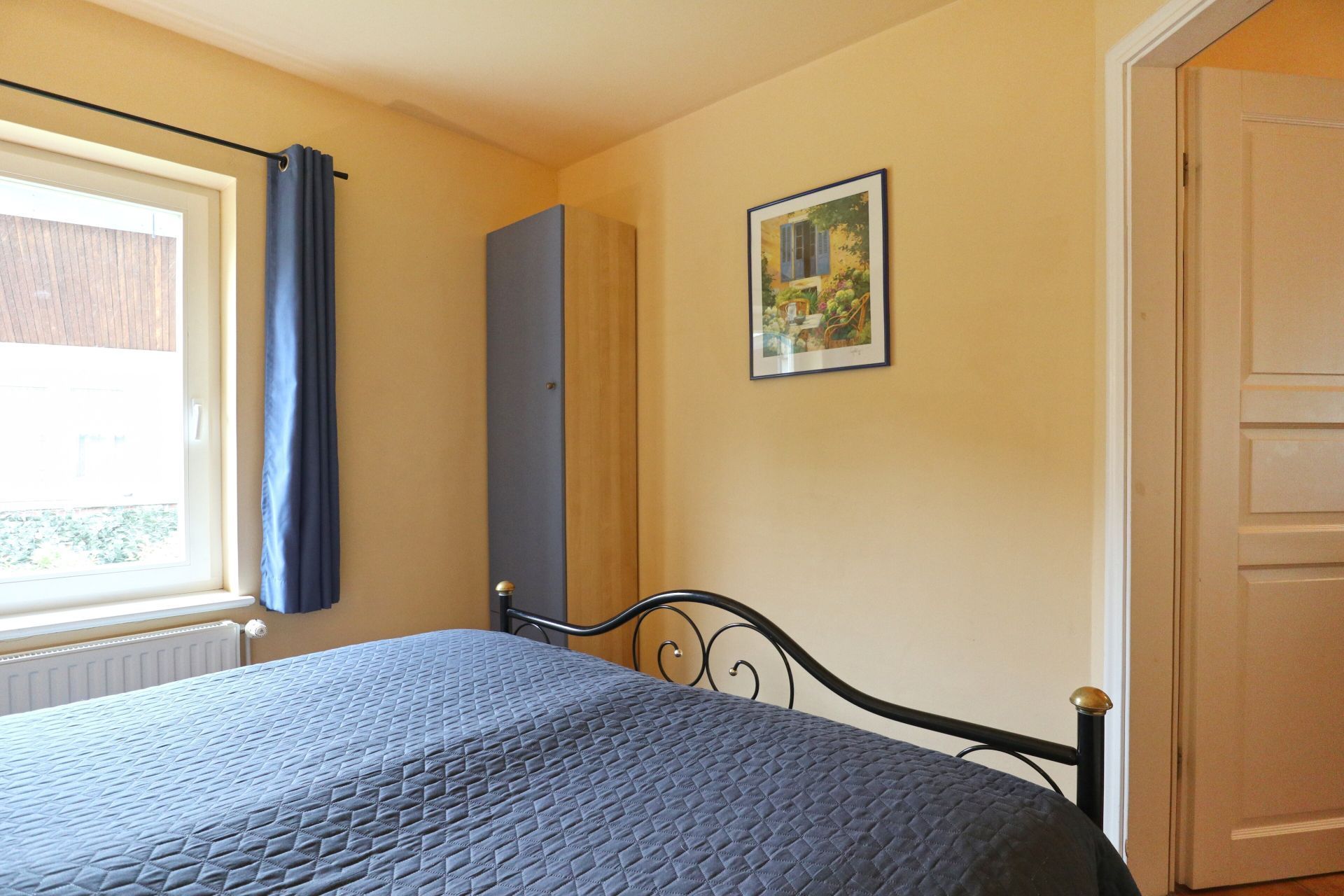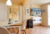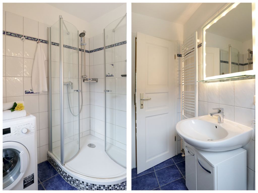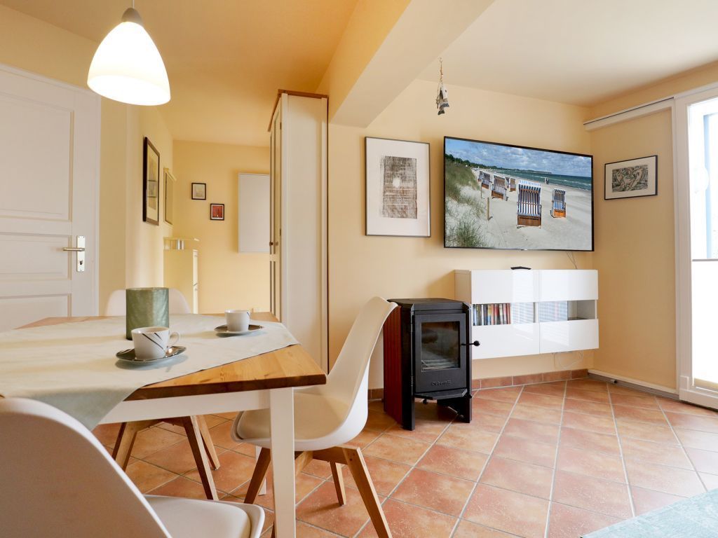Die integrierte Küchenzeile ist ausgestattet mit Ceranfeldherd, Backofen, Dunstabzugshaube, Kühlschrank mit Gefrierfach, Spülmaschine sowie Kaffeemaschine, Toaster, Wasserkocher usw. Für gemeinsame Mahlzeiten befindet sich ein großer Esstisch im Wohnbereich. Entspannte Nächte ermöglichen Ihnen zwei separate Schlafzimmer 1x mit Doppelbett und Kleiderschrank, 1x mit zwei Einzelbetten und Kleiderschrank für die Urlaubsgarderobe. Zugehörig ist ein Duschbad mit Fenster, Waschtisch, WC sowie einer Waschmaschine zur gebührenfreien Nutzung.