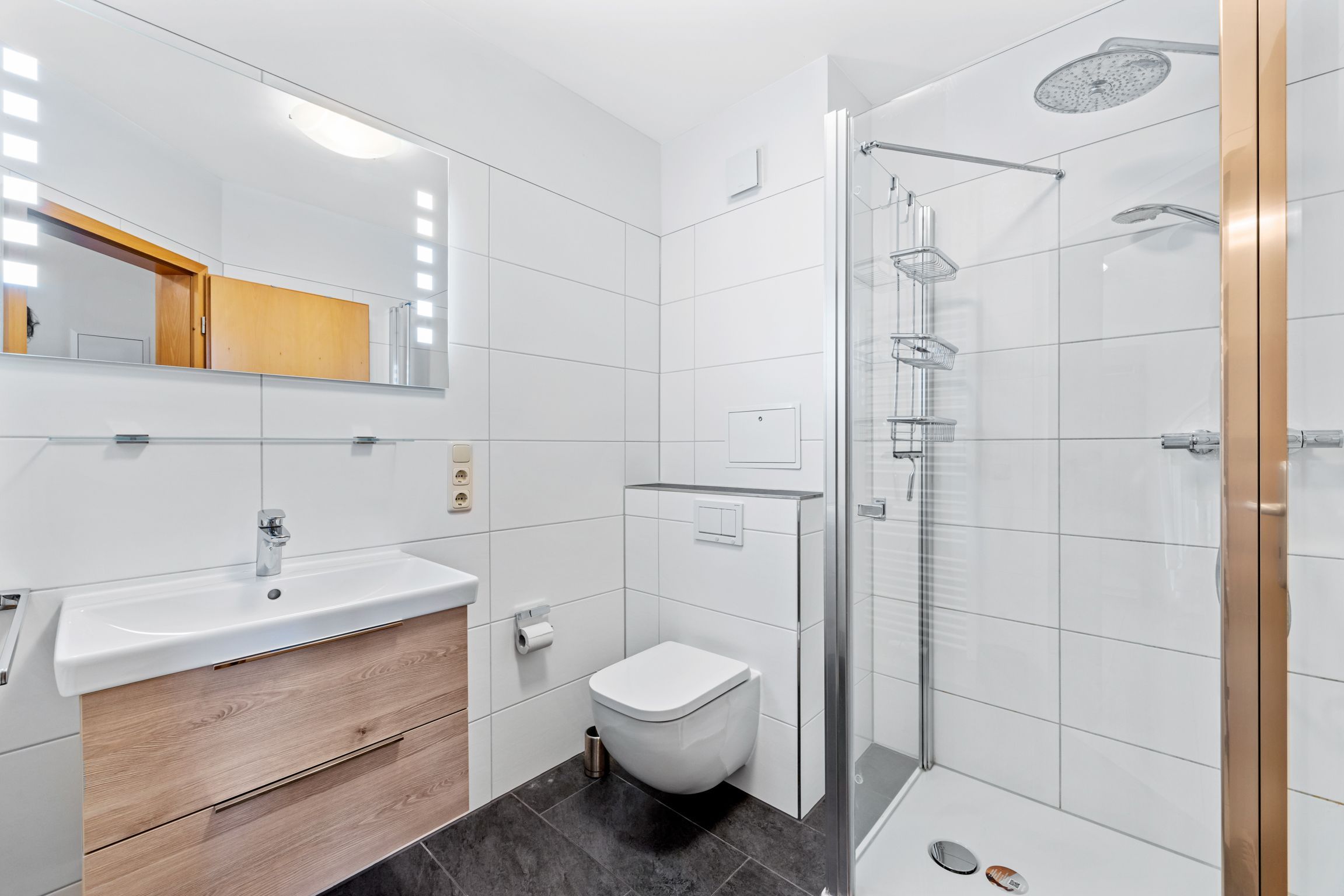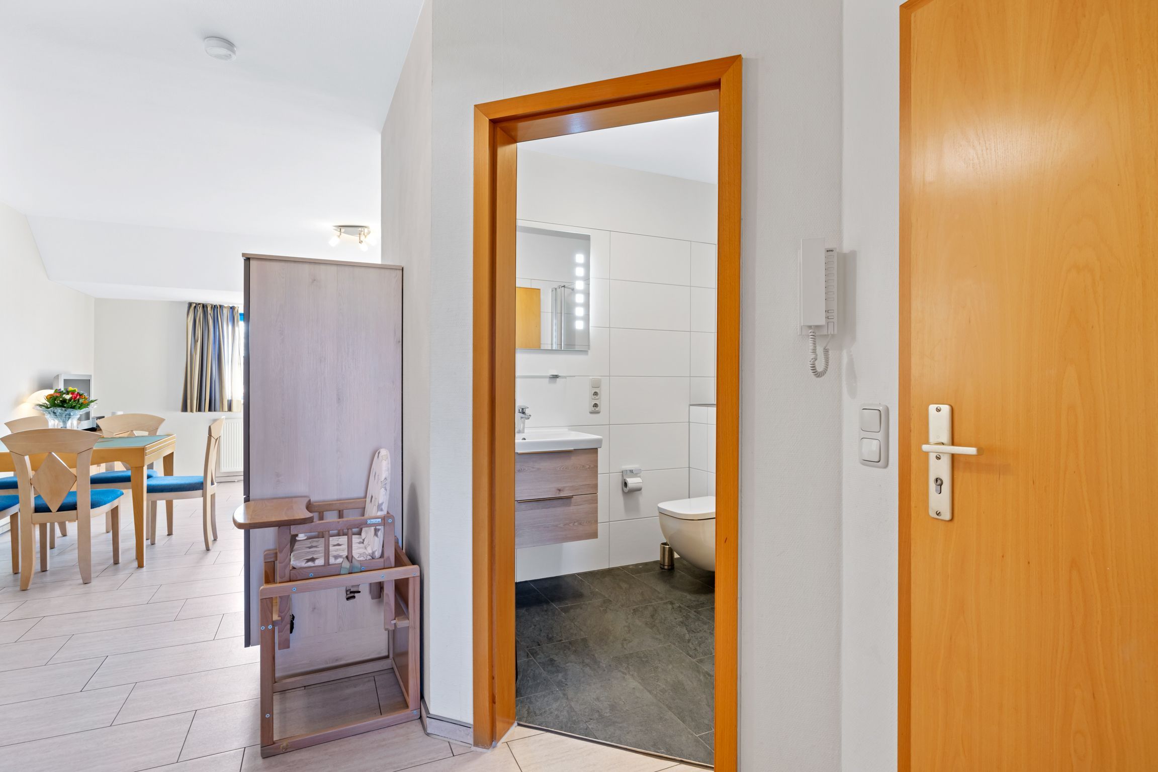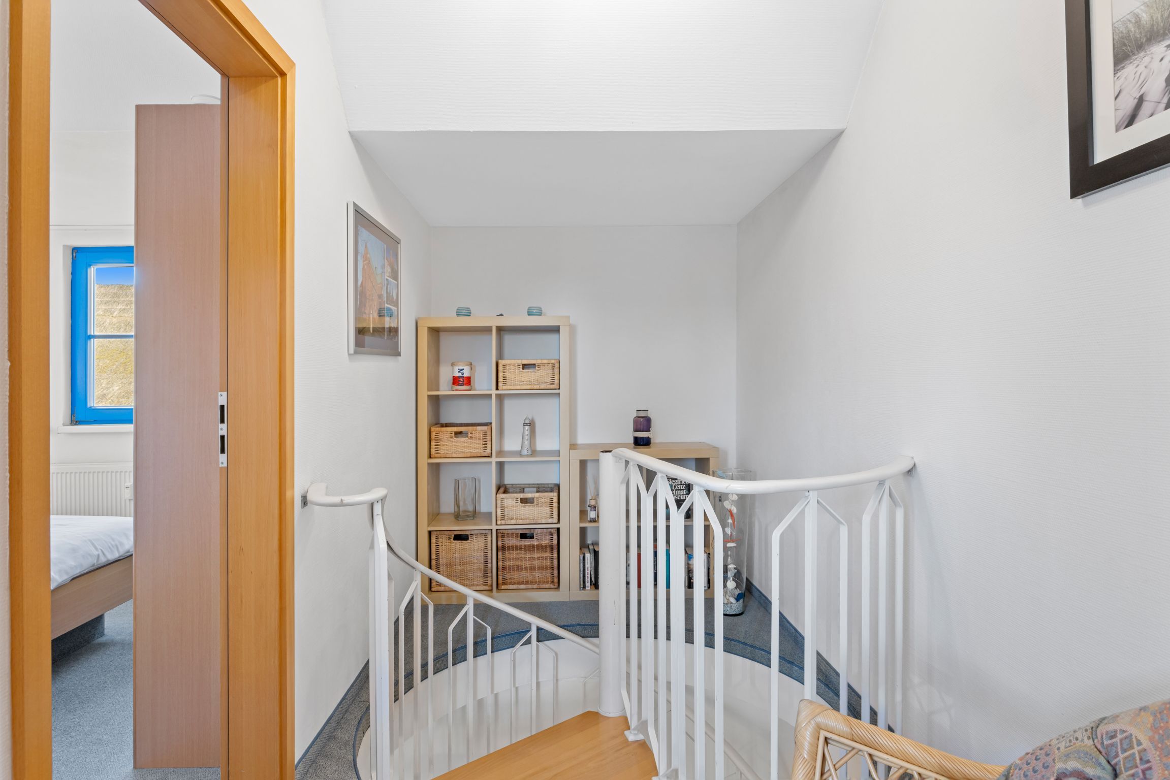 Ferienwohnung Seeschwalbe: drei separate Schlafzimmer auf zwei Etagen, großzügiger und gemütlicher Wohn- Essbereich, Bad mit Dusche und WC.