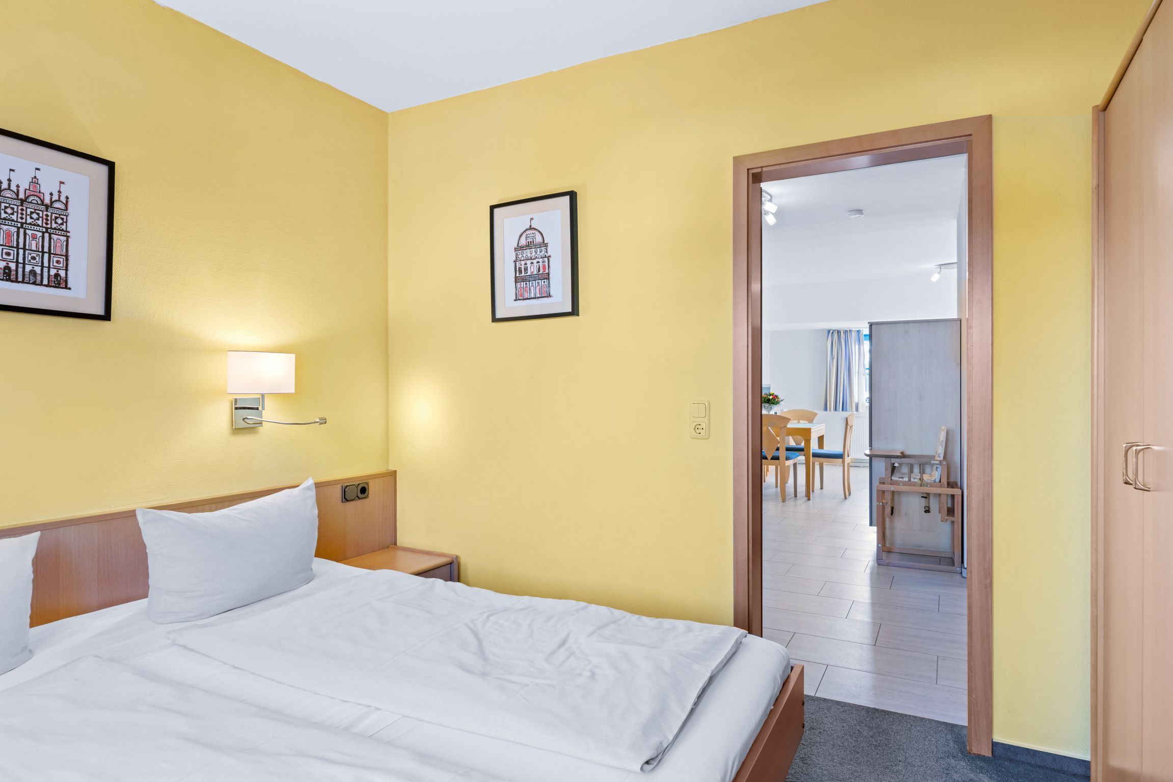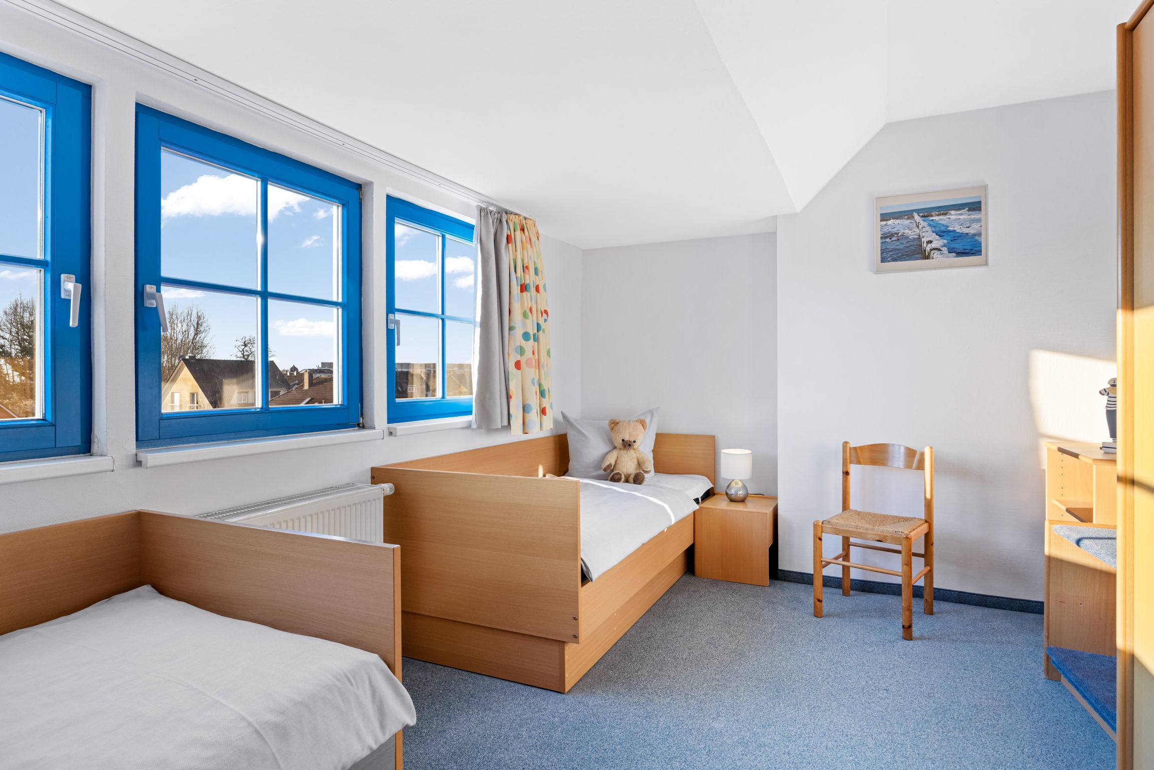 Im oberen Bereich der Wohnung: Schlafzimmer 2 mit 2 Einzelbetten und Kleiderschrank sowie Schlafzimmer 3 mit Doppelbett (1,80 x 2,00m) und Kleiderschrank. Alle Schlafzimmer verfügen über gute Verdunklungsmöglichkeiten.
