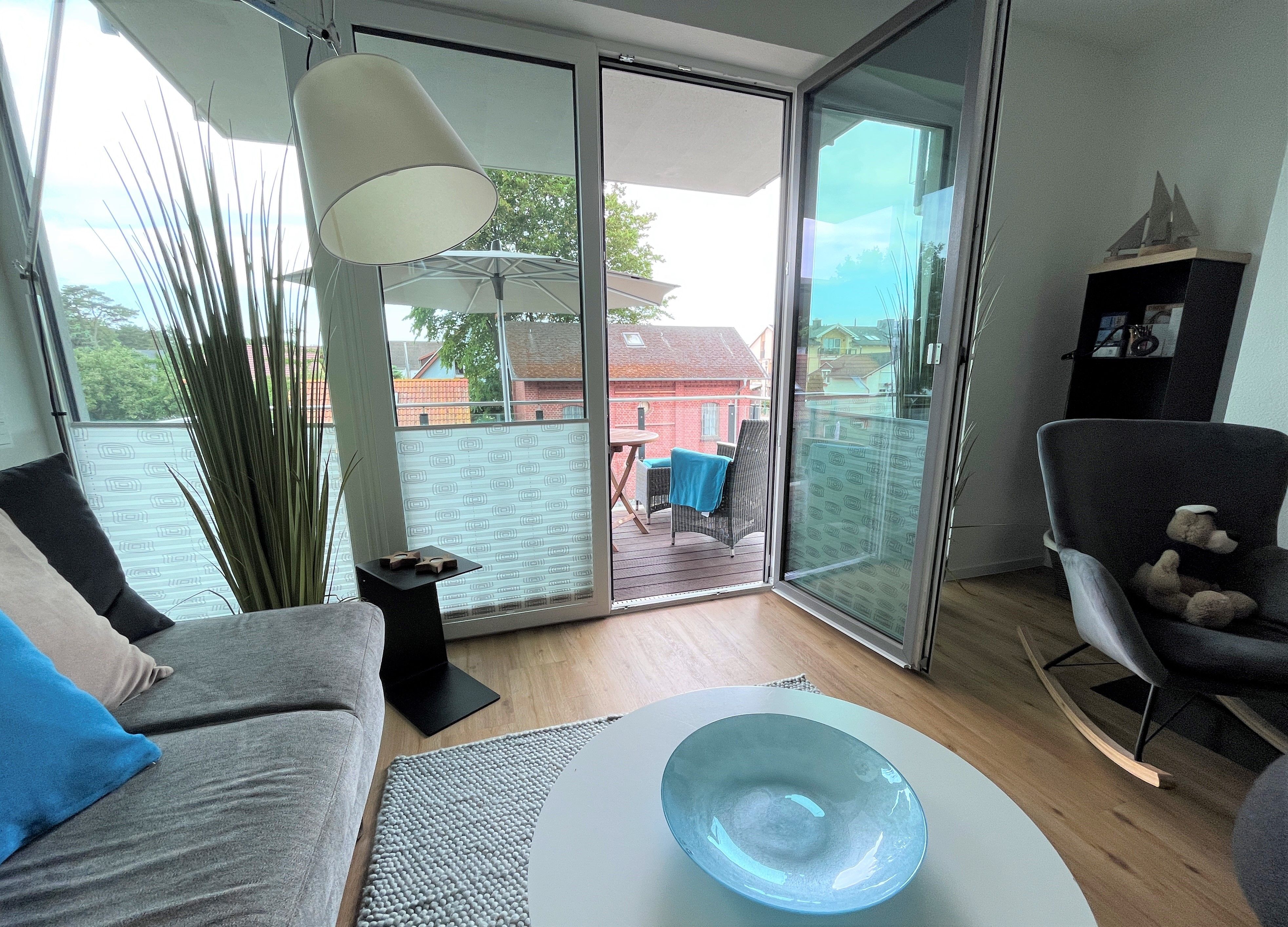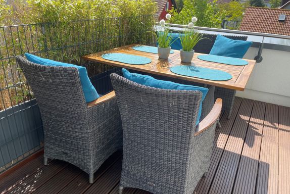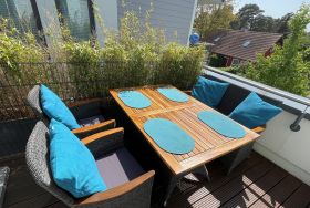 Die Wohnung verfügt über eine große Dachterrasse mit Strandkorb und einen Balkon mit Gartenmöbeln. Hier darf auch der Lotus-Grill zum Einsatz gebracht werden.