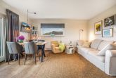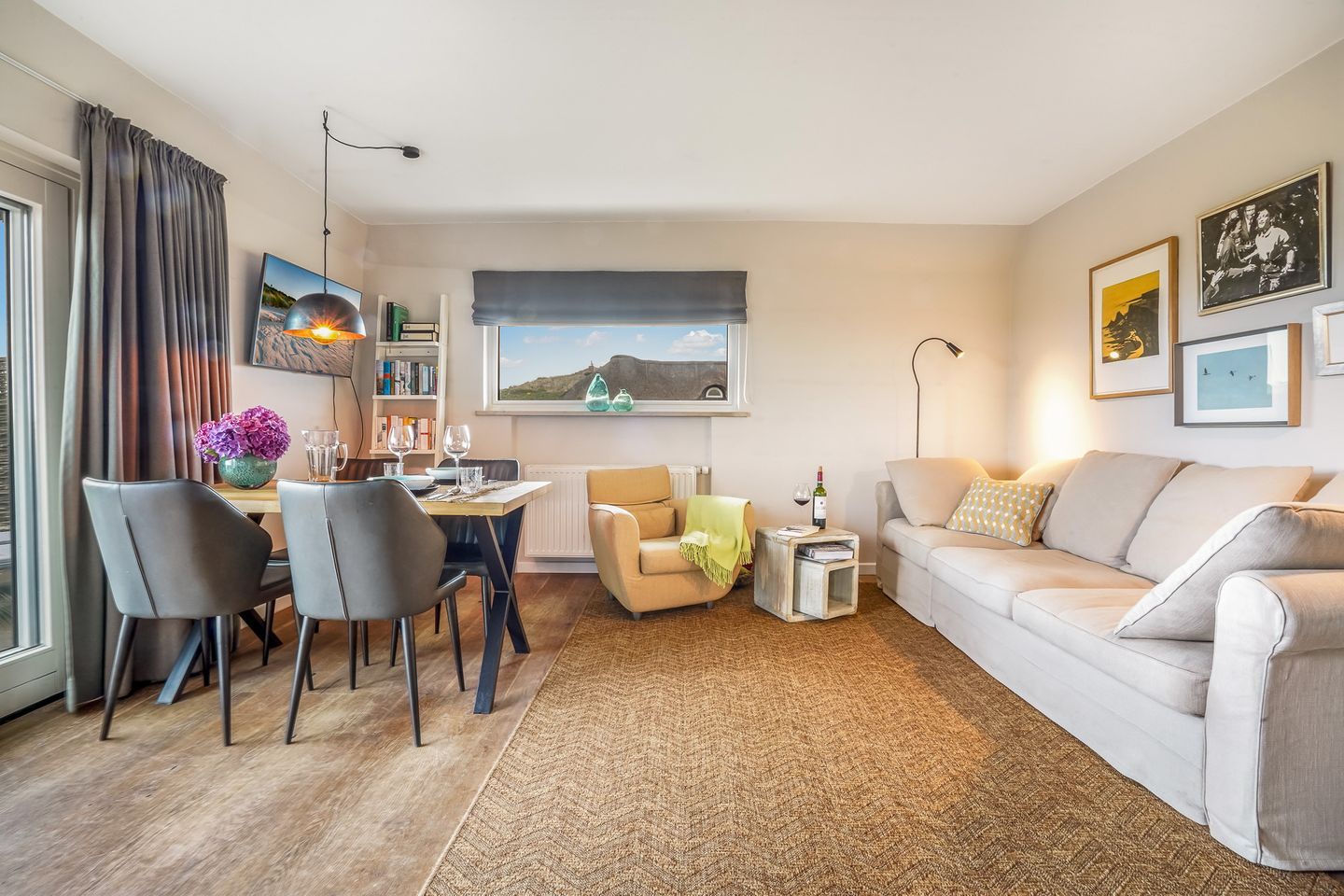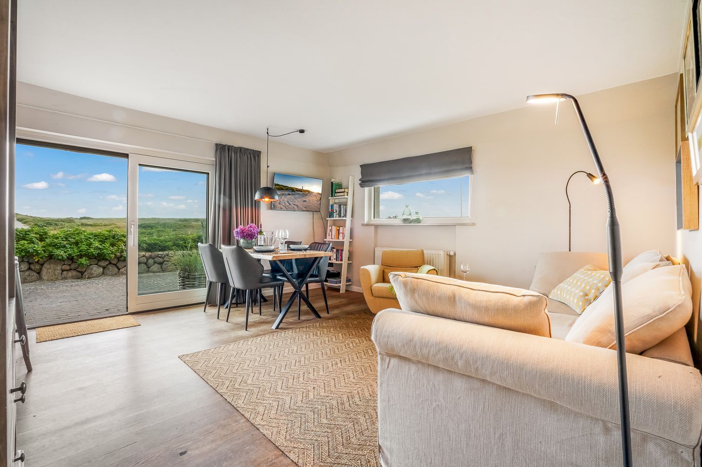 Genießen Sie Ihren Urlaub direkt am Strand. Der helle Wohnbereich mit einer gemütlichen Couch und einem Essbereich bietet Ihnen einen wundervollen Blick auf die Dünen und den Strandübergang.